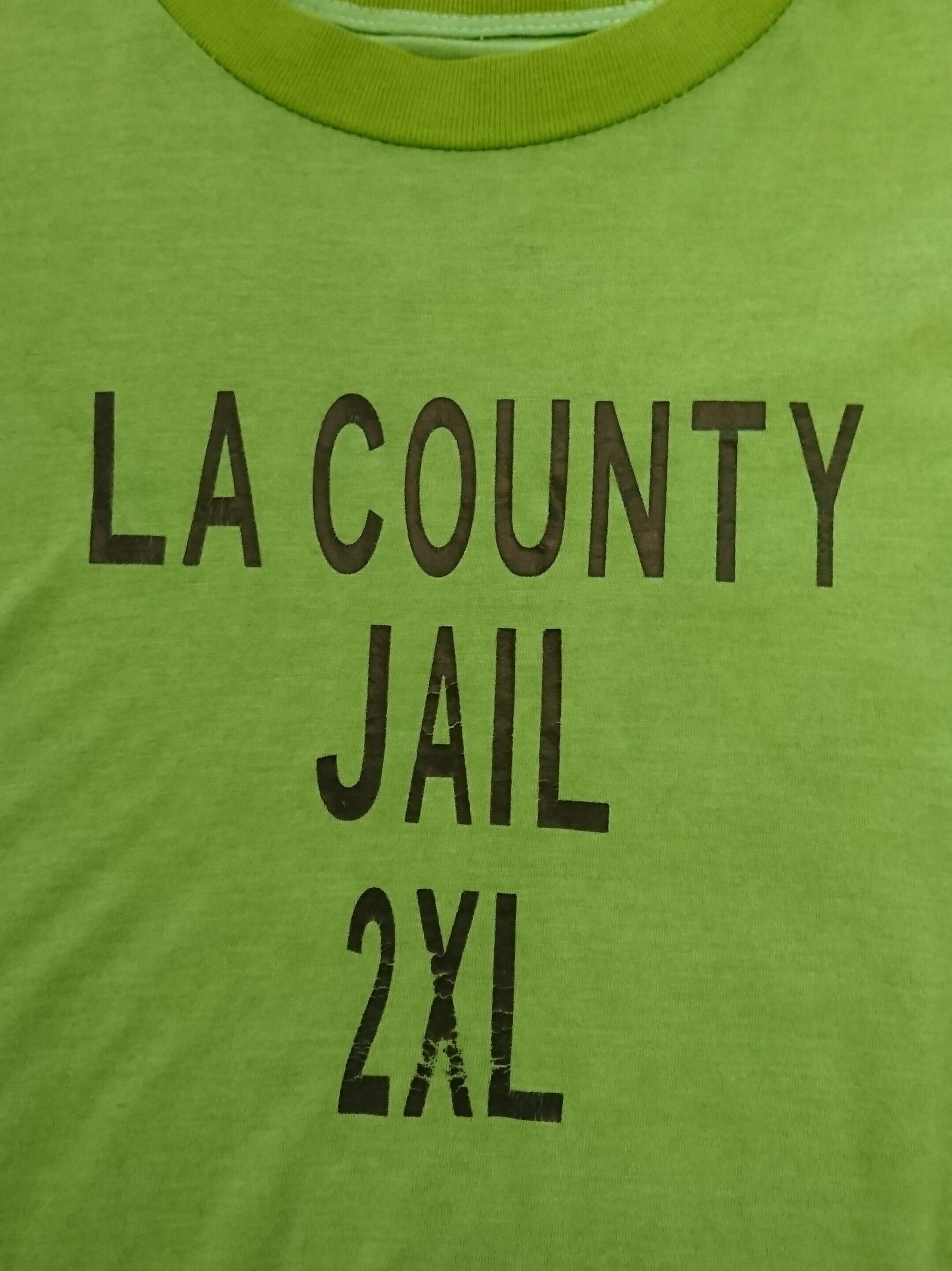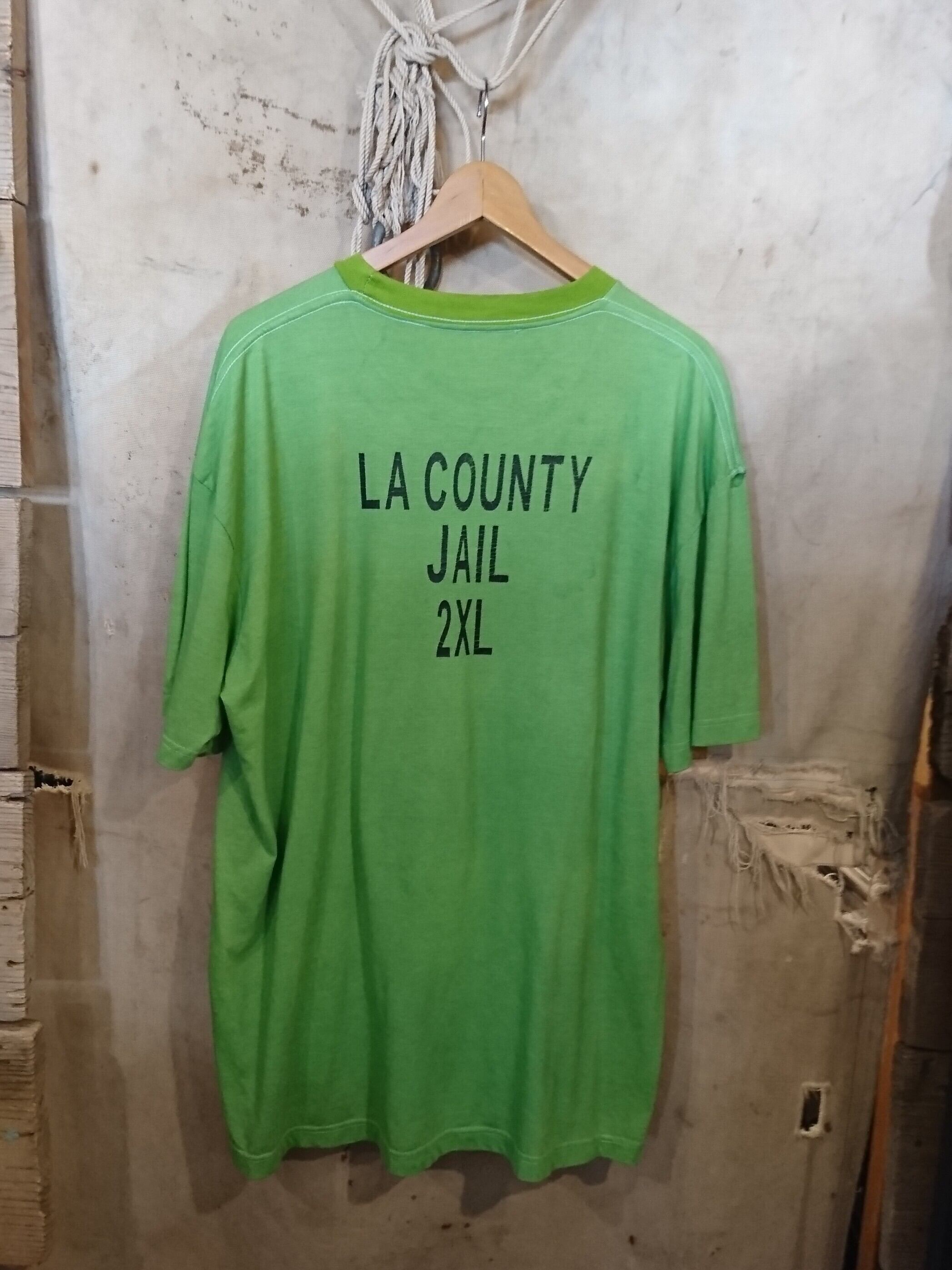 ロサンゼルス刑務所のTシャツの後染めになります。前後にLA COUNTY JAILとサイズがプリントされてます。後染めになるので多少染めの色ムラが