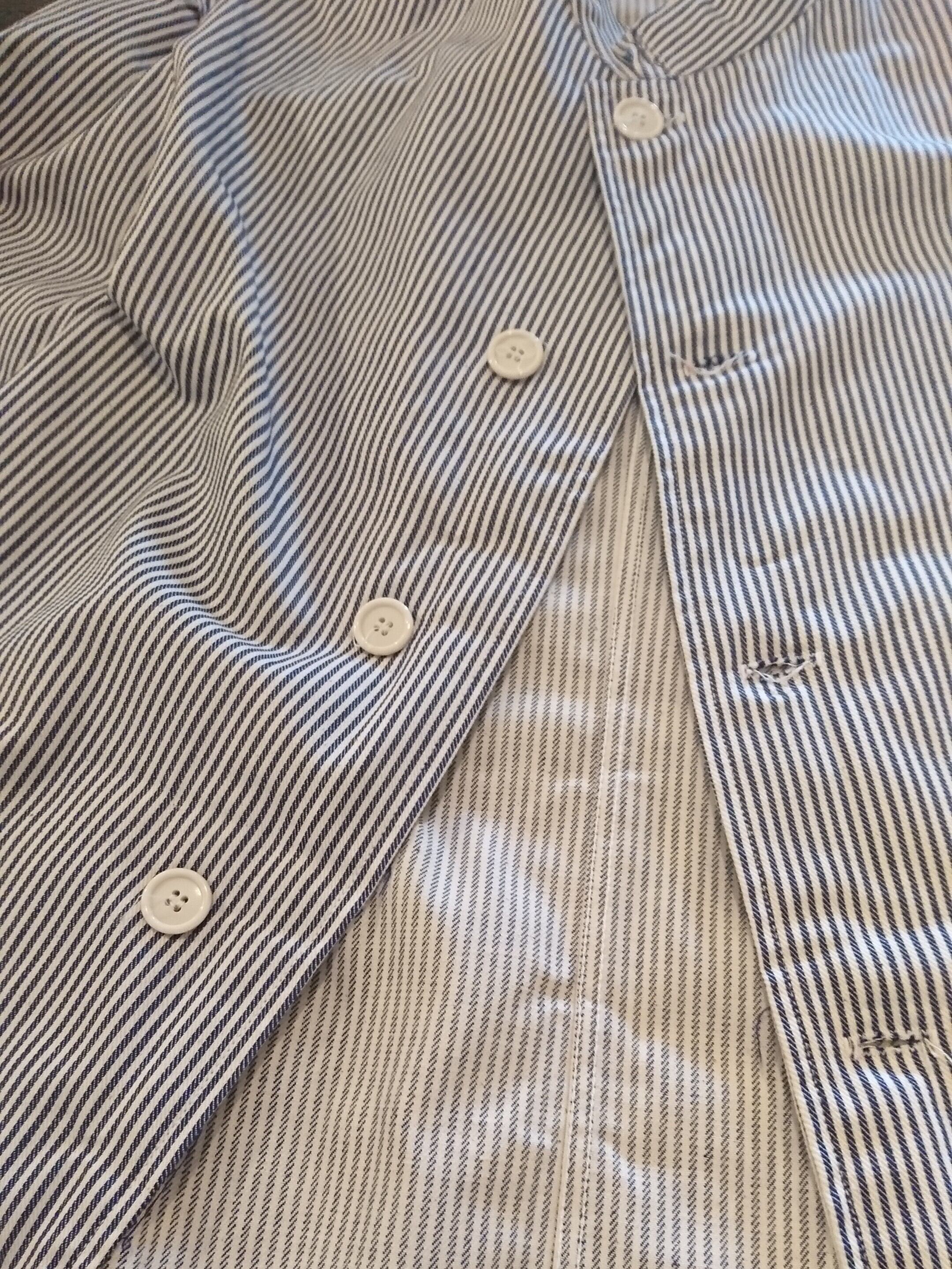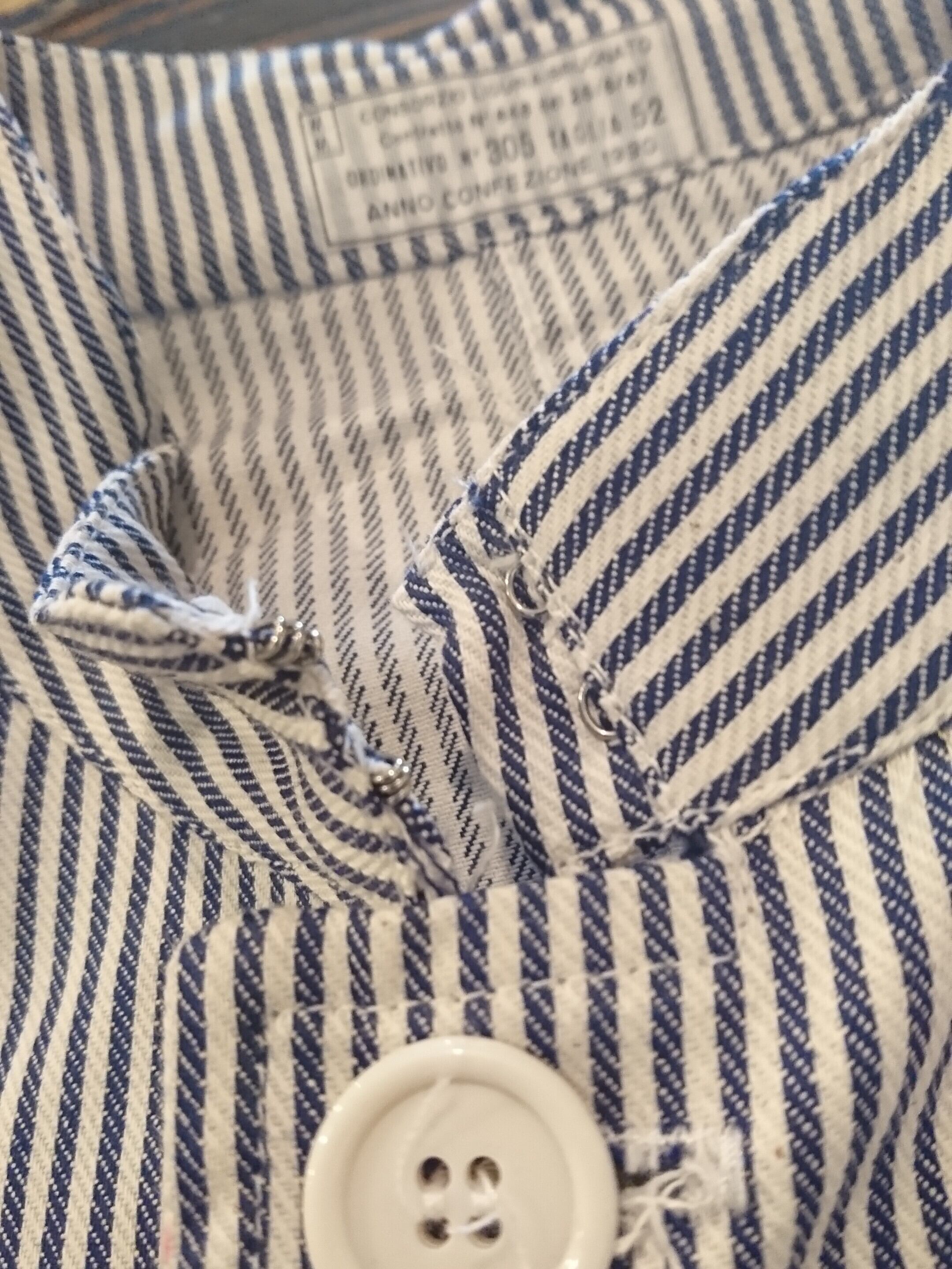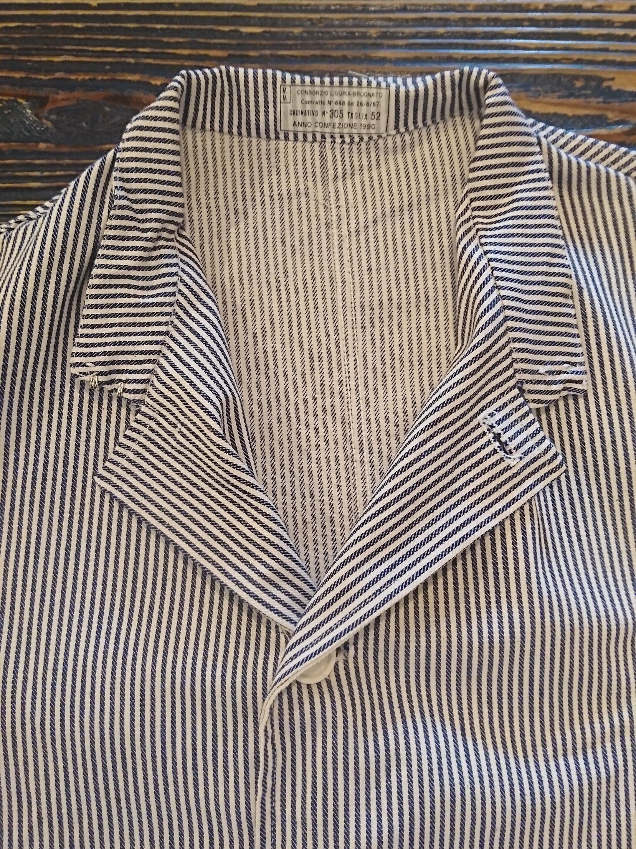 90年代 イタリア軍のヒッコリーストライプ コックジャケットになります。スタンドカラーでネック部分にはフックがつきます。襟はたたして着てもいいですし、ラペルのようにねかして着るのもオススメ。シルエットもワークジャケットと特有の