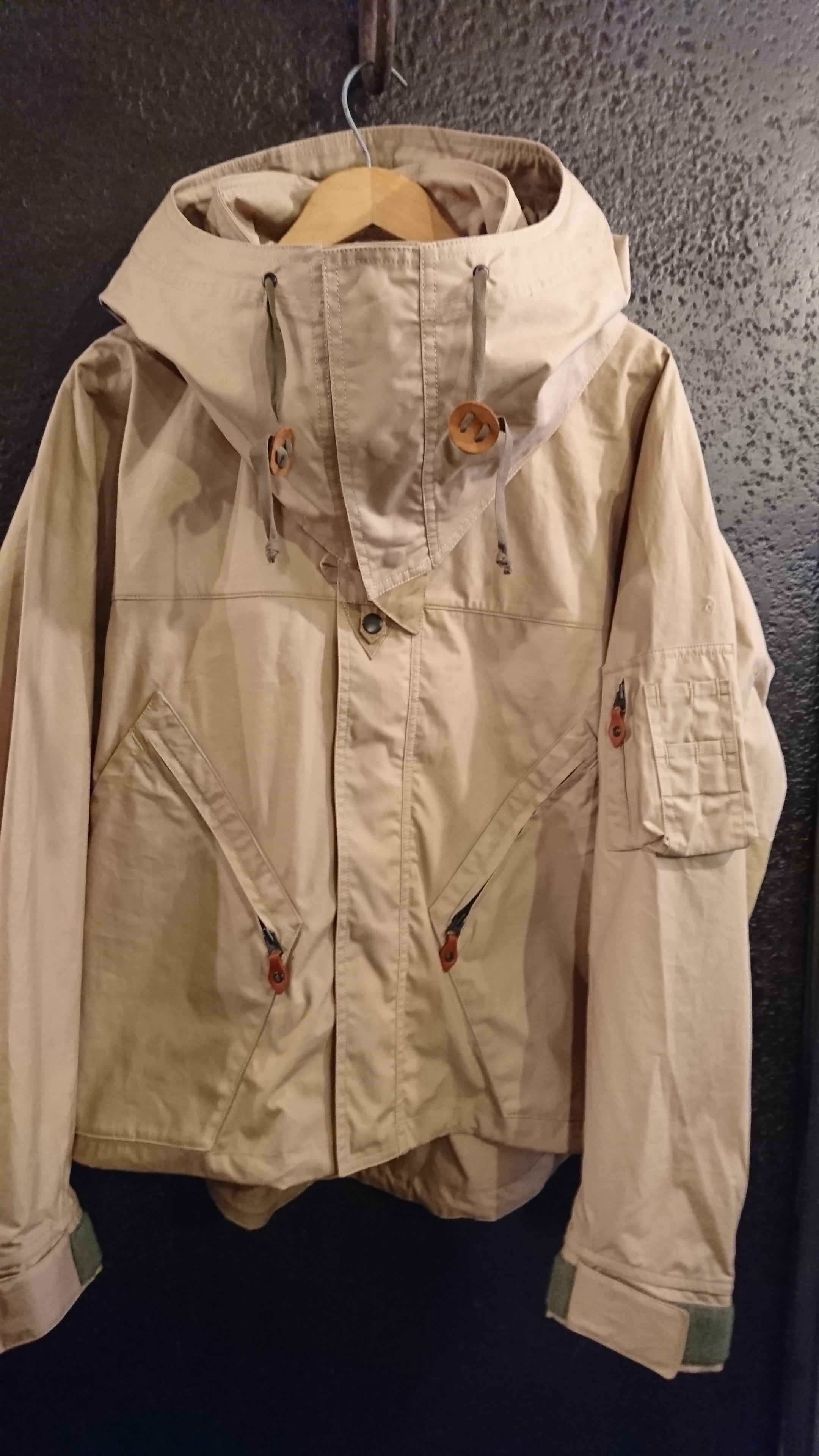 ミリタリーのテストサンプルのディテールを参考にオリジナルで設計から考えたフロントポケットやトライアングルタブでより簡易的に視認出来る様にした脱着可能なフードパーツや磨耗しやすい