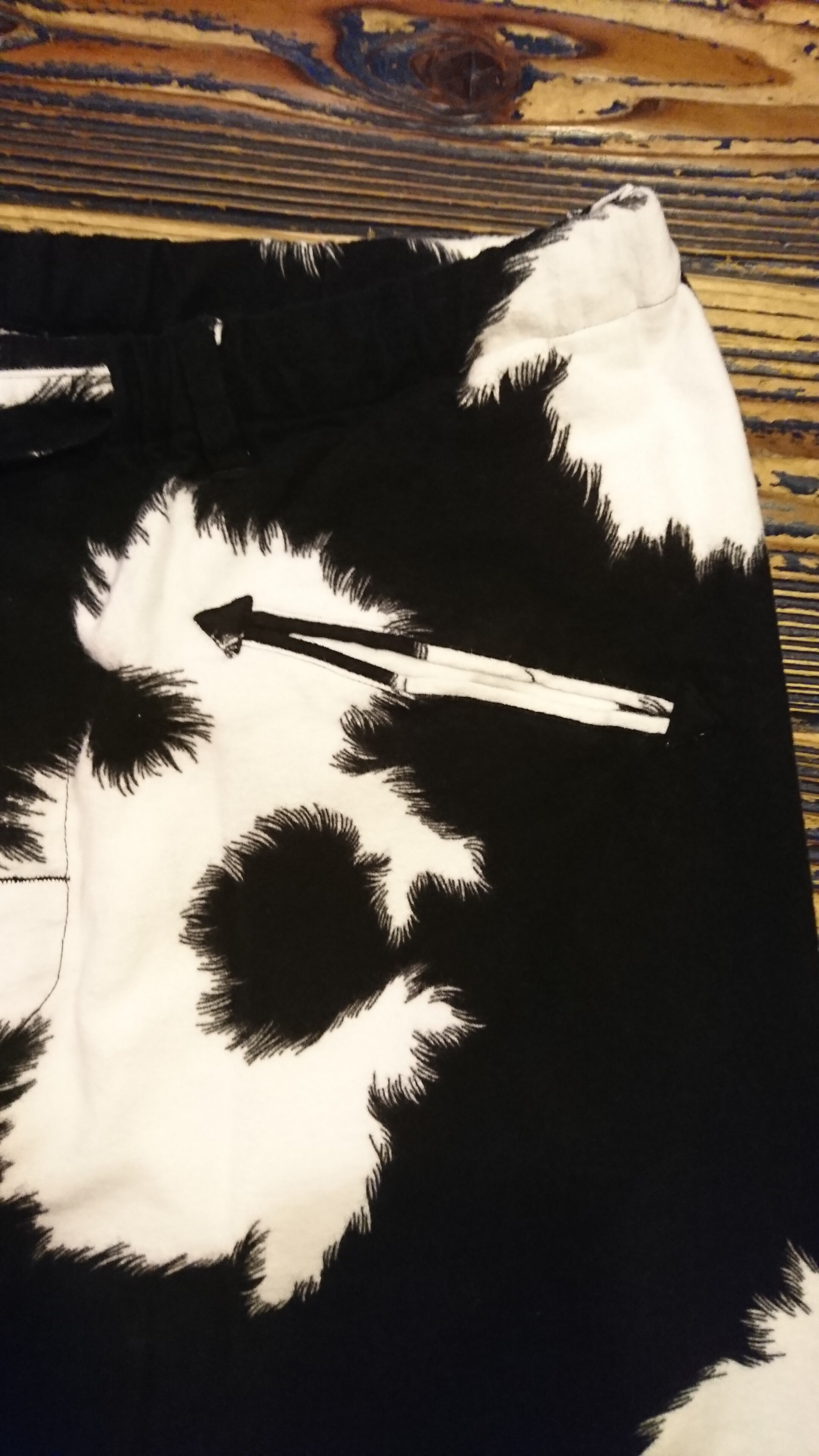 違うところにもアンテナが向く。この一年で、かなり気になる70年代カルチャーとファッション。70sスタイルそのままにはならないのがBOWWOW。フロントのポケットはウエスタンシャツで見られる矢の様な形になったアローポケット。ヒップポケットはフラップ仕様。腰には紐が入っており絞って穿く事が可能。ベルトループもついてるのも有難いです。フロントはスナップボタン使用。シャツとは違いパンツはスタイリッシュなシルエット。生地はホルスタイン柄の起毛ネル生地。50~60年代に生み出された柄だが、70年代にまで愛された名柄でここまで年代を渡って愛された柄も少ないのではないでしょうか。そのホルスタイン柄をアップデートし、生まれ変わった柄はヴィンテージで見られるホルスタイン柄とは一変しブリーチのような全く違う印象にも感じます。今回、同柄でビッグサイズのウエスタンシャツもリリース。