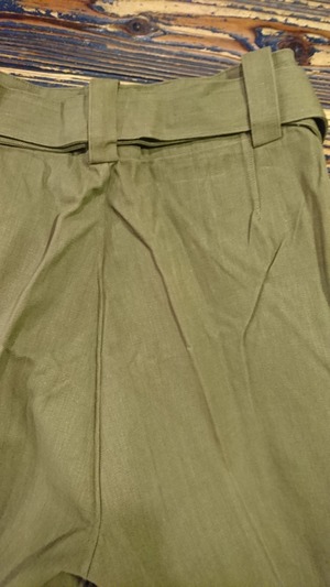 腰にはベルトが付いてるのでサイズ調整が可能。基本オーバーパンツの為、中のパンツにアクセスできるスルーホールが付きますがそこを塞ぎ普通にも穿いていただけるようにしてます。ガシッとしたコットン生地でダブルニーになっております。裾にもストラップがついていて裾の広がりをしめることもできます。ワイドシルエットのパンツをお探しの方にもオススメです。