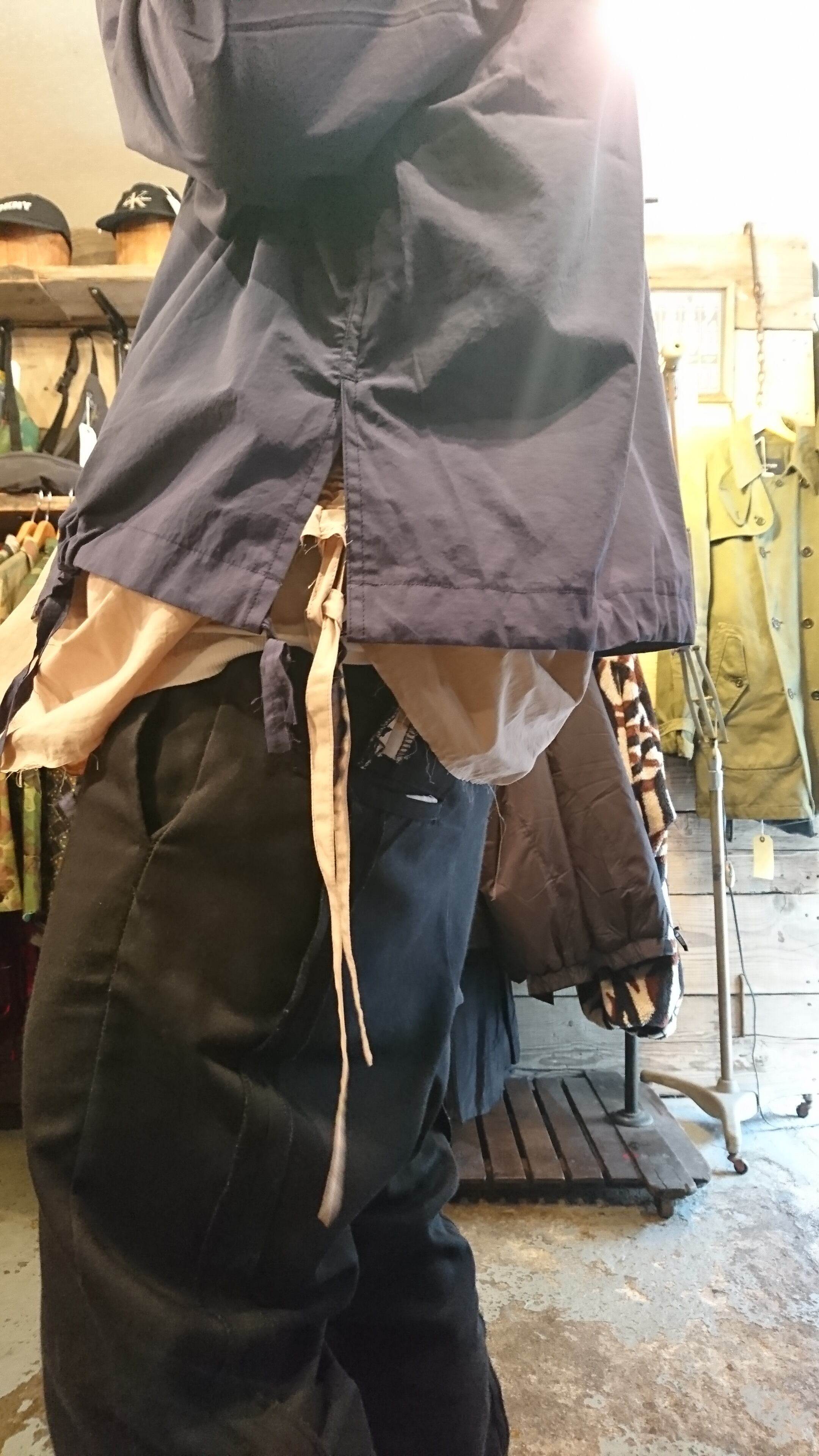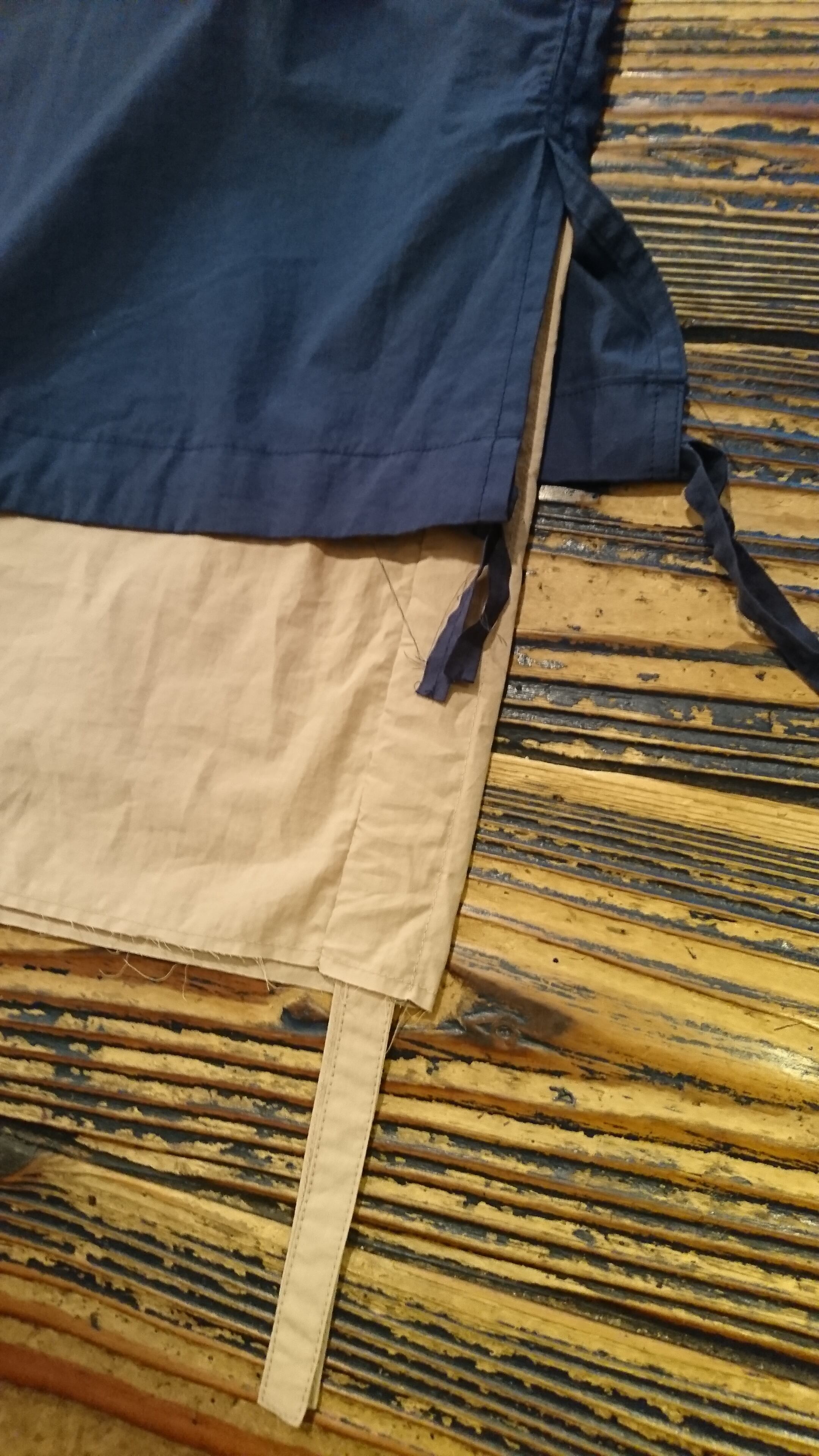 表地には80/-の強撚糸のタイプライター生地を使用。上側、下側それぞれの共地テープを絞る事で