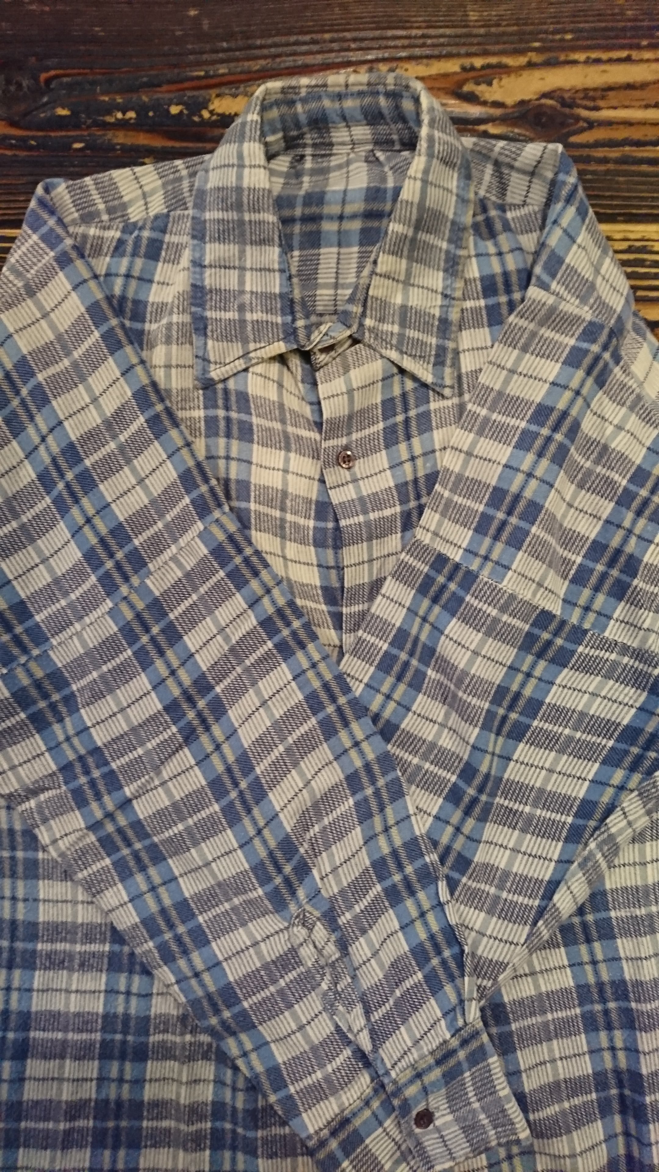 ネル生地。両袖が肩から16㎝ほどのところで内側から摘まんで縫われています。縫い目をほどけば袖丈は長くなりますが、あえてこのままで着てもらって男前な1着。着用感はありますがその他のコンディションは良いほうかと。女性の方にもオススメしたいファーマーシャツ。サイズが合う方いかがでしょうか。