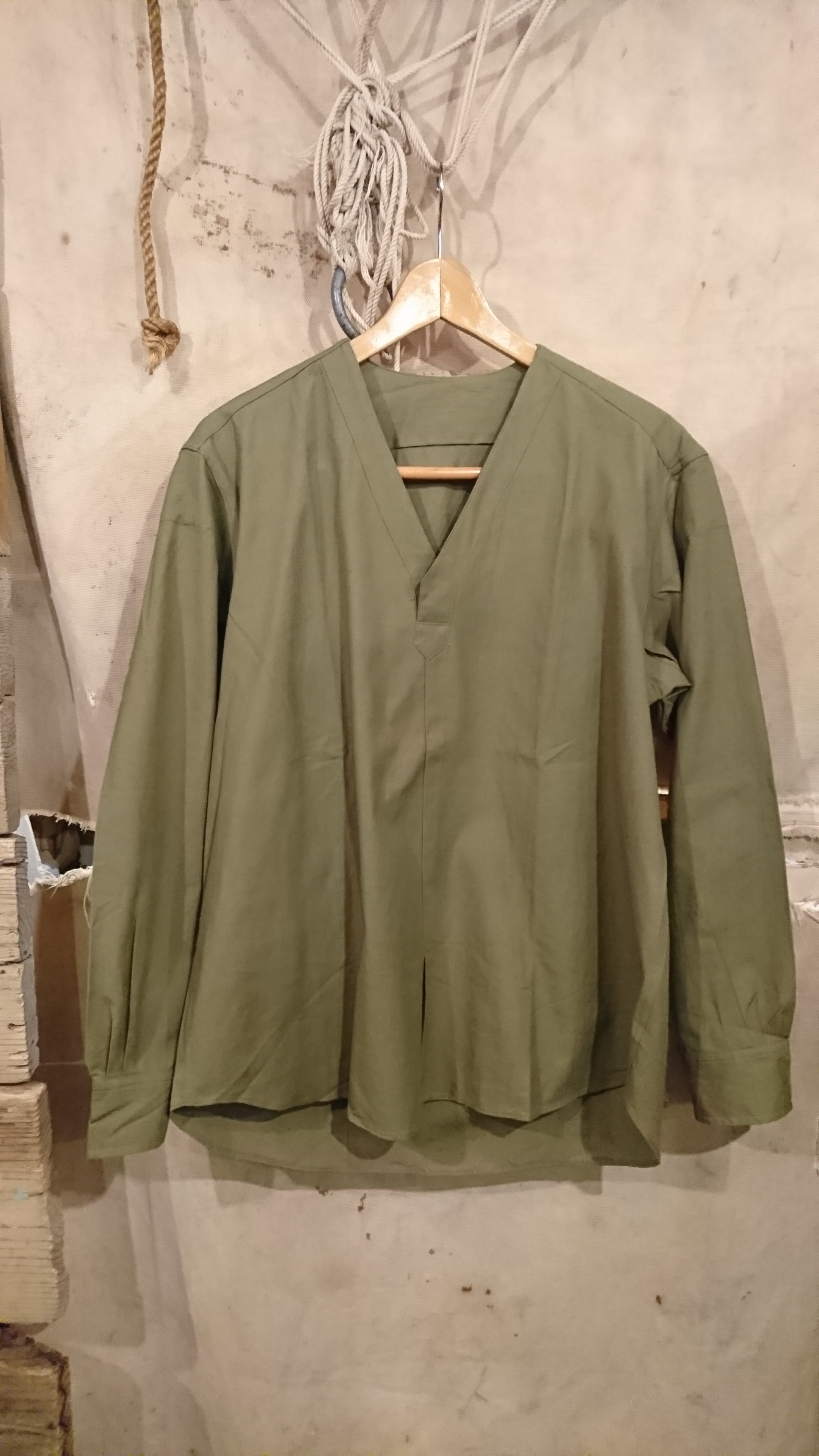 背中のヨーク下には両サイドにタックが入ります。カラーはオリーブ。デッドストックの商品になります。