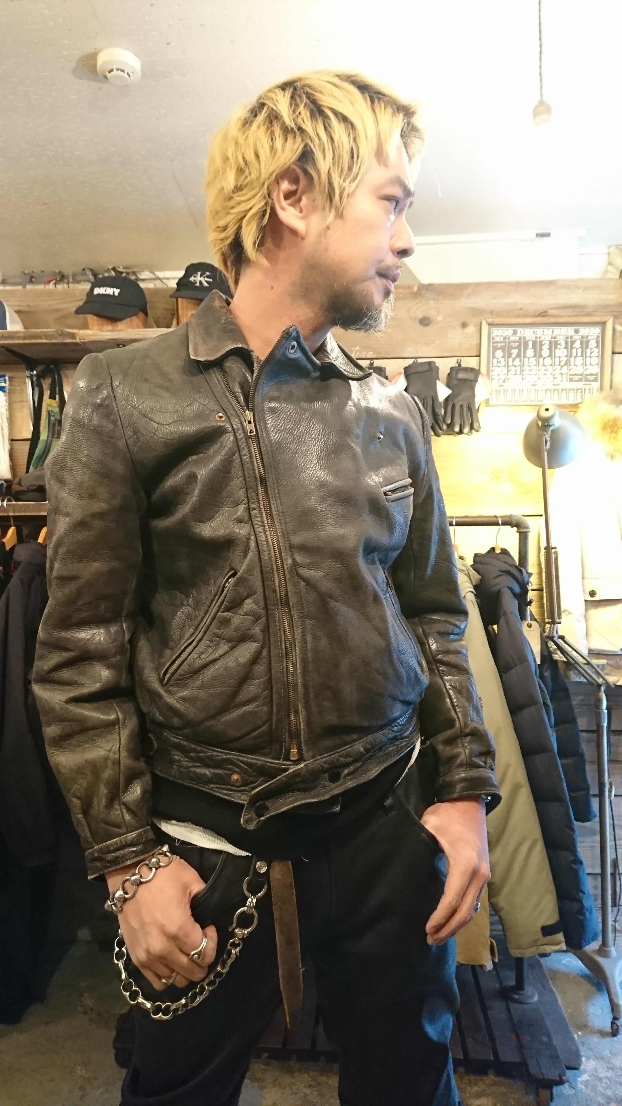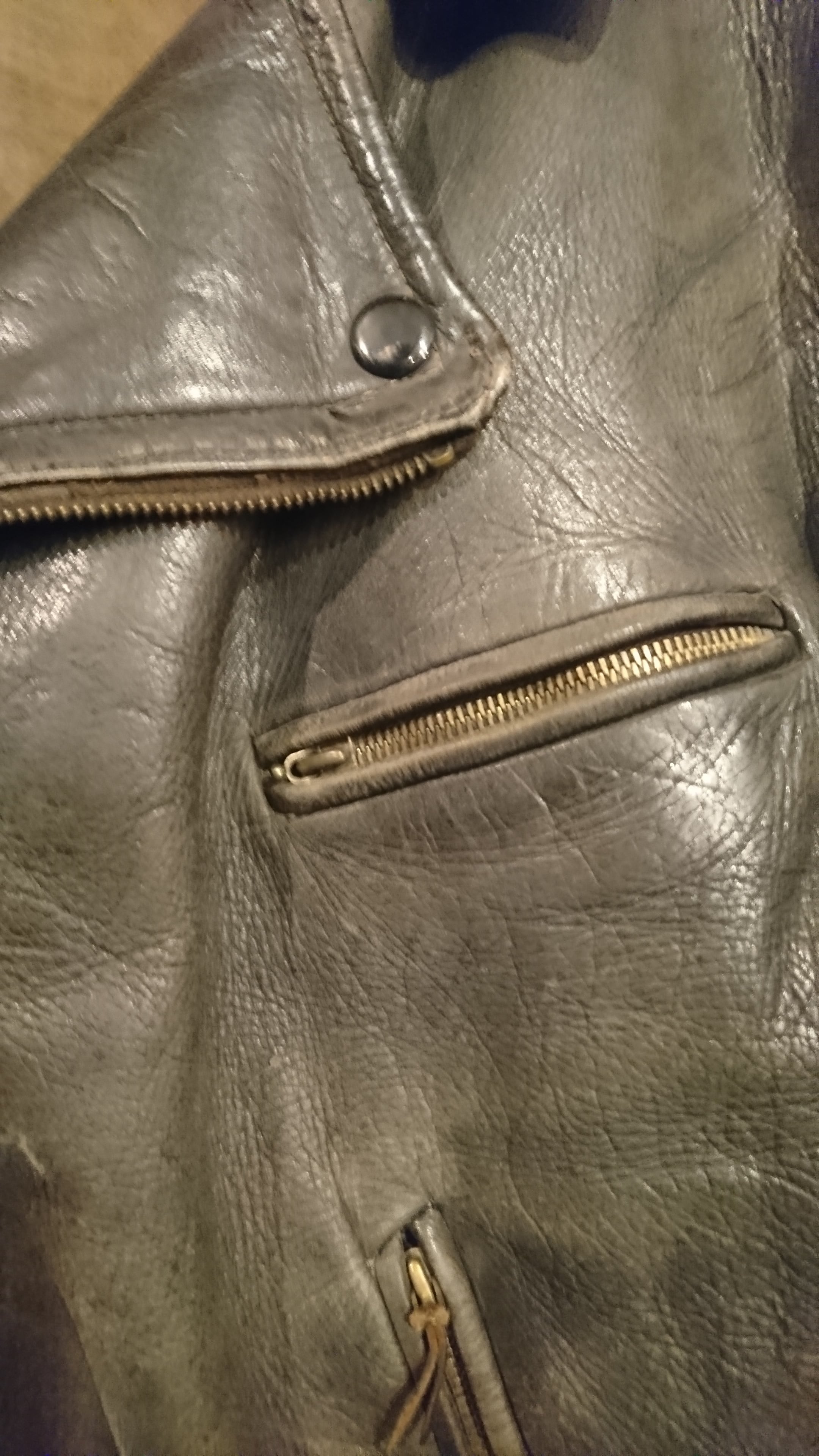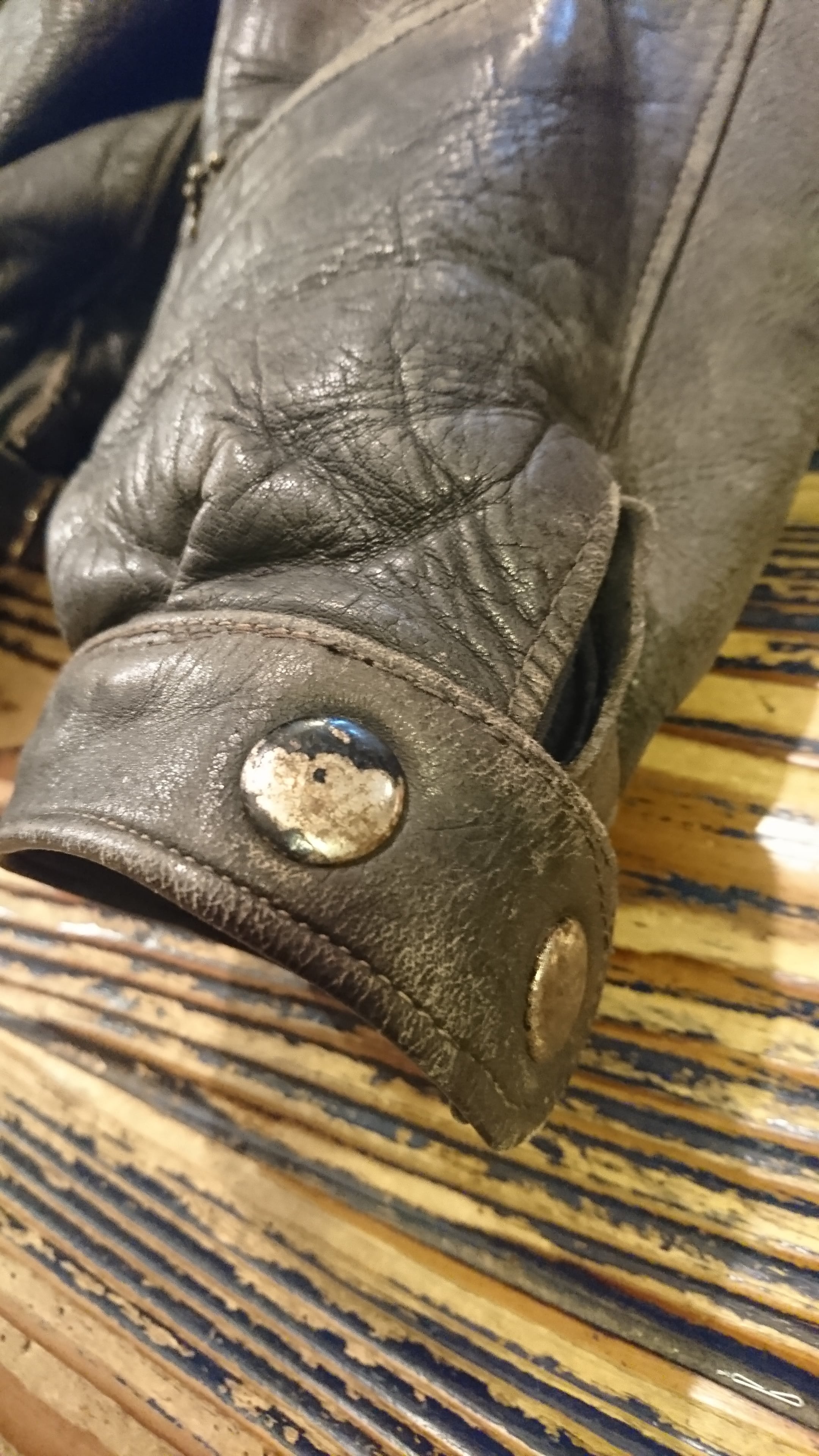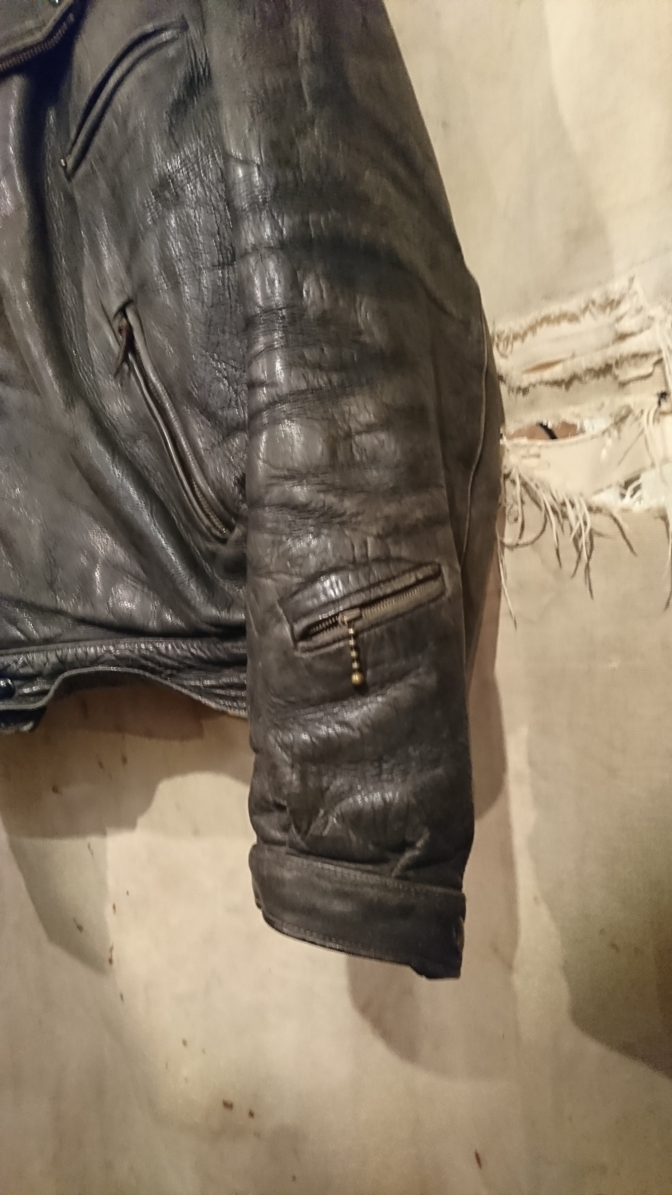 交換されてますが古いコの字留めのZPPジッパーがついてます。フロント裾と袖口はスナップでとめる仕様。レザーはステア(牛革)で裏地はネル生地になります。着込まれたこの雰囲気は男前すぎる1着。良い意味でどんくさく、メゾンブランドが手掛けそうなモードな匂いも感じれるレザージャケットと思います。
