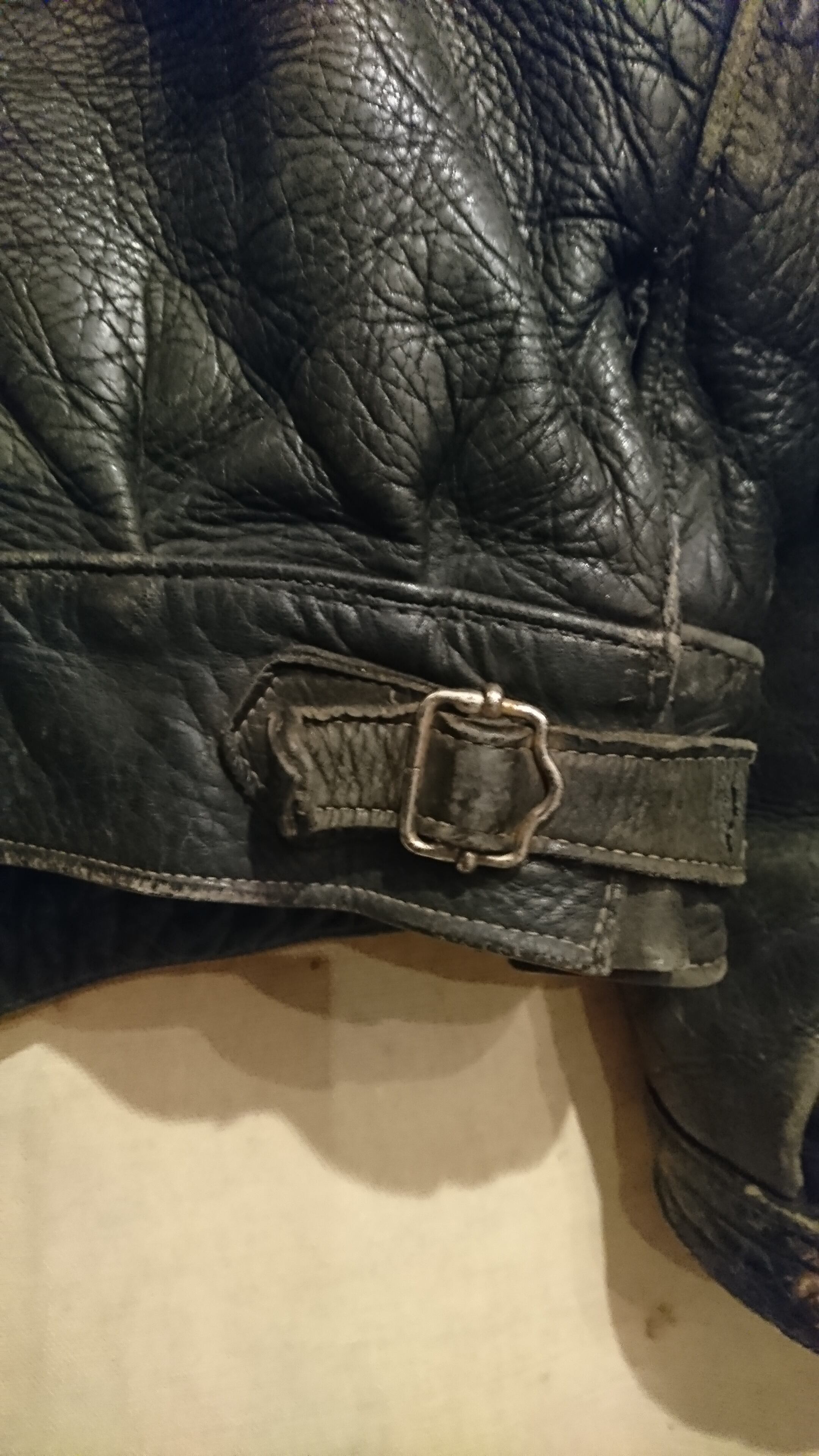 50年代 ドイツ製のダブルライダースジャケットになります。アメリカとイギリスのライダースジャケットを合わせたようなディテールをもつレザージャケット。胸元につくボールチェーンの上部分が欠損(左袖につくボールチェーンと同様の物が