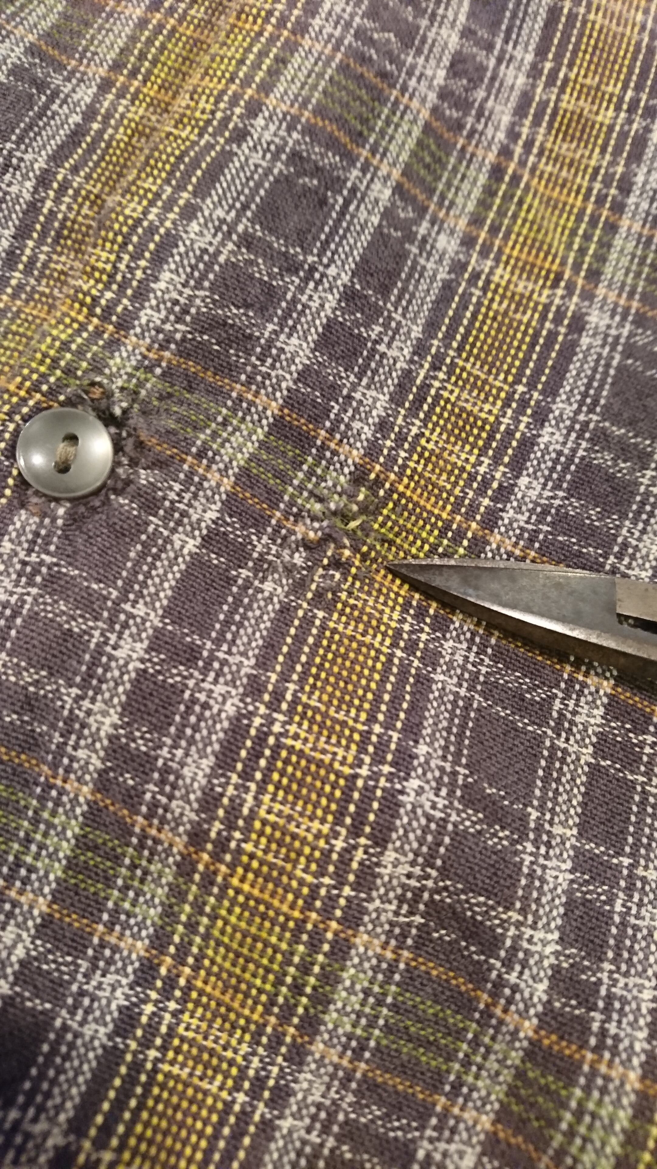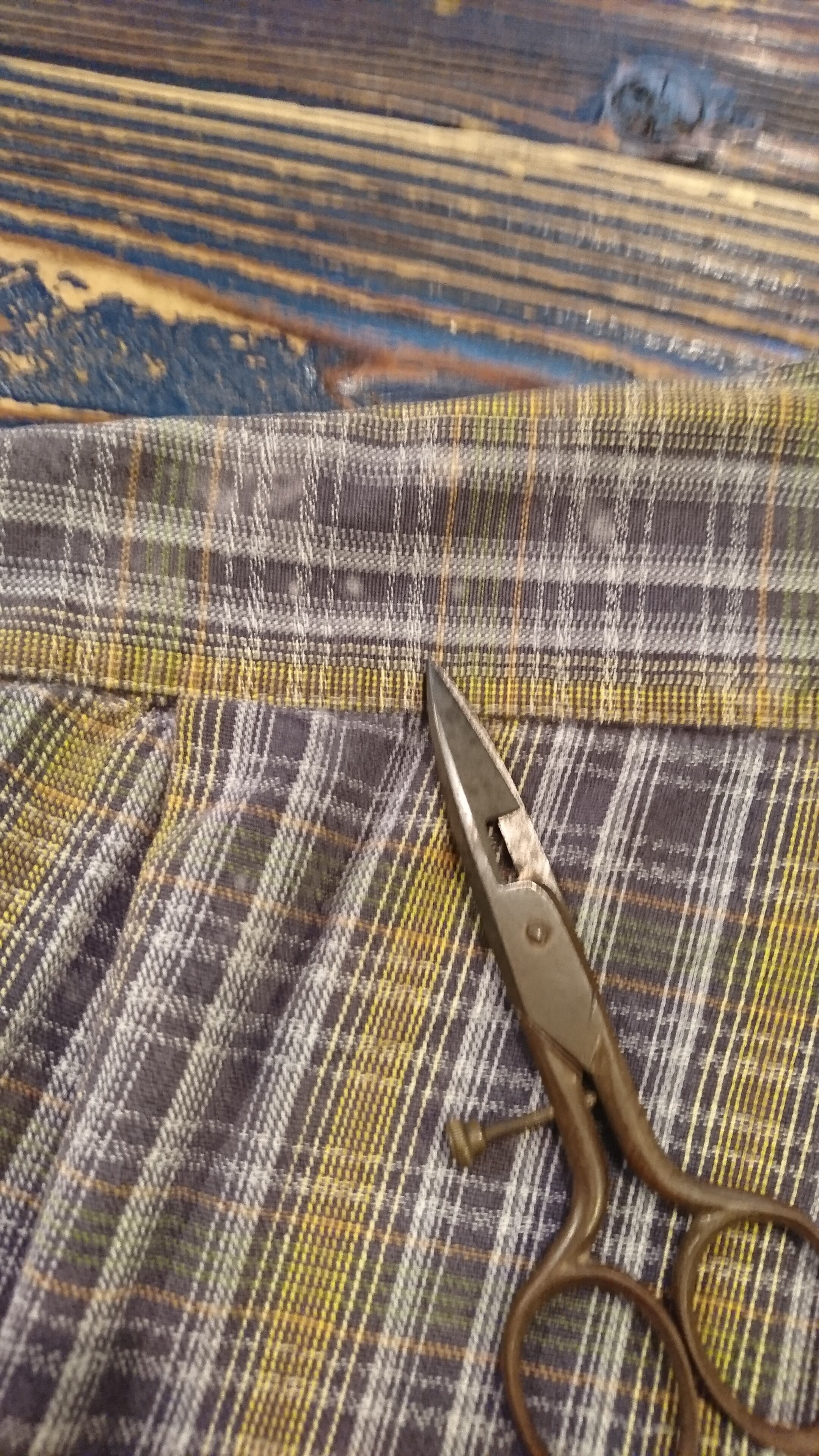 になります。ファーマー『農業従事者』が着用していたもので、グランドファザーシャツ、グランパシャツとも呼ばれています。チェックのコットン生地。衿部分、フロントボタン横に手縫いのリペアも雰囲気あって格好良い1着。他、左袖口にスレと左肩後ろにうっすらと染みがありますが着用に問題はありません。