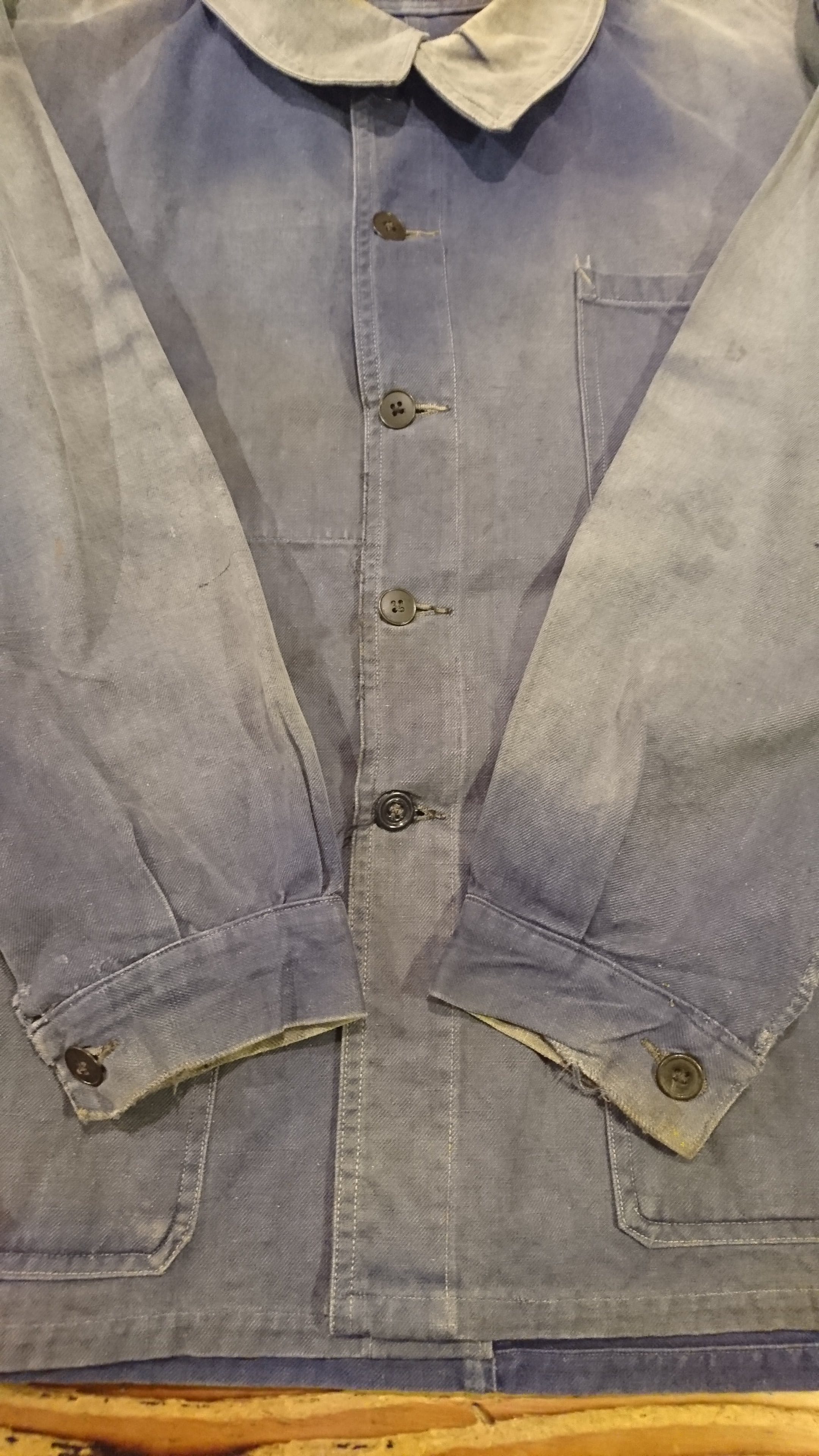 50年代 フレンチワークコットンツイルのカバーオールになります。モールスキン生地とはまた違った雰囲気をもつコットンツイル生地。フレンチインクブルーのもつ紫がかった色目。天然素材ゆえの経年変化。このジャケットの色褪せは男前すぎます。サイズ感も大きめなのでざっくり着ていただけると思います。フレンチワークの持つ雰囲気はアメリカ物のワークアイテムとはまた違う格好良さプラス上品さすら感じれます。色々なスタイルにはめて頂きたいジャケットです。