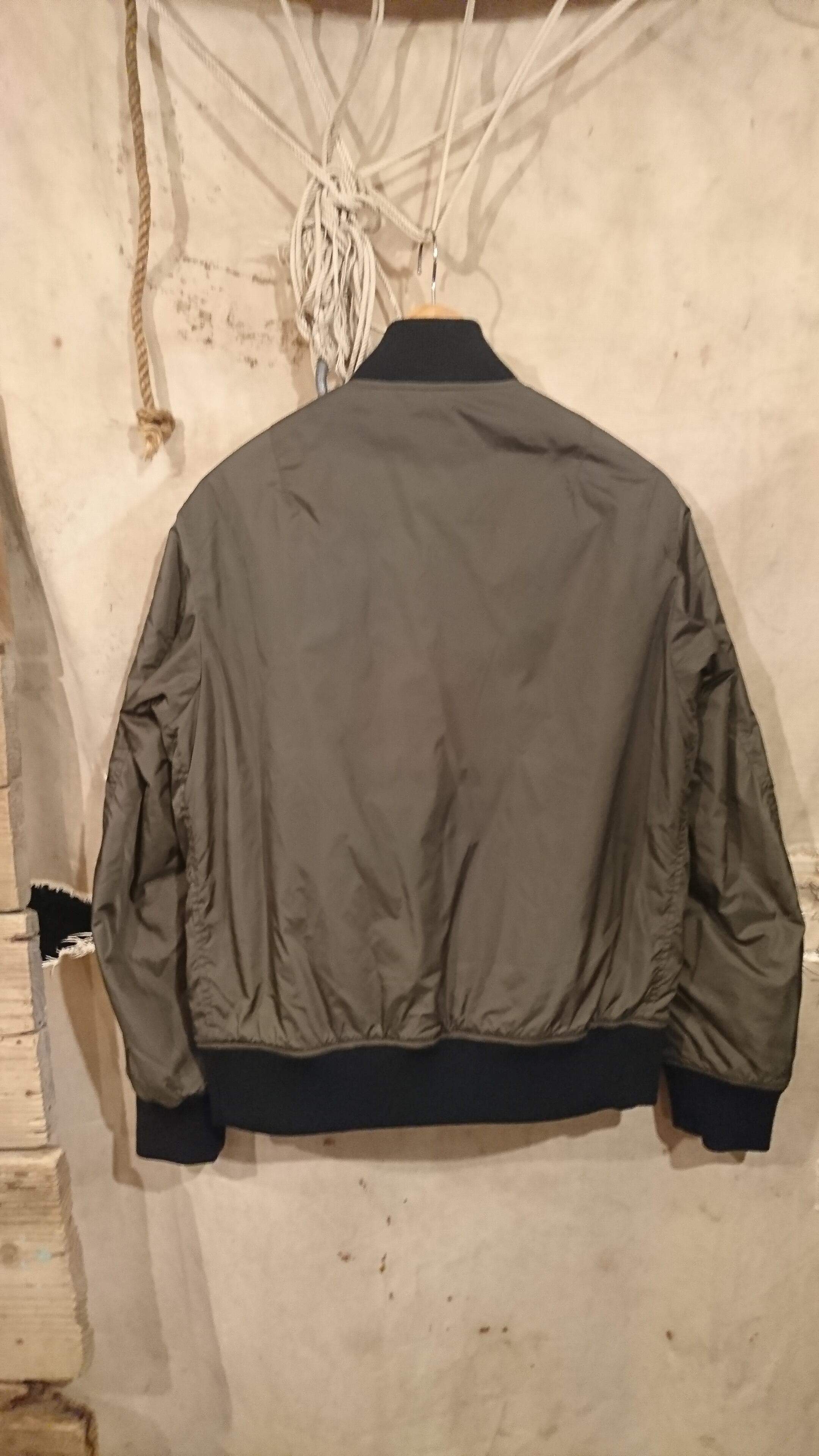 裏面はMA-1のような見た目。フロントはダブルジッパーの回転式。ルーズなシルエットではないのでジャストで着て頂きたいジャケットです。モードなスタイルにもハマる1着です。