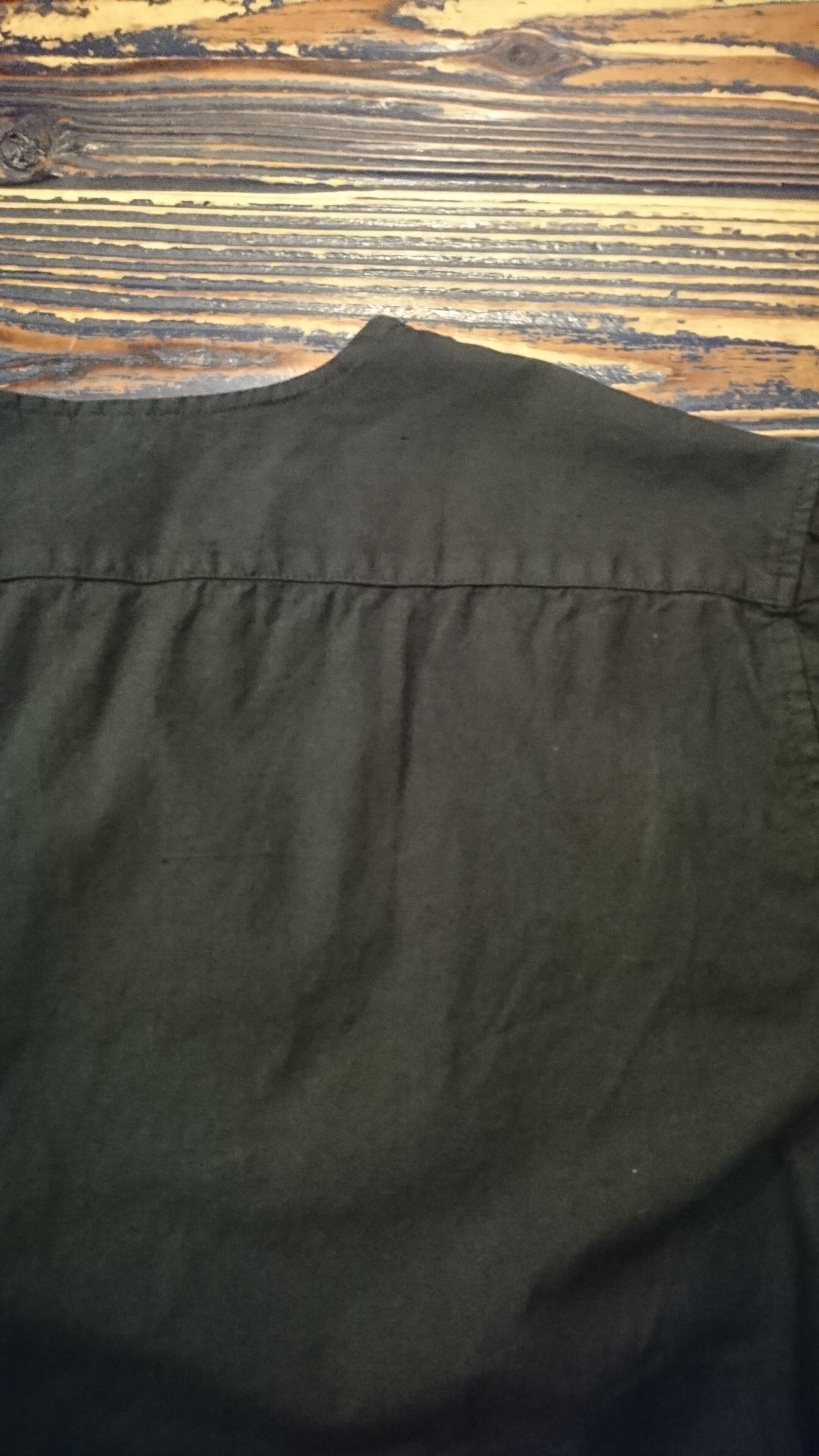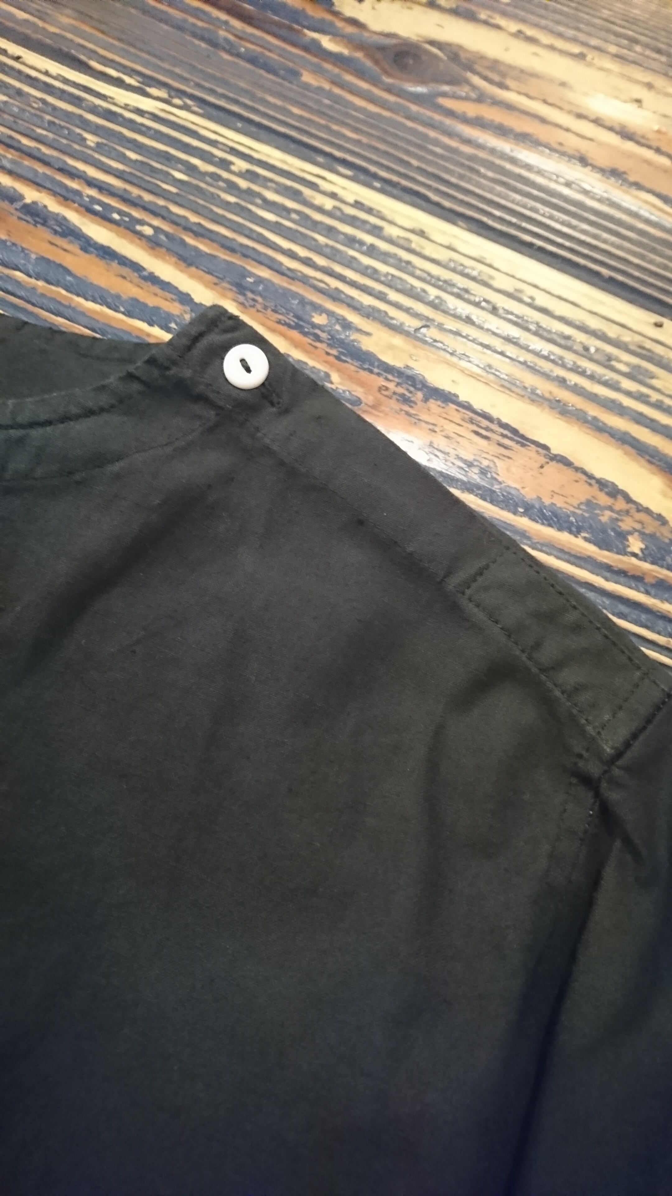 クルーネックタイプで左肩部分にボタンがつきスリットが入ってるので脱ぎ着しやすくなってます。袖にはカフスが付きます。無駄を削ぎおとしたシンプルなデザイン。色々なスタイルに使っていただきたいシャツです。