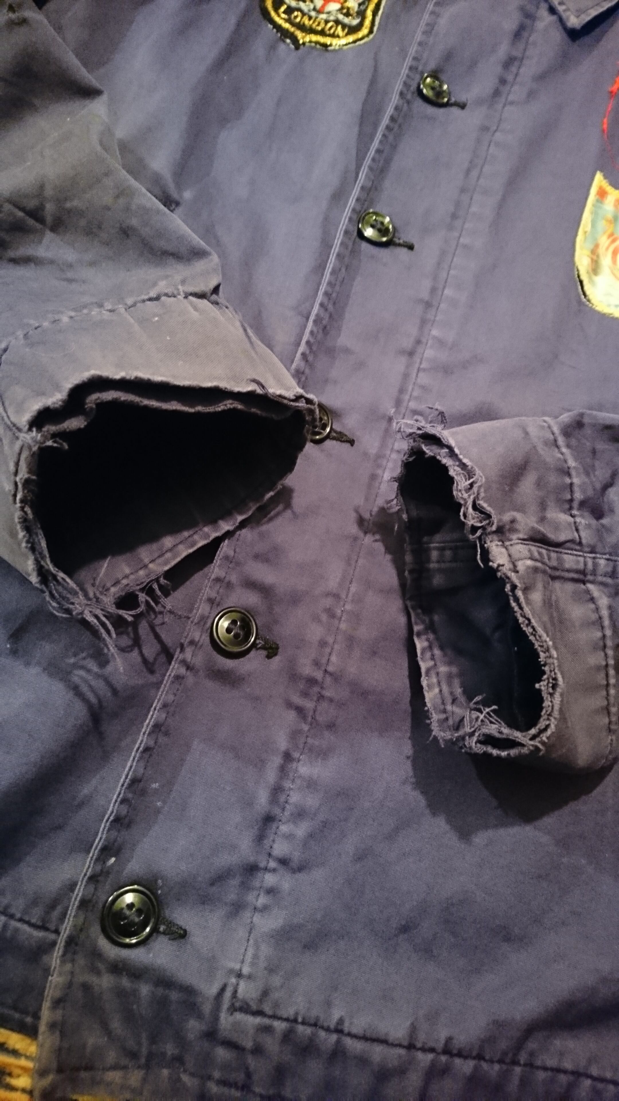 ヨーロッパ等に訪れたことで当時の乗組員がノルウェー、フランス、ドイツ等各地のワッペンも記念としつけたものと推測できます。所々ペンキが飛んでるのと袖口に傷ありますが着用に問題はなく、雰囲気ある1着。サイズは36REG。サイズが合う方いかがでしょうか。