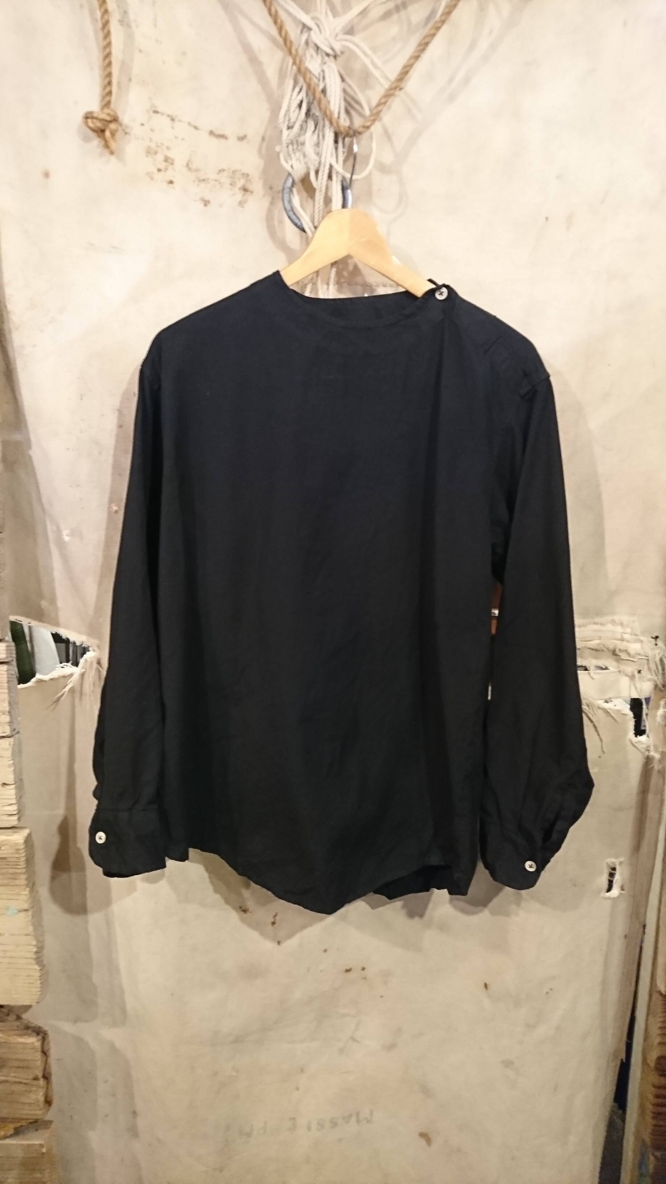 クルーネックタイプで左肩部分にボタンがつきスリットが入ってるので脱ぎ着しやすくなってます。袖にはカフスが付きます。無駄を削ぎおとしたシンプルなデザイン。色々なスタイルに使っていただきたいシャツです。