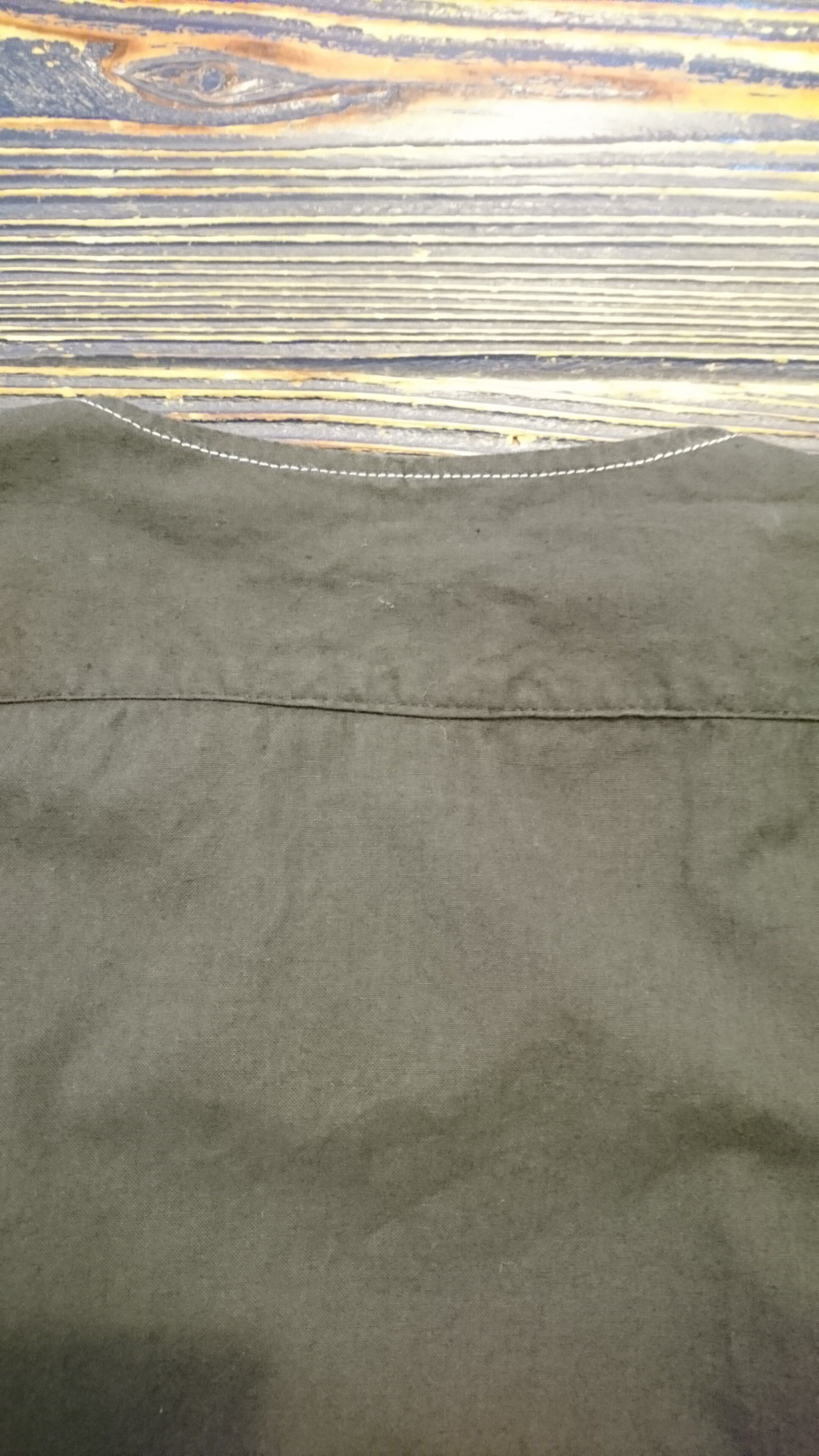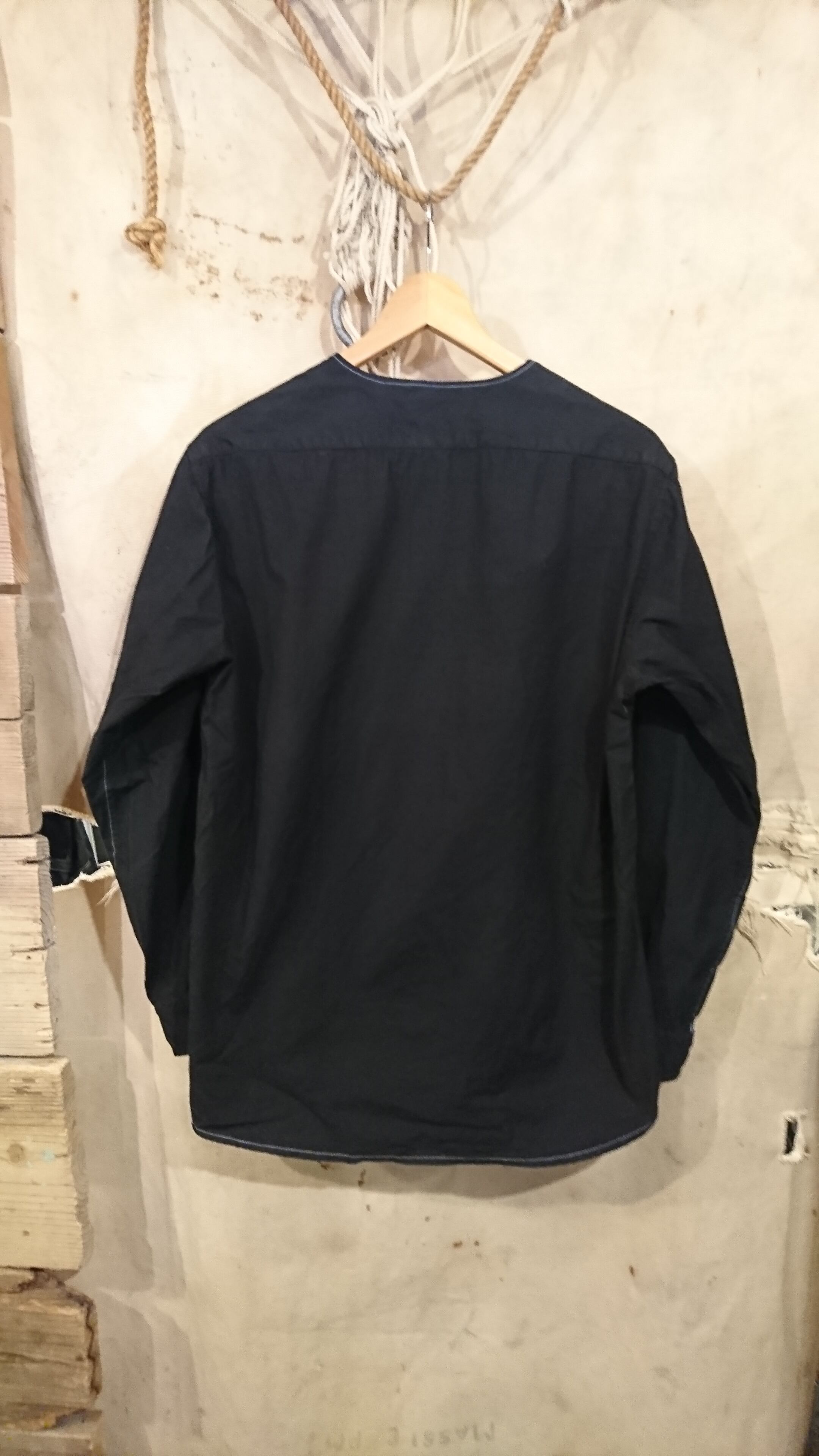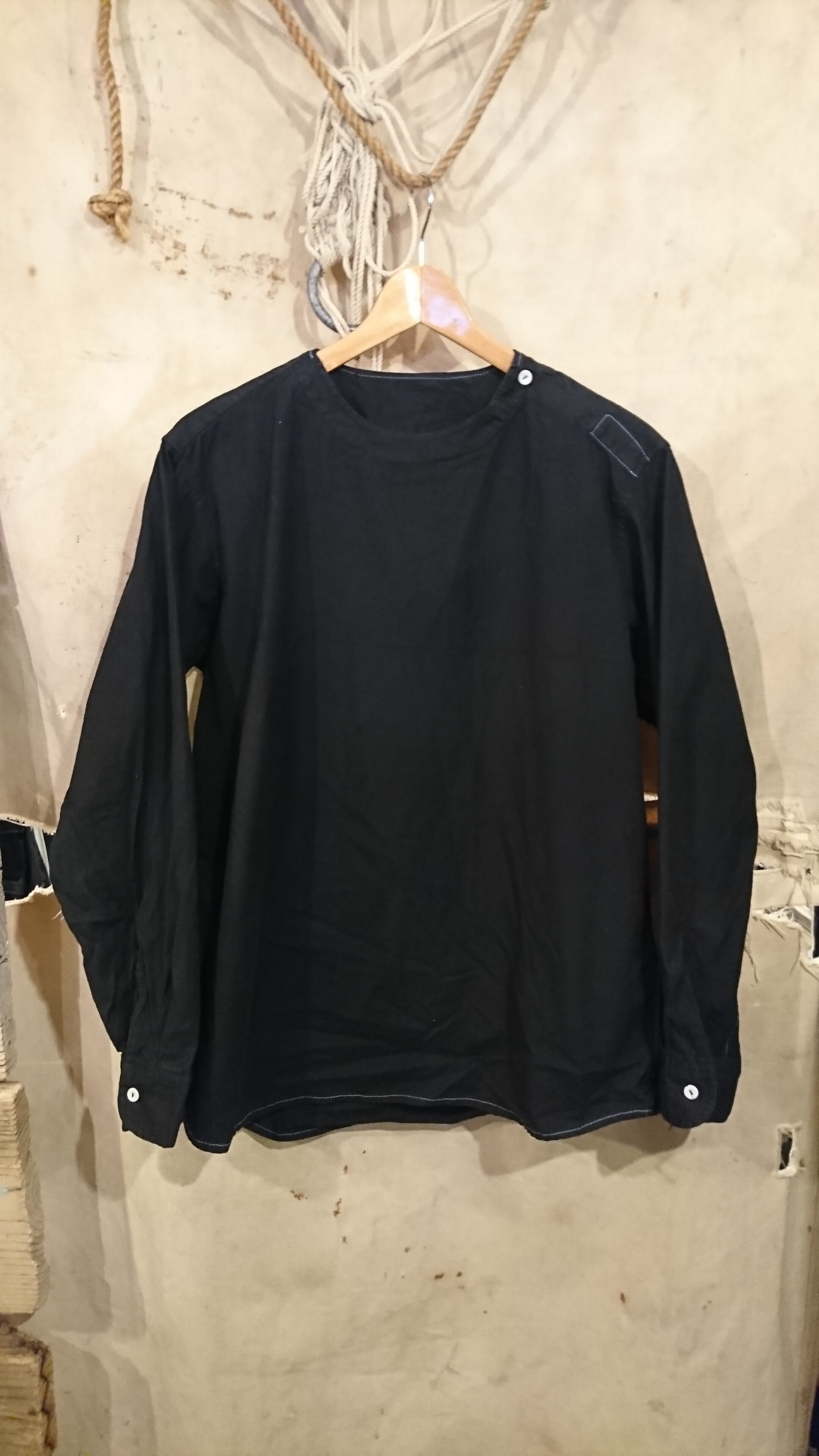 クルーネックタイプで左肩部分にボタンがつきスリットが入ってるので脱ぎ着しやすくなってます。袖にはカフスが付きます。無駄を削ぎおとしたシンプルなデザイン。色々なスタイルに使っていただきたいシャツです。