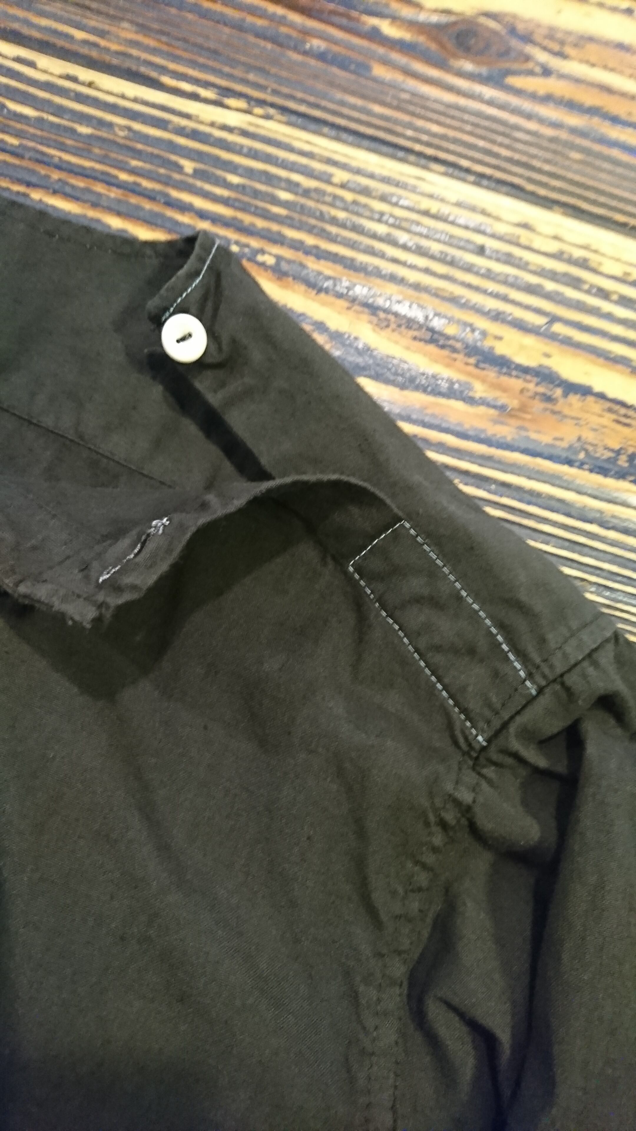 クルーネックタイプで左肩部分にボタンがつきスリットが入ってるので脱ぎ着しやすくなってます。袖にはカフスが付きます。無駄を削ぎおとしたシンプルなデザイン。色々なスタイルに使っていただきたいシャツです。