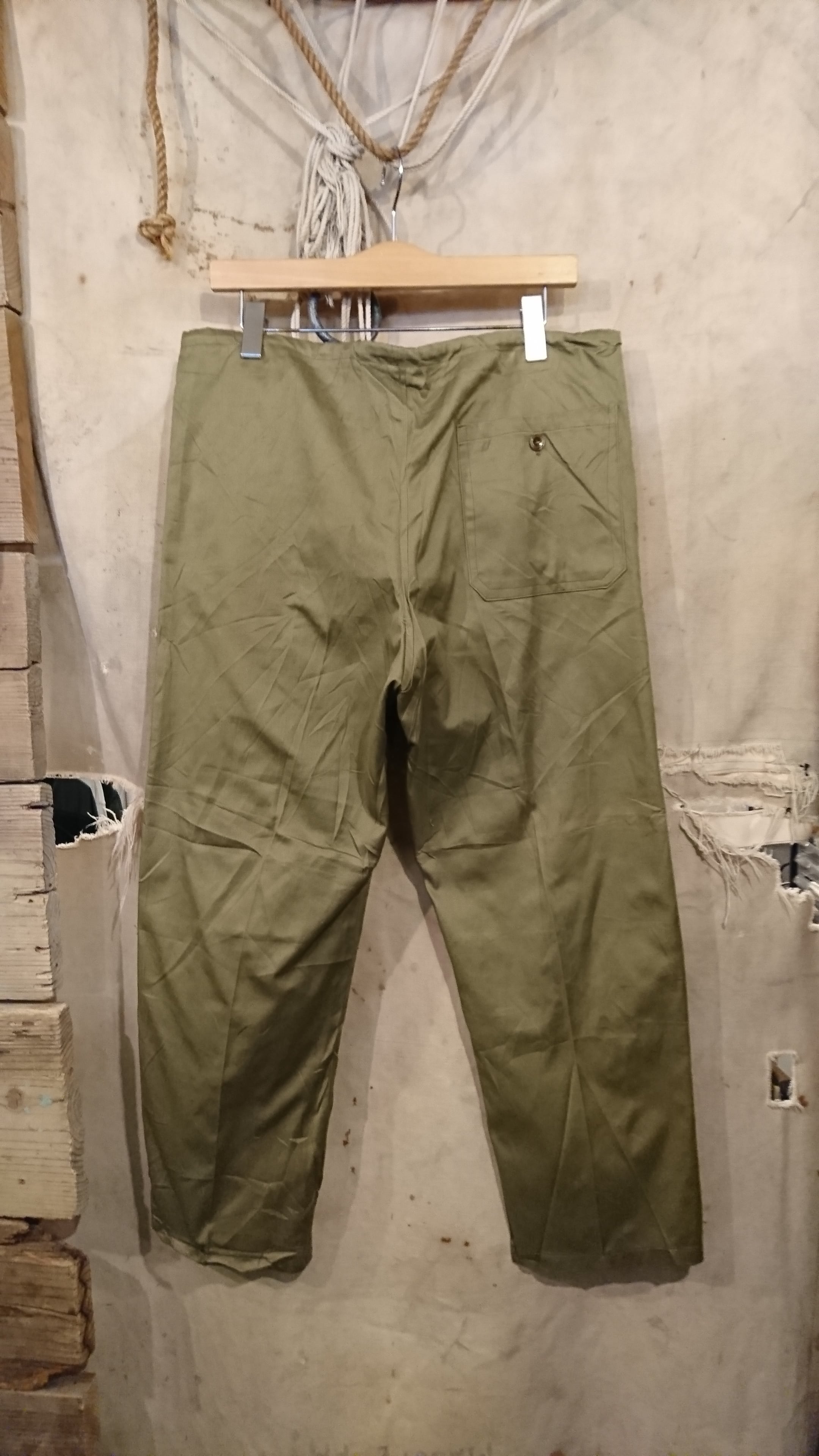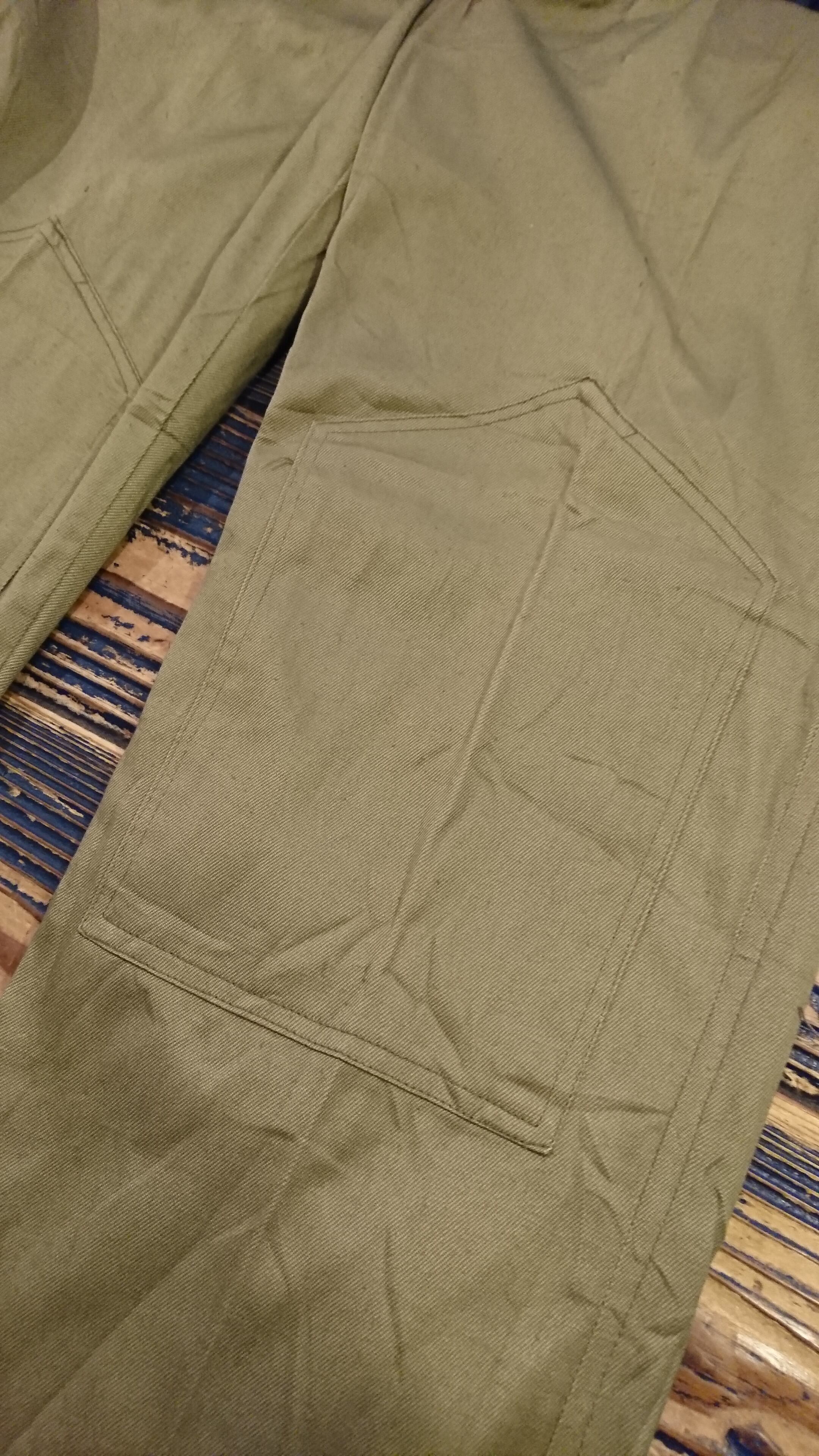 ルーマニア軍ミリタリーパンツのデッドストックになります。イージーパンツ仕様でベルトループは無く、ウエストは紐で縛るようになっています。両サイドにポケットとバックポケットは片方のみつき、とくに膝の補強のデザインが目を惹きます。テーパードした程よいゆとりのあるシルエット。素材はコットンで年代等で生地の色味、ポケット布、フロントと裏地のスタンプなど個体差があります。カラーはオリーブとカーキの中間色になります。