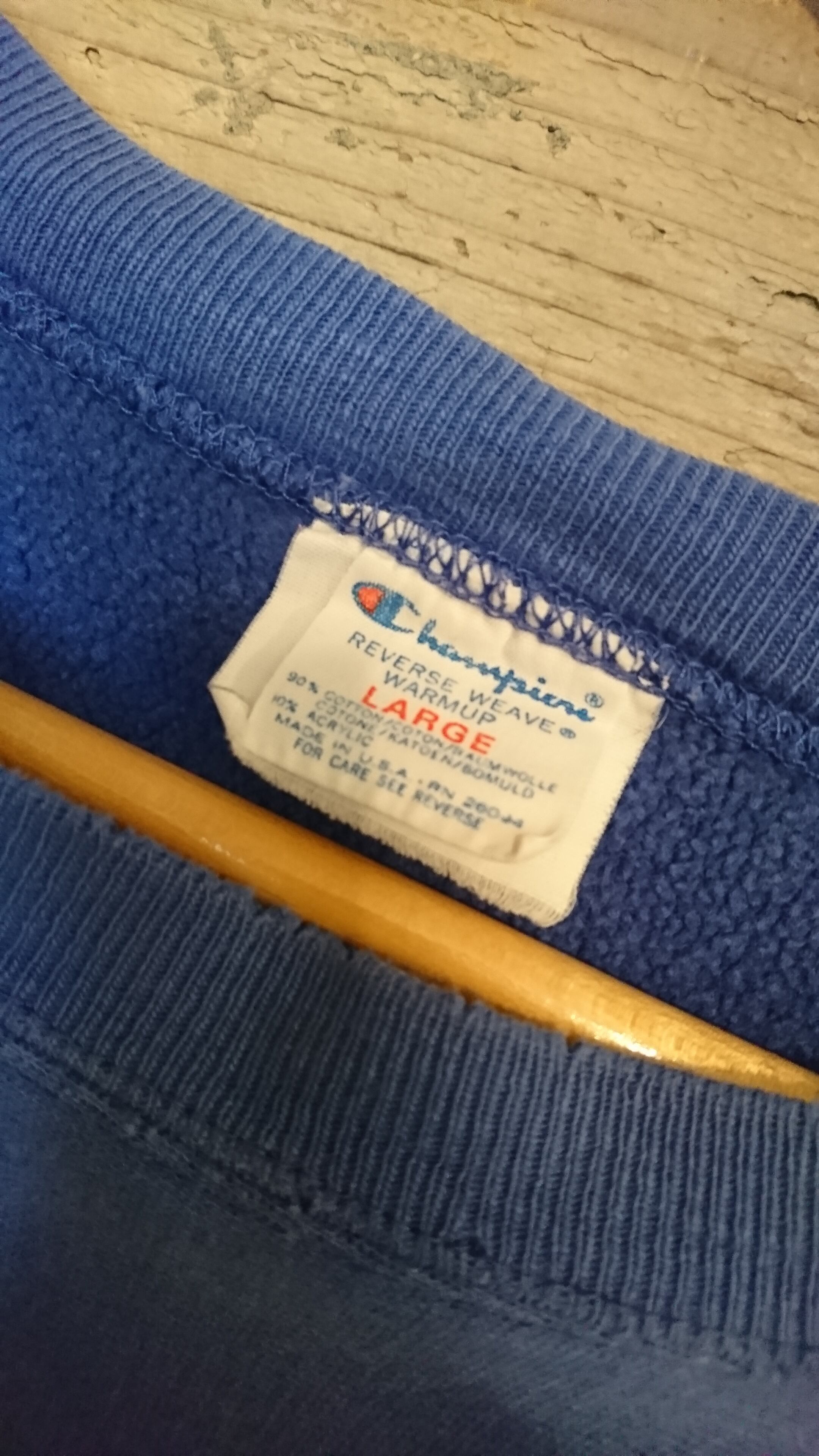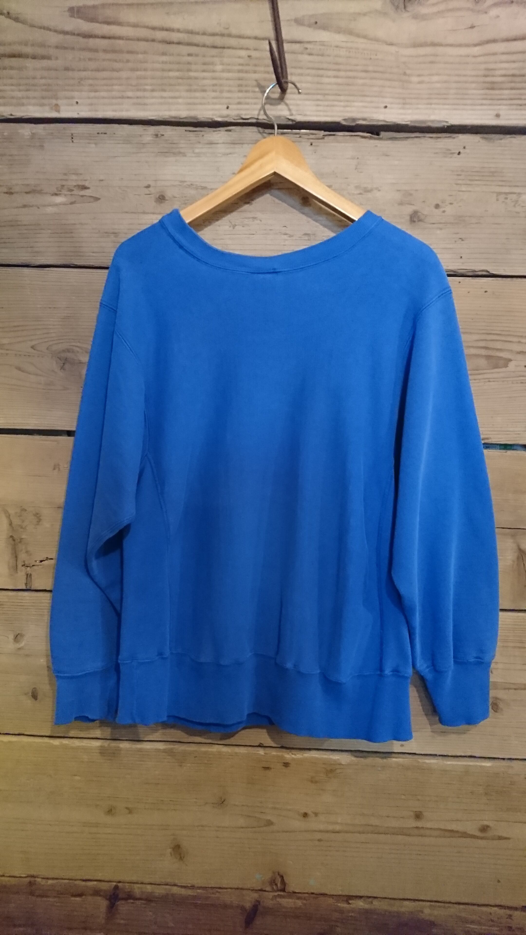 ブルー系の色目でネック部分に小さな傷と左袖リブに数ヶ所傷がありますが着用に問題はありません。MADE IN USAのCHAMPION REVERSE WEAVEも今や貴重になってきました。気になった方いかがでしょうか。