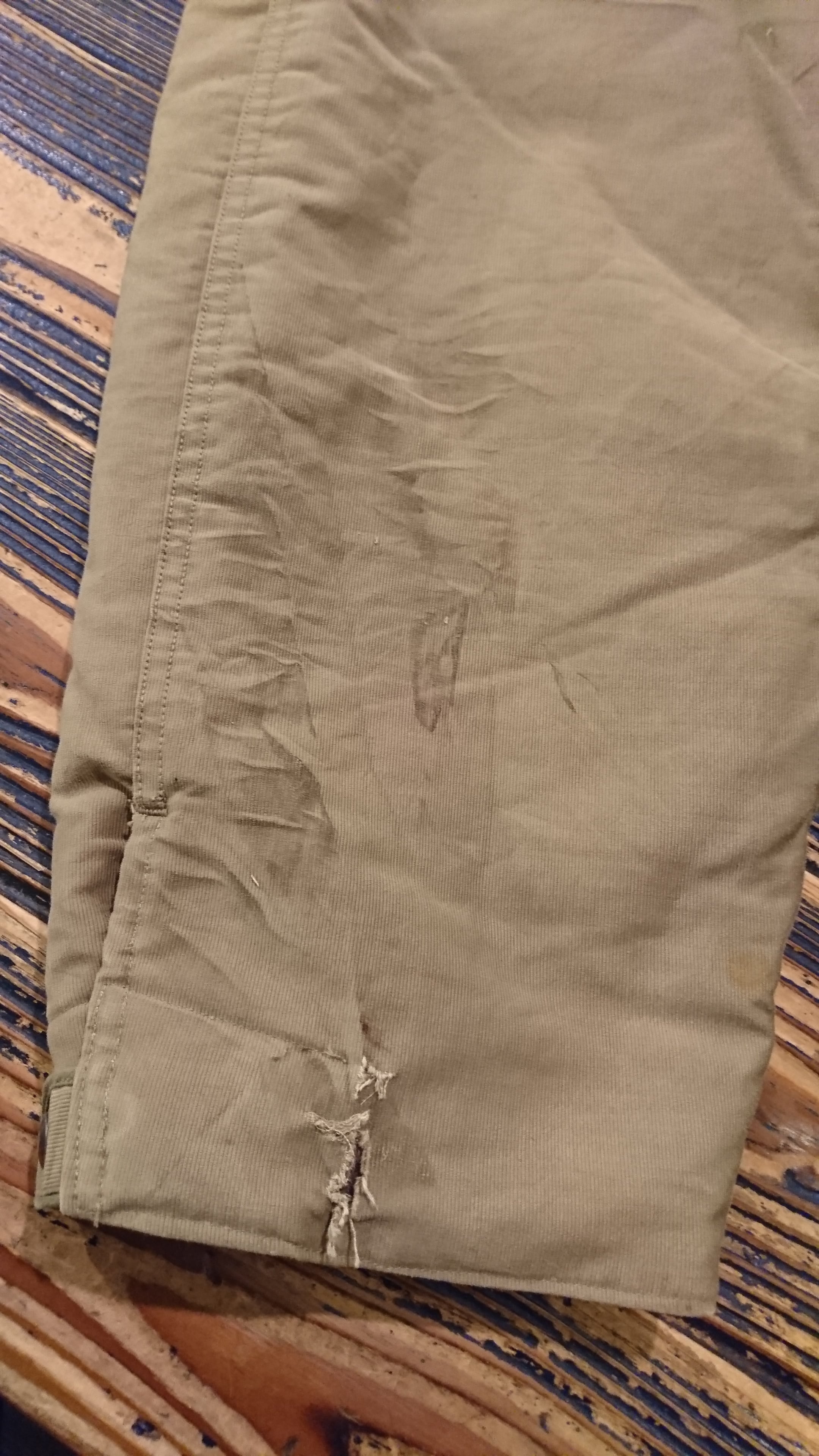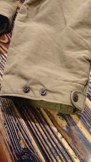 裾にはスナップボタンが付き、とめる位置で裾幅を変えれます。右足裾に二ヶ所傷と数ヶ所汚れがありますが着用に問題はありません。