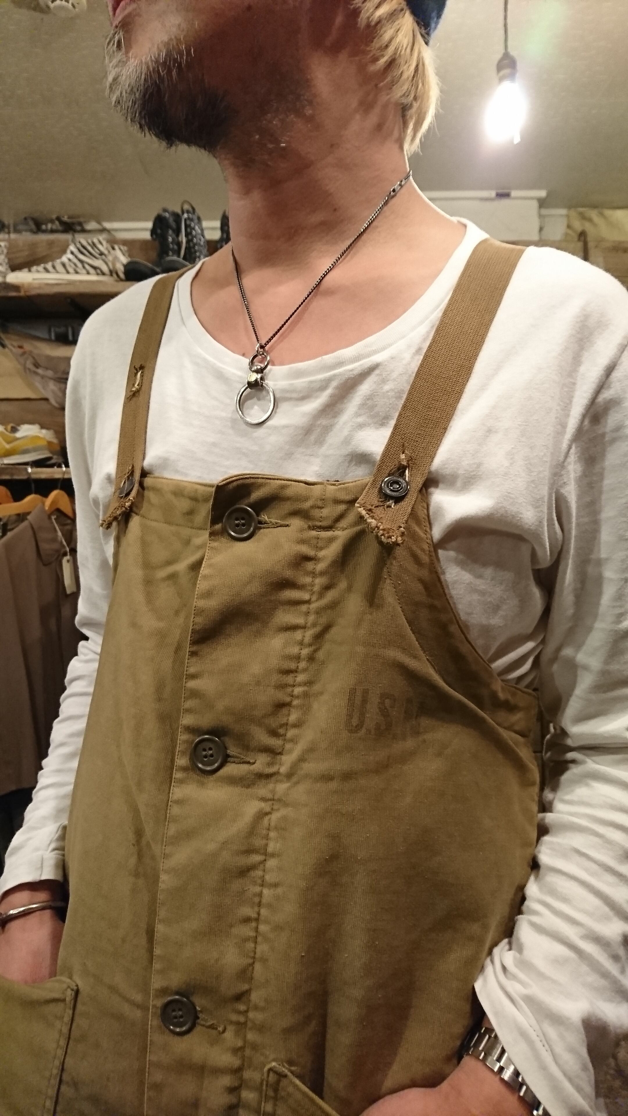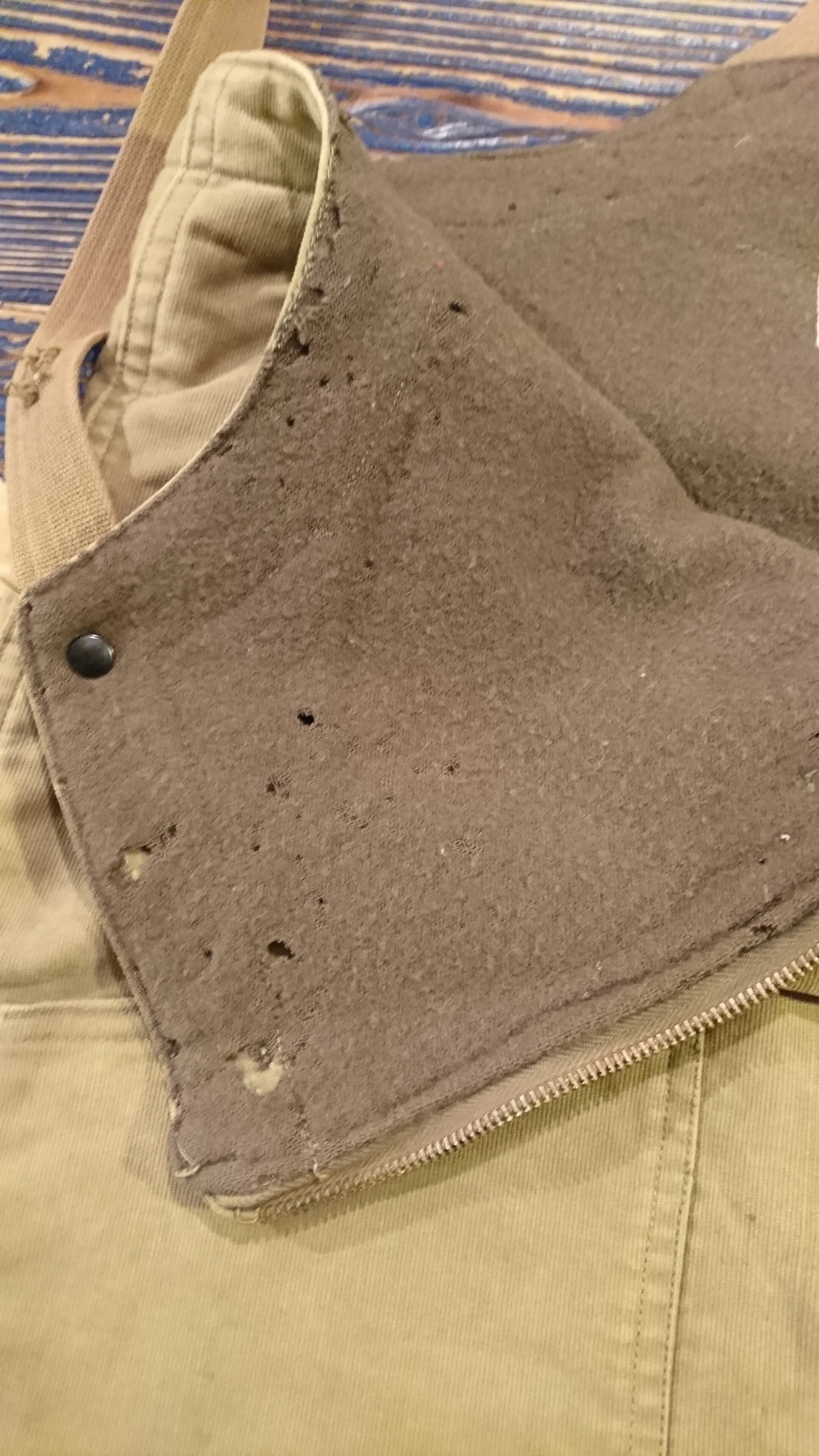 全体的の汚れやサスペンダー部分がボタンとめに直されてるところも雰囲気あって男前なパンツです。裏のウールに破れはありますが着用に問題はありません。雰囲気のパンツお探しの方いかがでしょうか。