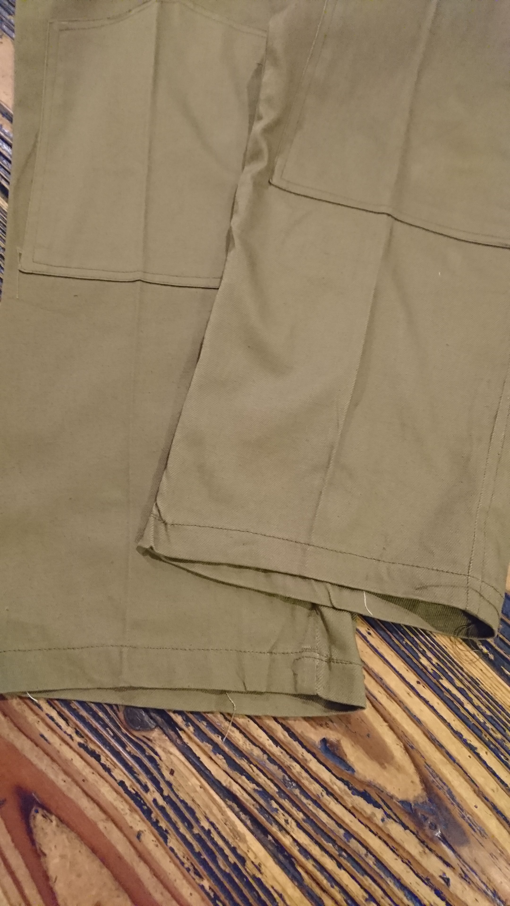 ルーマニア軍ミリタリーパンツのデッドストックになります。イージーパンツ仕様でベルトループは無く、ウエストは紐で縛るようになっています。両サイドにポケットとバックポケットは片方のみつき、とくに膝の補強のデザインが目を惹きます。テーパードした程よいゆとりのあるシルエット。素材はコットンで年代等で生地の色味、ポケット布、フロントと裏地のスタンプなど個体差があります。カラーはオリーブとカーキの中間色になります。