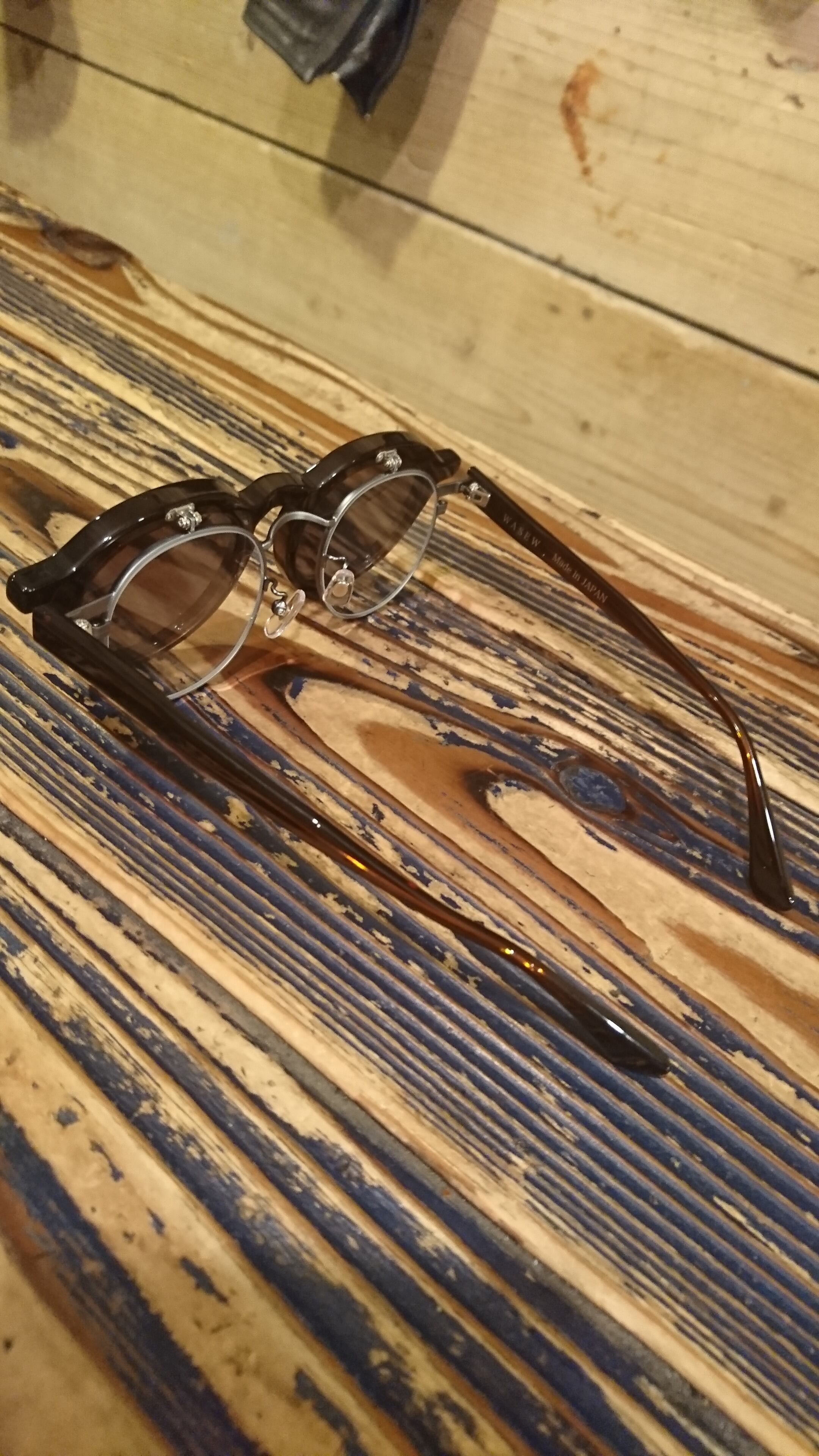 跳ね上げ式のサングラスになります。かけた時にシンプルに見えるようにフロントのセルフレームが跳ね上がるようになっています。セルフレームを跳ね上げるとメタルフレームが出てきます。鯖江の熟練した職人により1本1本丁寧に削り出しで作っています。職人の技術の高さを感じていただくために、フロント部分の飾り丁番はあえて付けておりません。レンズには有名メゾンにも使用されているいにイヌイレンズを採用しています。