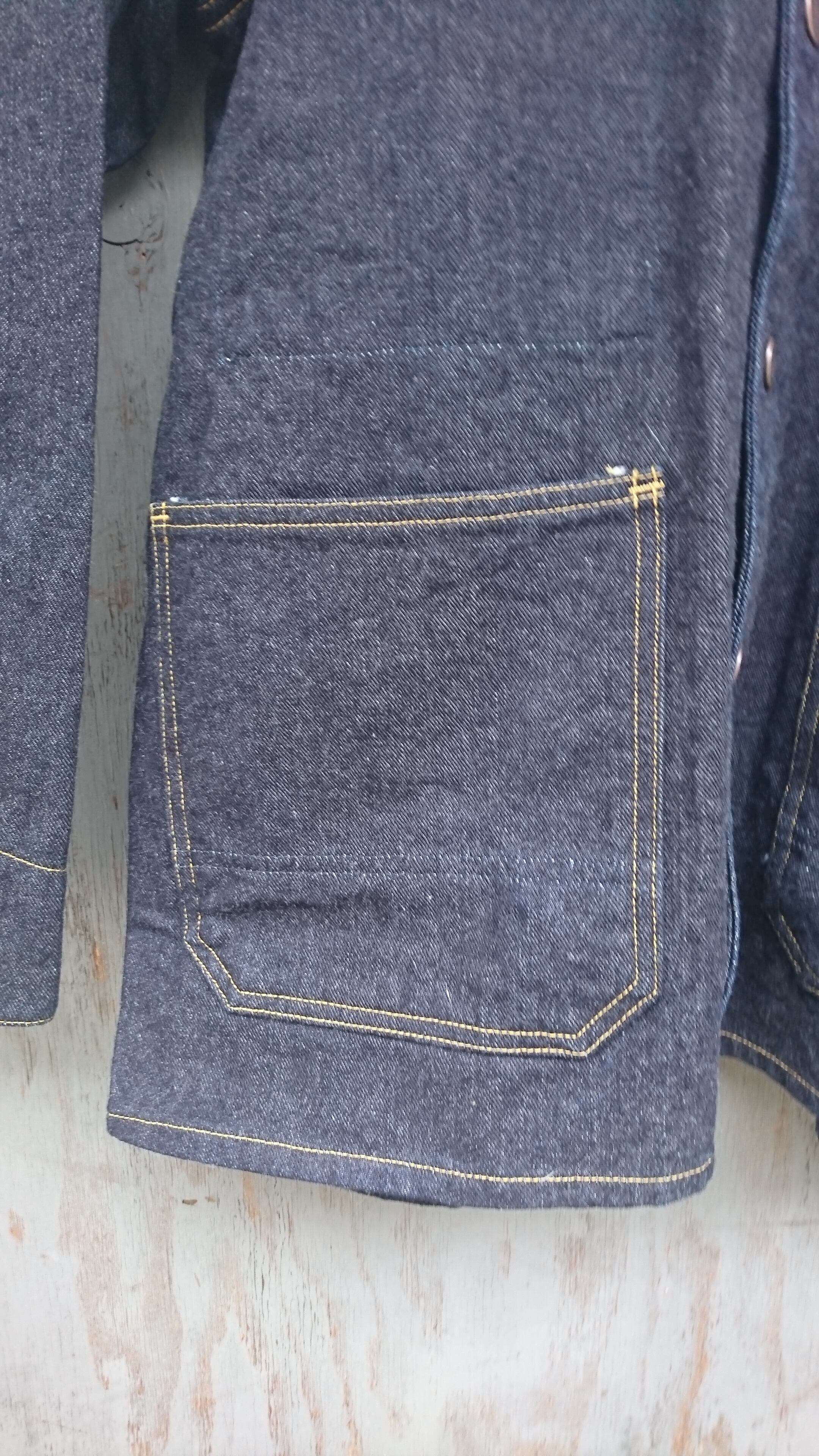古着や新品の服のカバーオールのだいたいのものは胸ポケットにペン差しや懐中時計を入れるポケットがあり白のトリプルステッチ、生地はライトオンスデニムという感じですが、WASEWのカバーオールは極力シンプルに4つの貼りポケットのみでうち一つは内ポケット。
