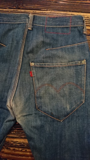 昨今人気のLEVI'S RED。1st STANDARDに似ていてヒップポケットのフラップが無いタイプになります。良い感じの色落ちで、雰囲気すら感じれる一本です。フロント左ポケット下辺りに1.5㎝程の染みがあります。女性の方でも穿いていただけるサイズです。気になった方いかがでしょうか。
