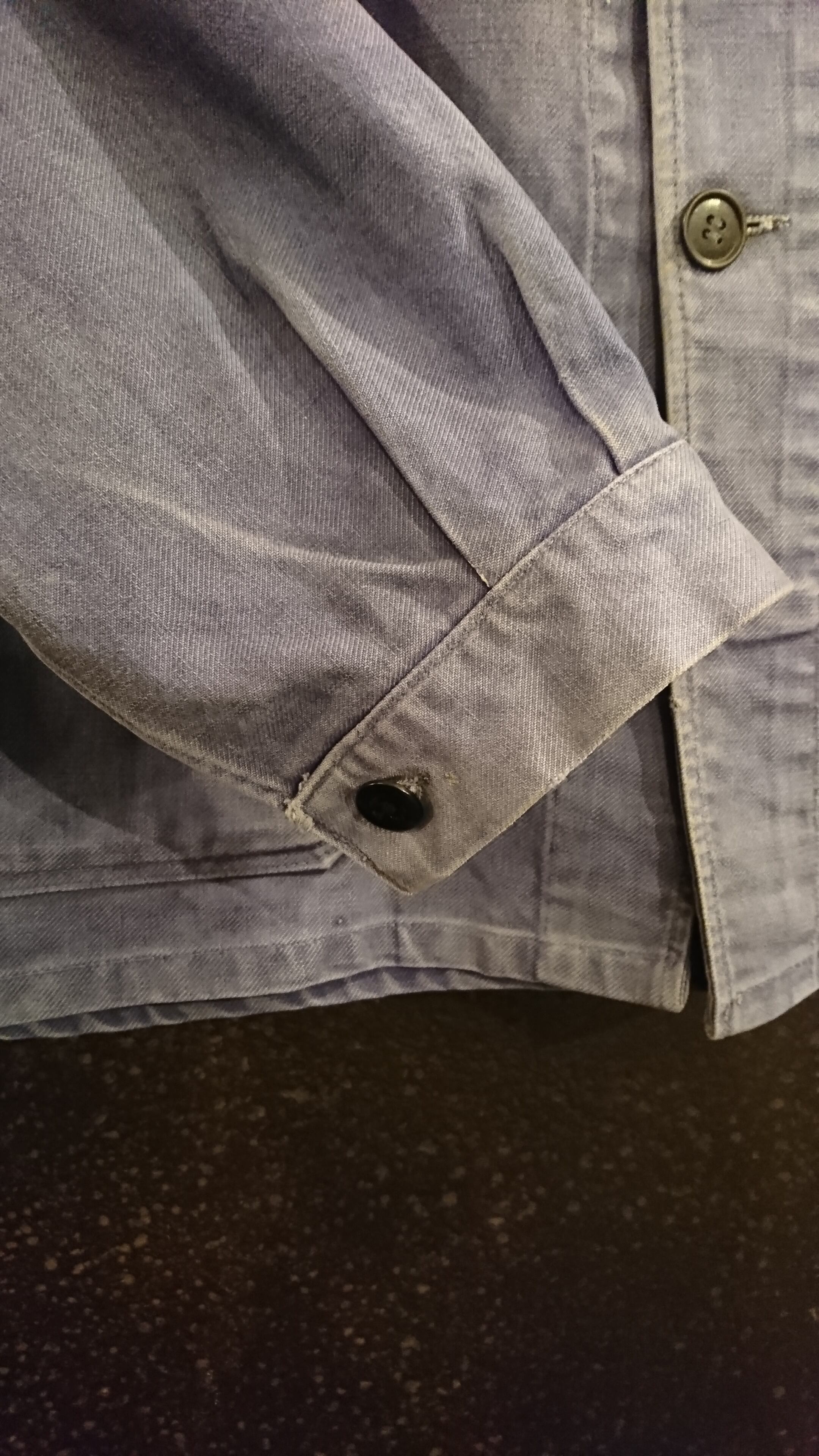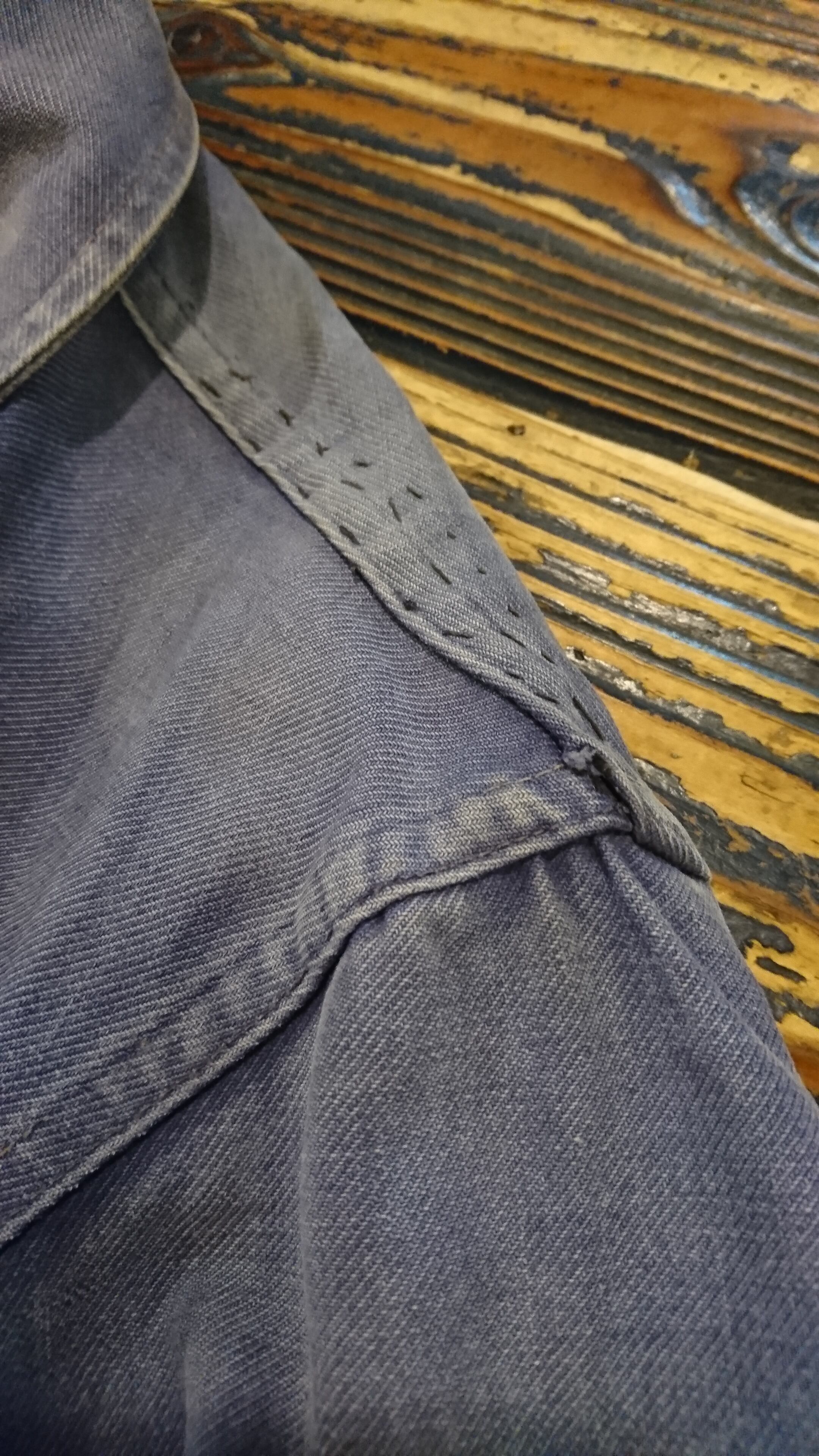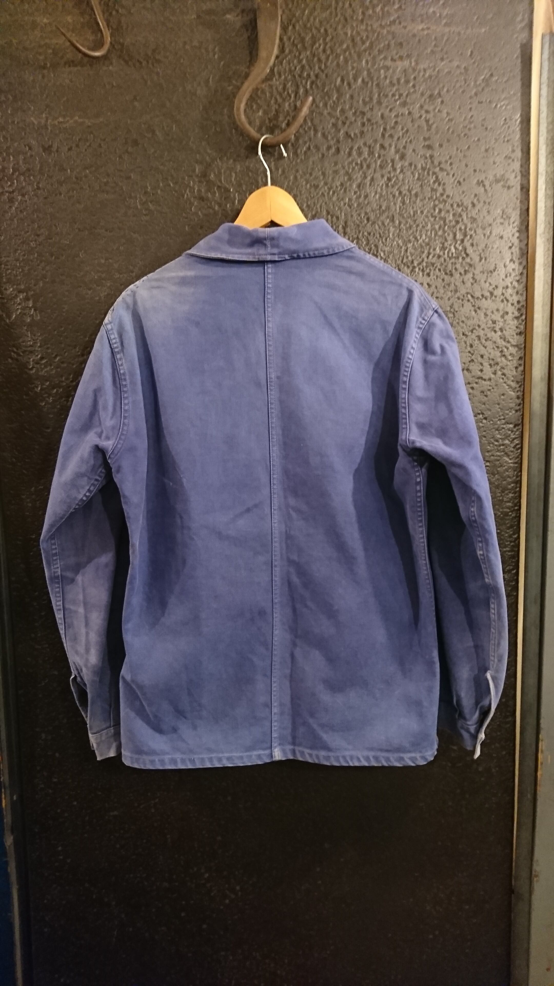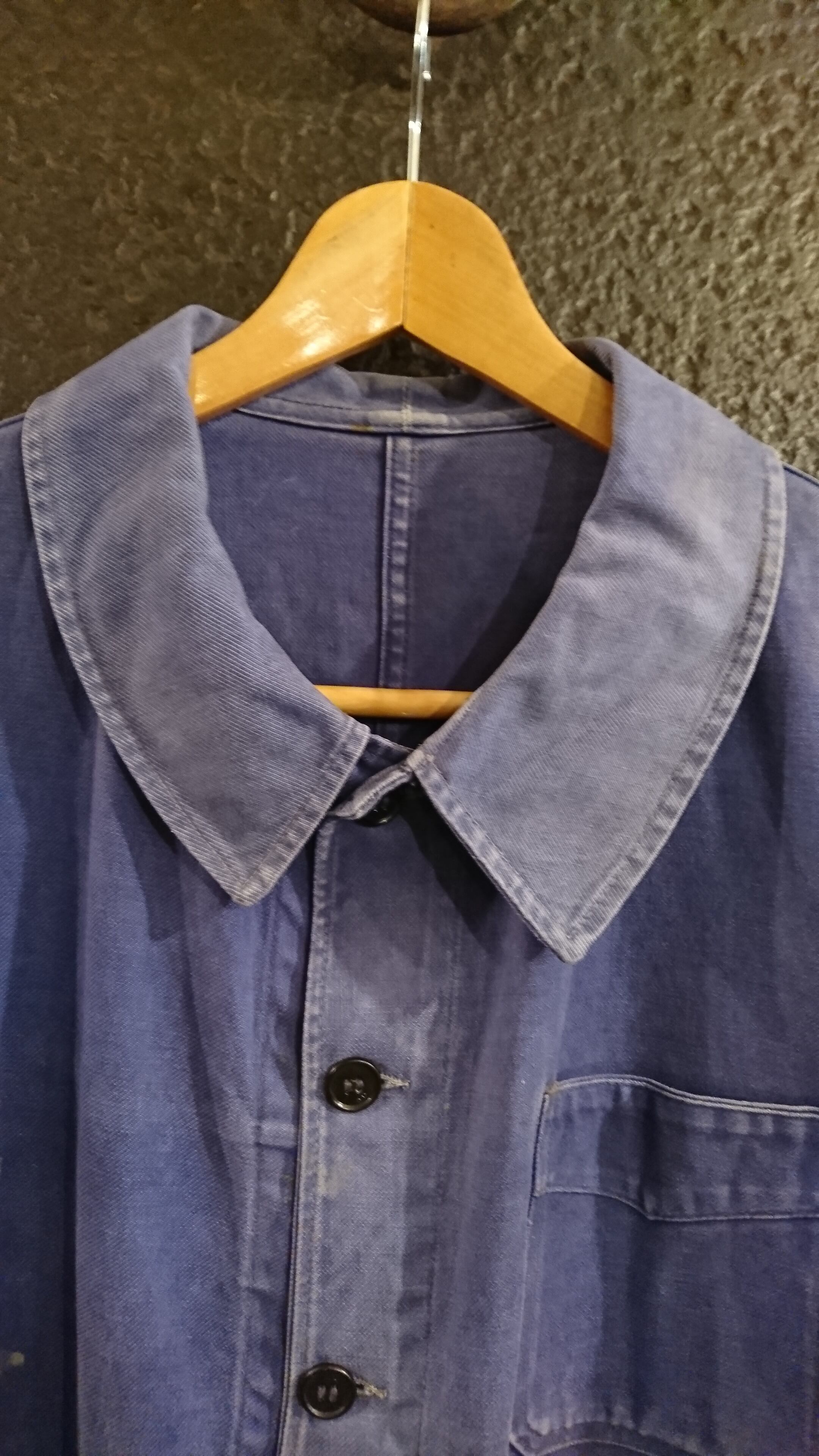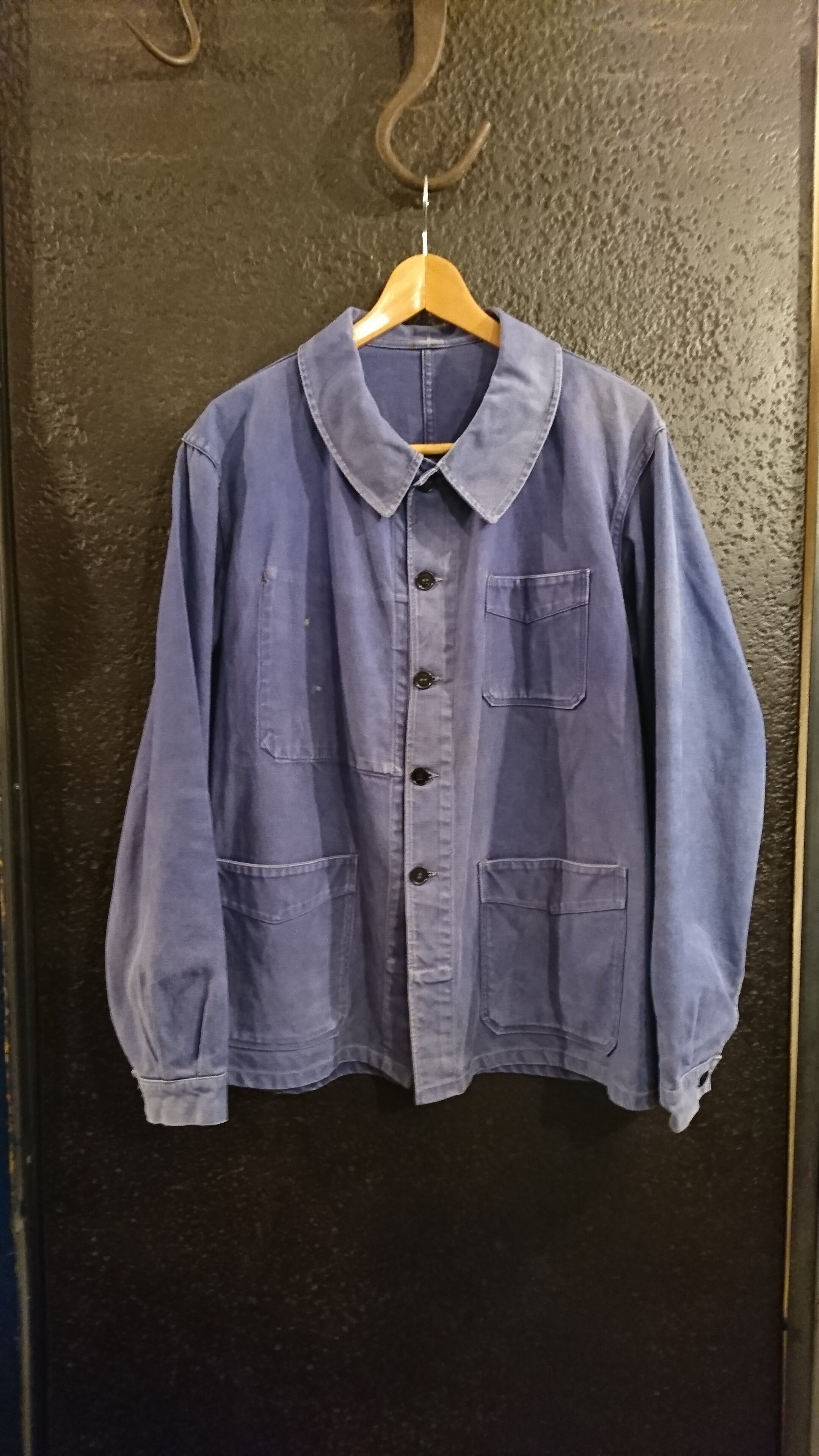 40〜50年代 フレンチワークコットンツイルのカバーオールになります。モールスキン生地とはまた違った雰囲気をもつコットンツイル生地。フレンチインクブルーのもつ紫がかった色目。天然素材ゆえの経年変化。このジャケットの色褪せは男前すぎます。ペンキ汚れ、左肩のリペア、両袖のボタンが変わってますが着用に問題はありません。フレンチワークの持つ雰囲気はアメリカ物のワークアイテムとはまた違う格好良さプラス上品さすら感じれます。色々なスタイルにはめて頂きたいジャケットです。