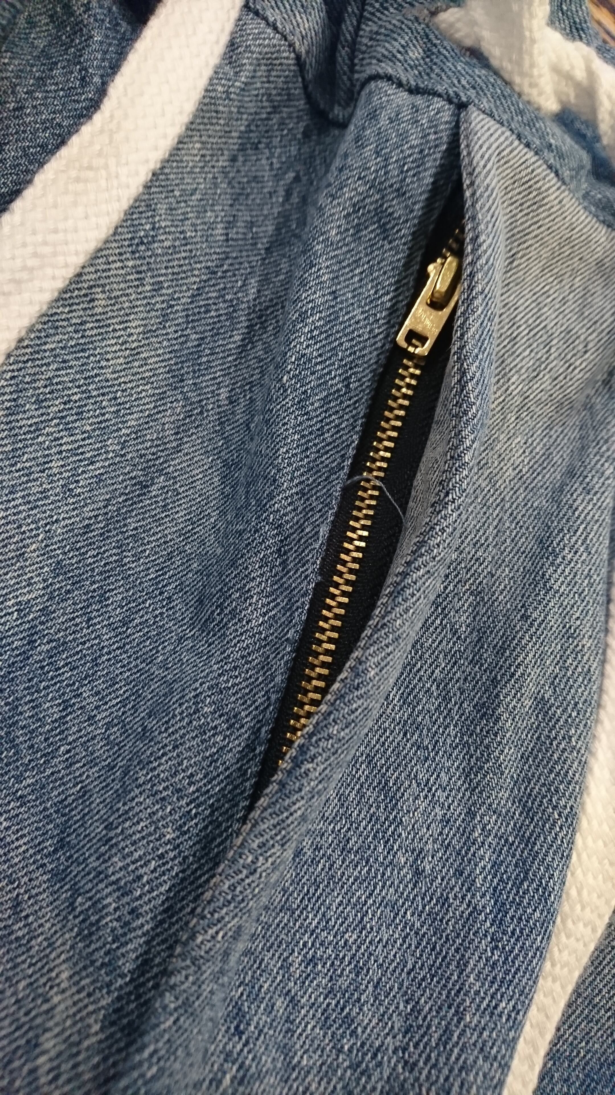 腰にはゴムが入ってるの絞りも可能。使用してるデニムの色落ち等で一点一点の違う雰囲気も魅力。