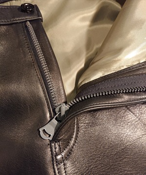 無骨なホースハイドに丁寧にオイルド加工を施した1.4mm厚の重厚且つしなやかなレザーで仕立てられ、YKKのダイキャストジッパーで更に重厚さを増した佇まいが心打たれるルックス。ベースモデル606スリムに開閉のし易さを考慮してインシームに配置した剥き出しの無機質なダイキャストジッパーが印象深い。