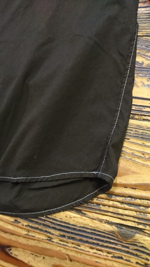 クルーネックタイプで左肩部分にボタンがつきスリットが入ってるので脱ぎ着しやすくなってます。袖にはカフスが付きます。無駄を削ぎおとしたシンプルなデザイン。色々なスタイルに使っていただきたいシャツです。