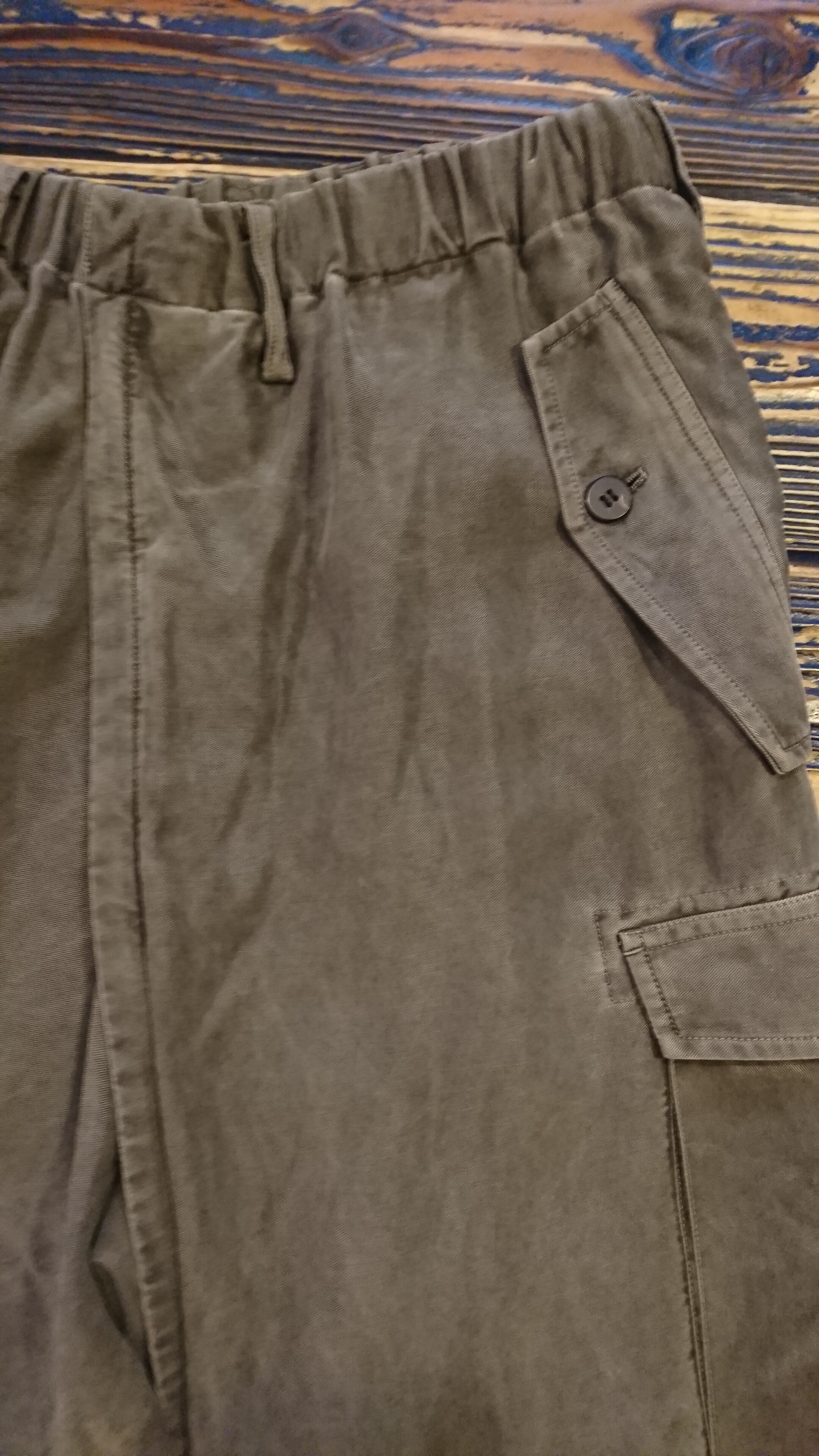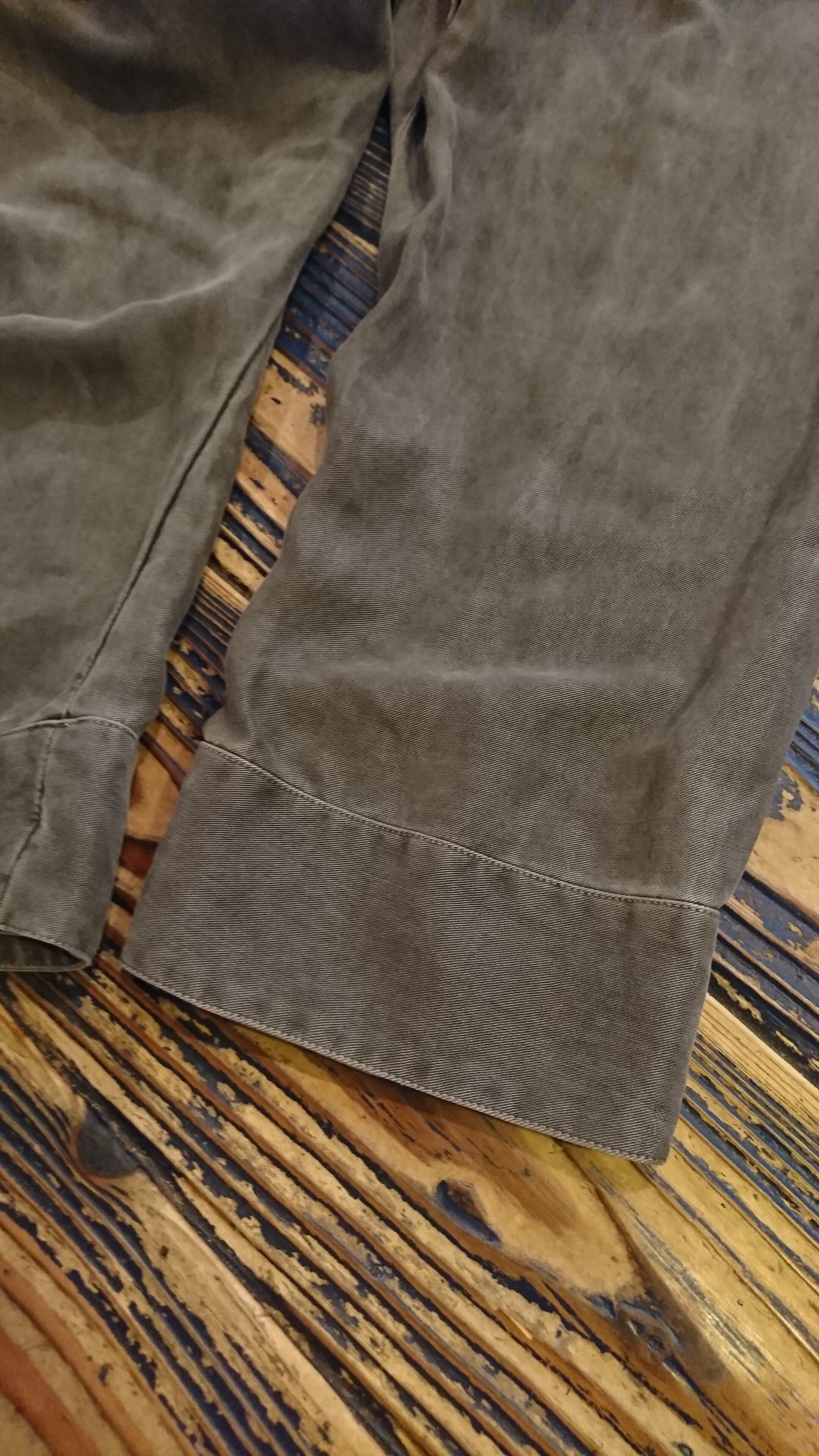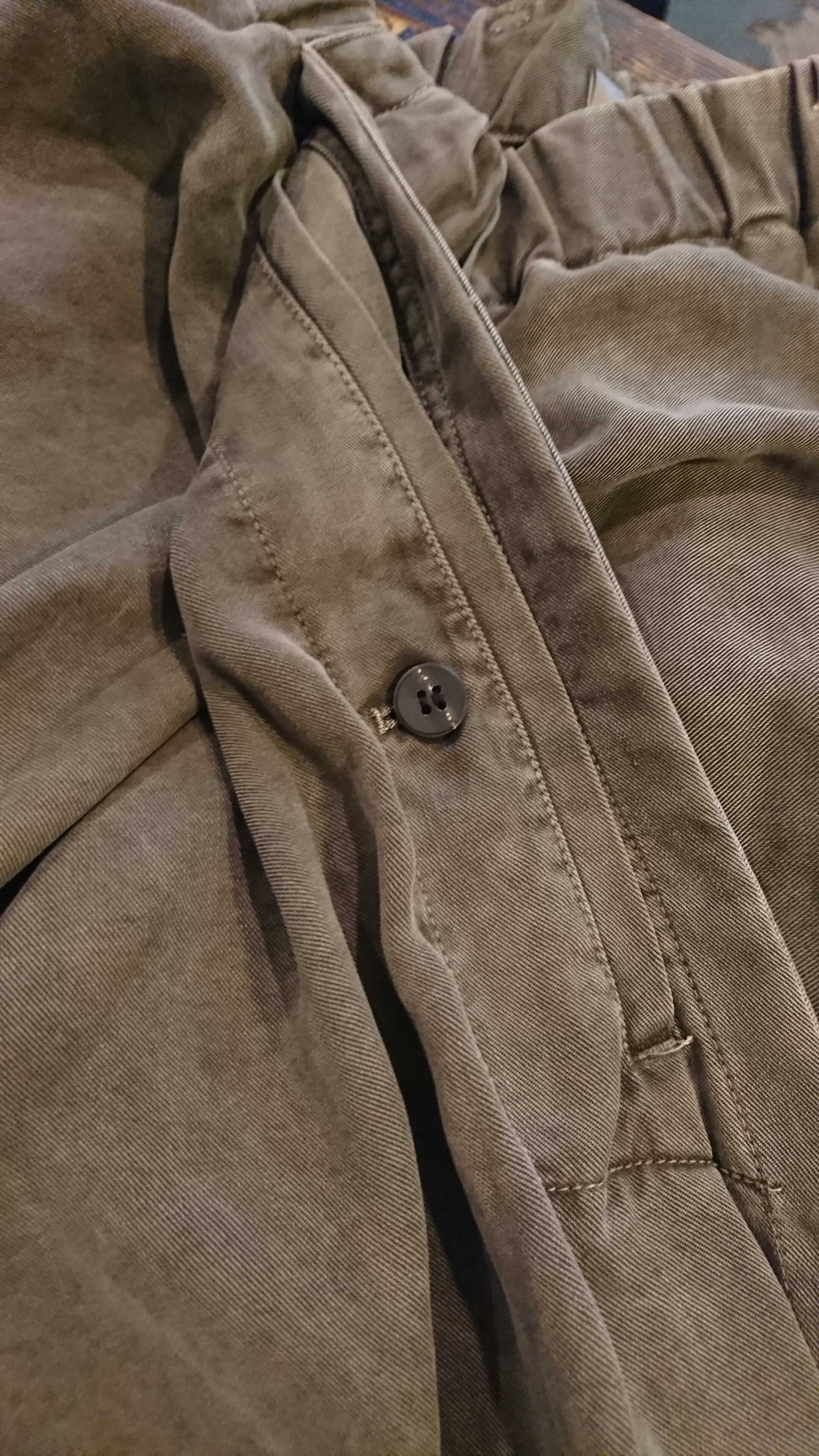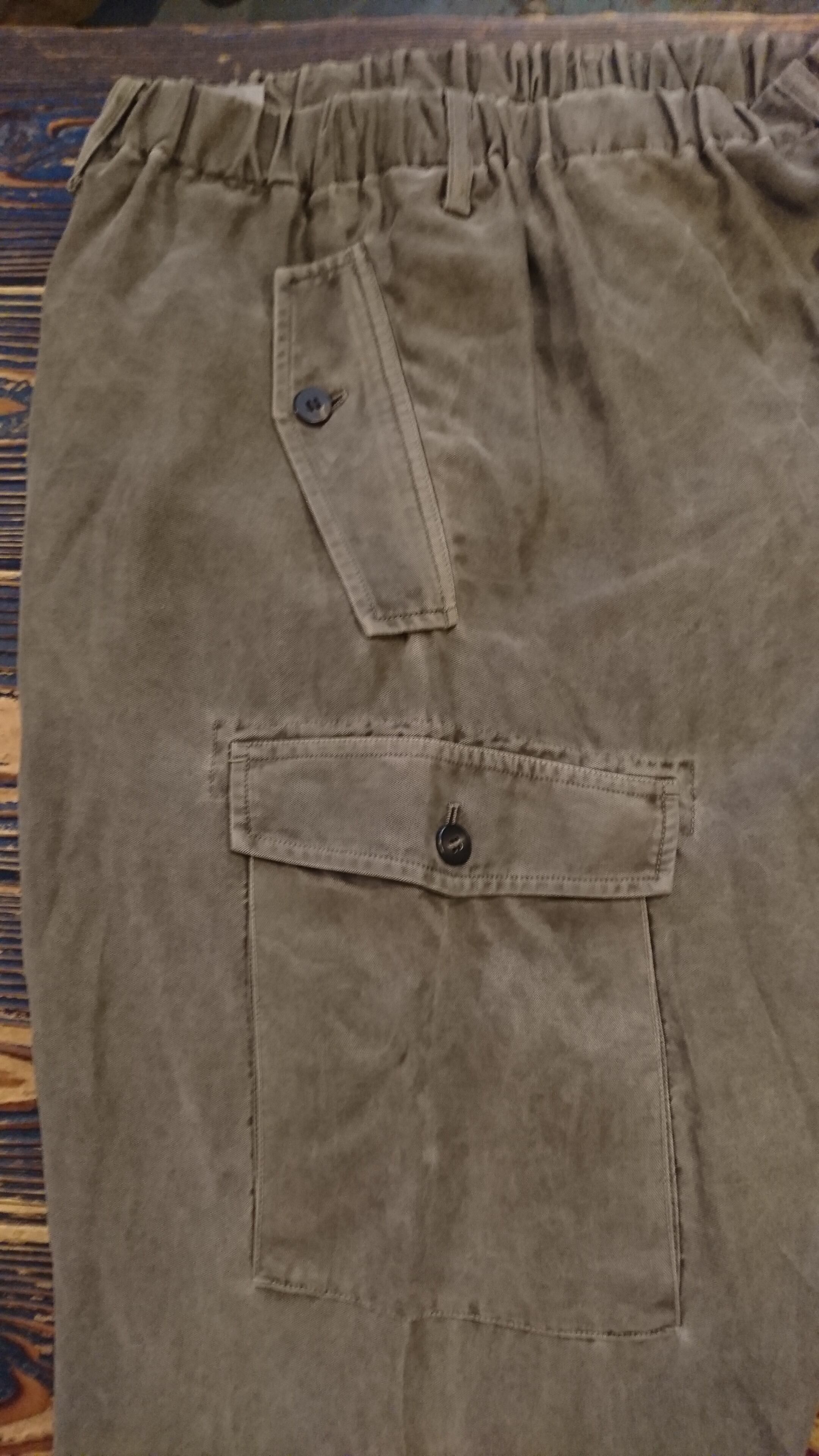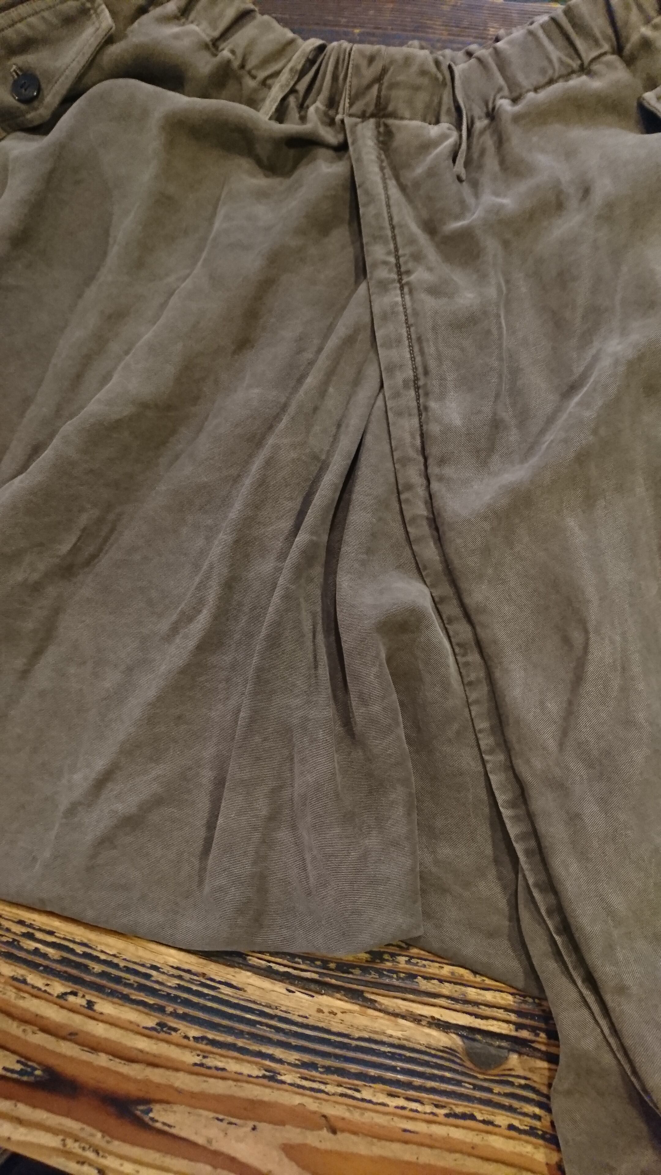 デザイン。ウエストはゴム使用でイージーパンツのようにドローコードは付いてないので絞る事は出来ませんがベルトループがついてるのでベルトを通す事で腰周りのフィット感は調整できます。テンセルのようなテロンとした素材で履き心地もとても良くデザイン性も抜群なパンツです。