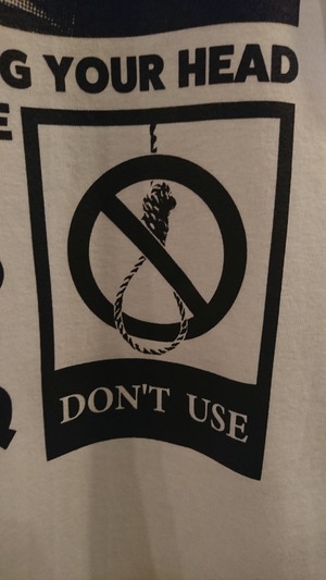 吹き出しに影を付けた所や、首吊りロープが禁止マークをはみ出している所など、細かい所もポイントです。
