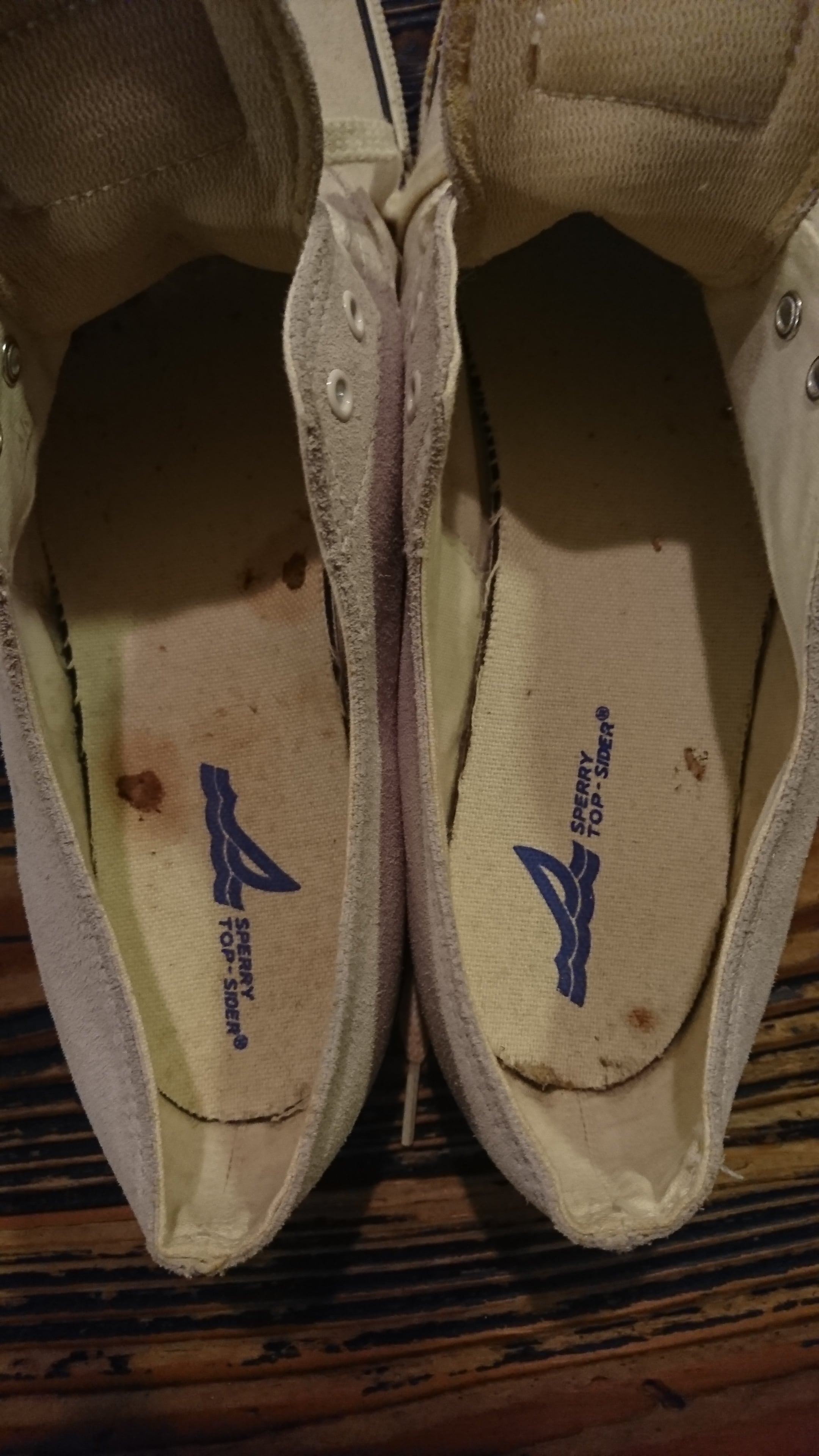80年代 TOP SIDERのスエードスニーカーになります。左のアッパー部分にうっすらと染みとインソールに錆び汚れみたいな染みがありますが穿くのに問題はありません。それ以外のコンディションは良いほうでソールの減りも少ない一足。