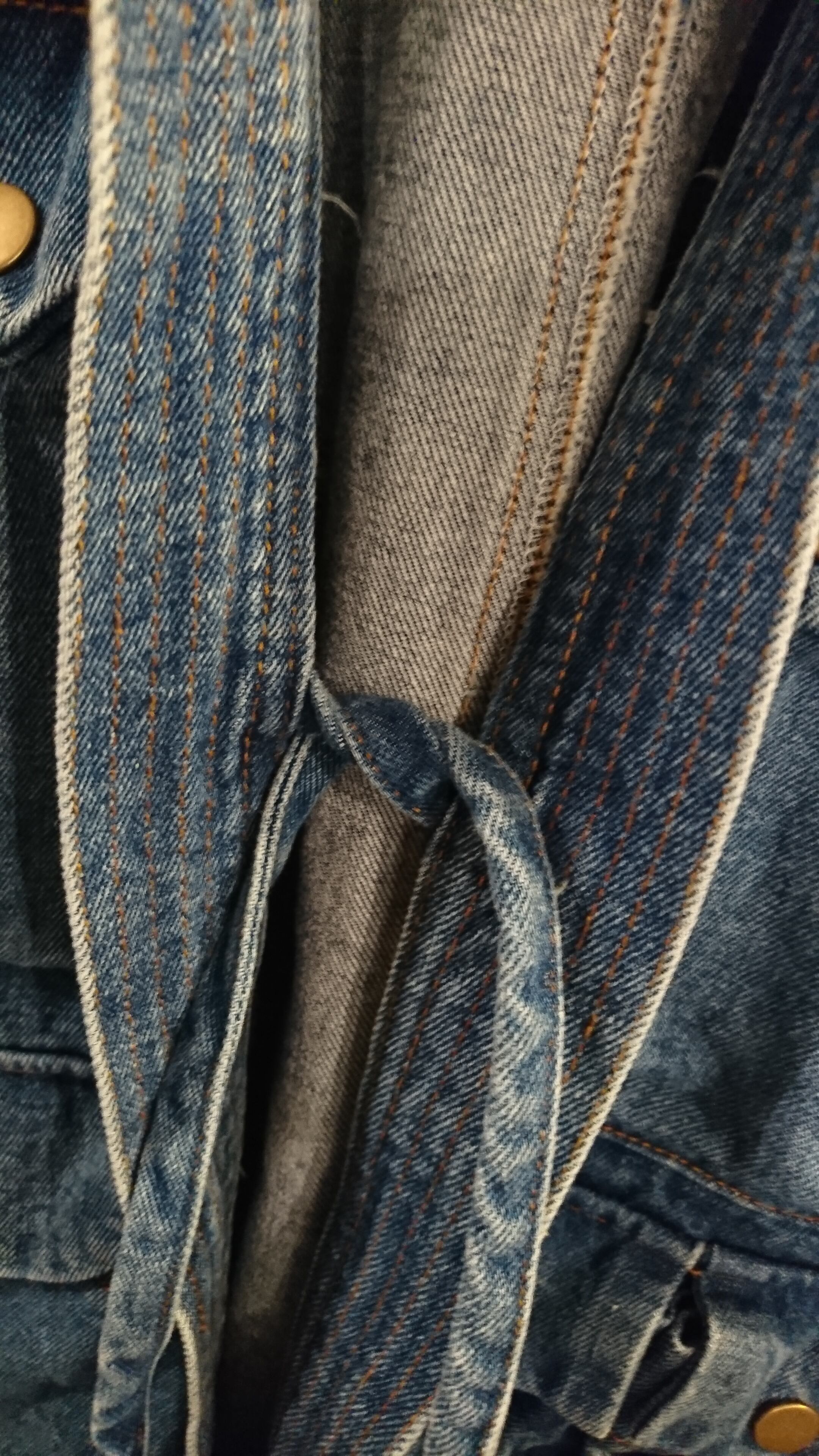 デニム素材で胴着とハンティングジャケットを合わせたようなデザイン。前見頃に多数付く