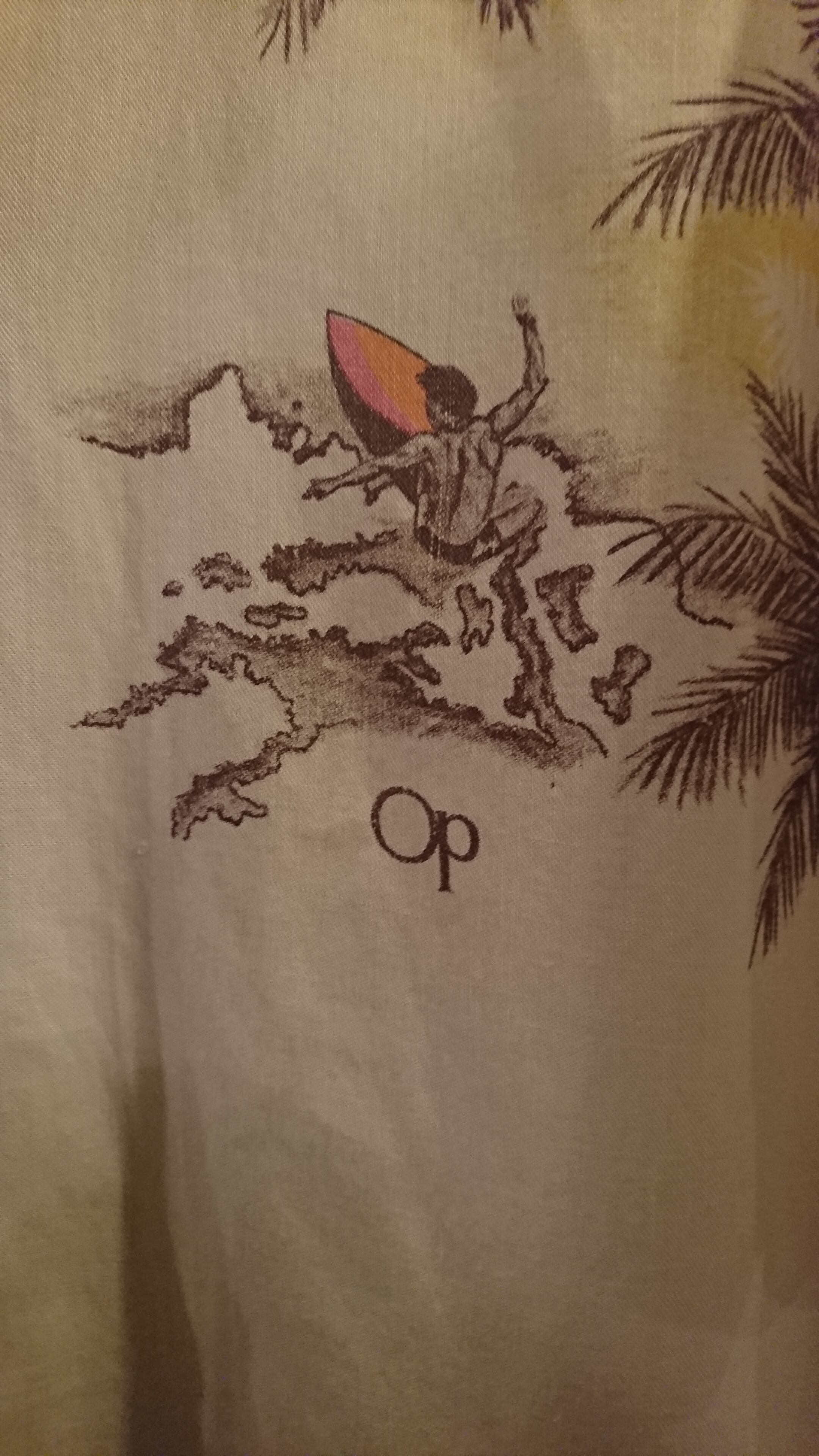 70年代 Ocean Pacificのコットンハワイアンシャツになります。懐かしいと感じ方も多いのではないでしょうか。胸元のプリント、あとヴィンテージOPというところにも惹かれます。