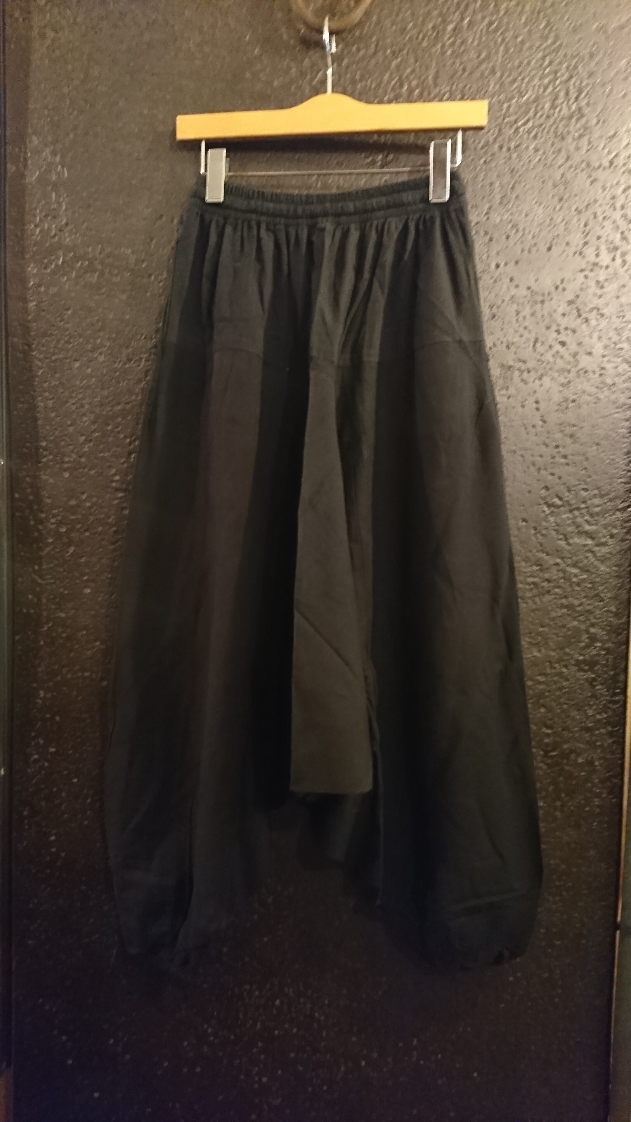 ウエスト部分はゴムが入っており紐で絞る事も可能。股上はゆったりしていて、足首までがダボッと垂れ下がっており広がったまま足首までつづく形状が特徴。色々なスタイルに使いたいデザイン性あるパンツです。