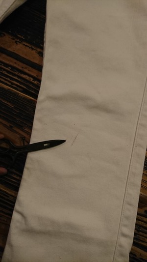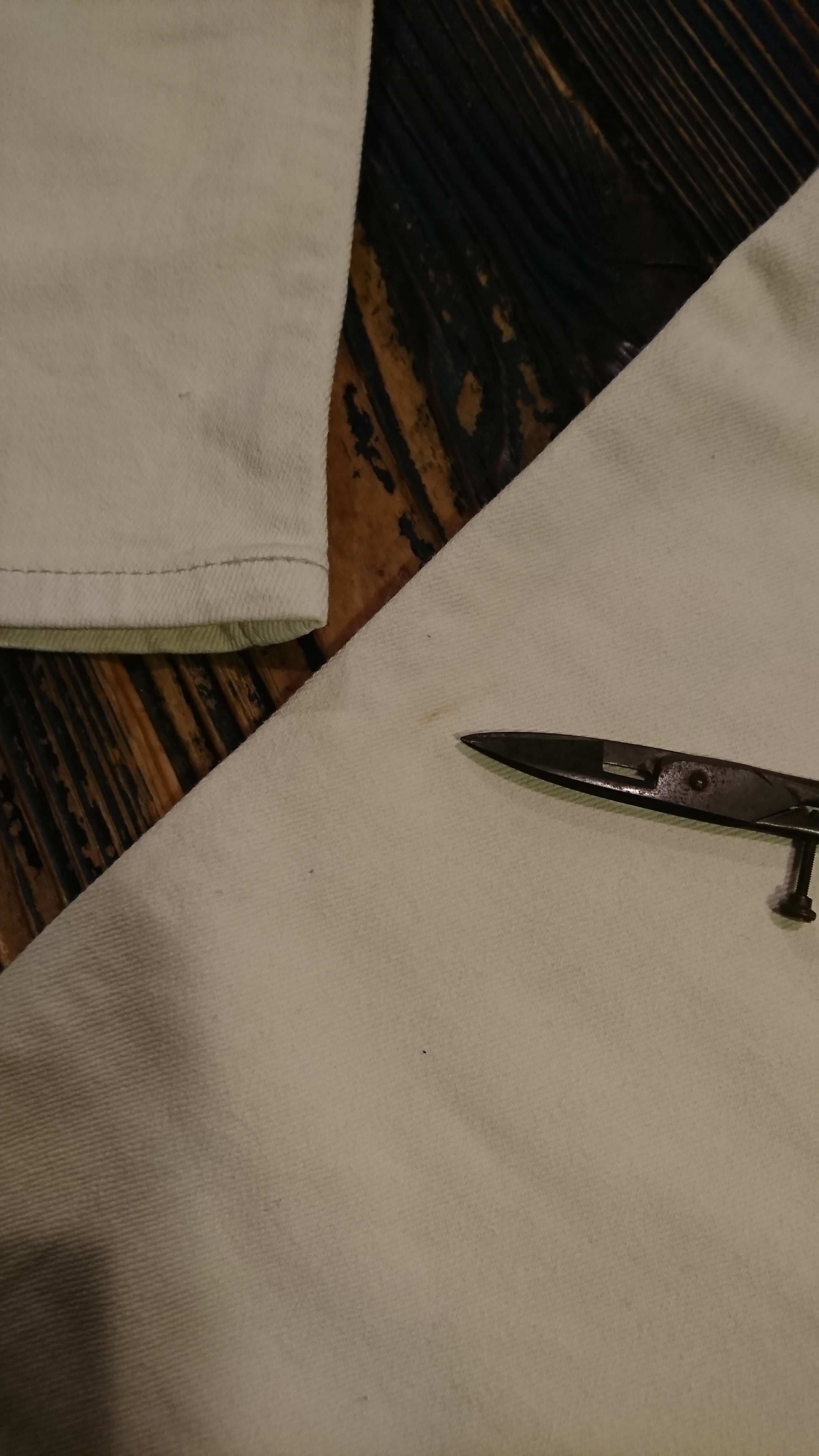 そこまで裾にひらきがなく、とても綺麗なシルエットです。左足に2ヶ所少し汚れがありますが