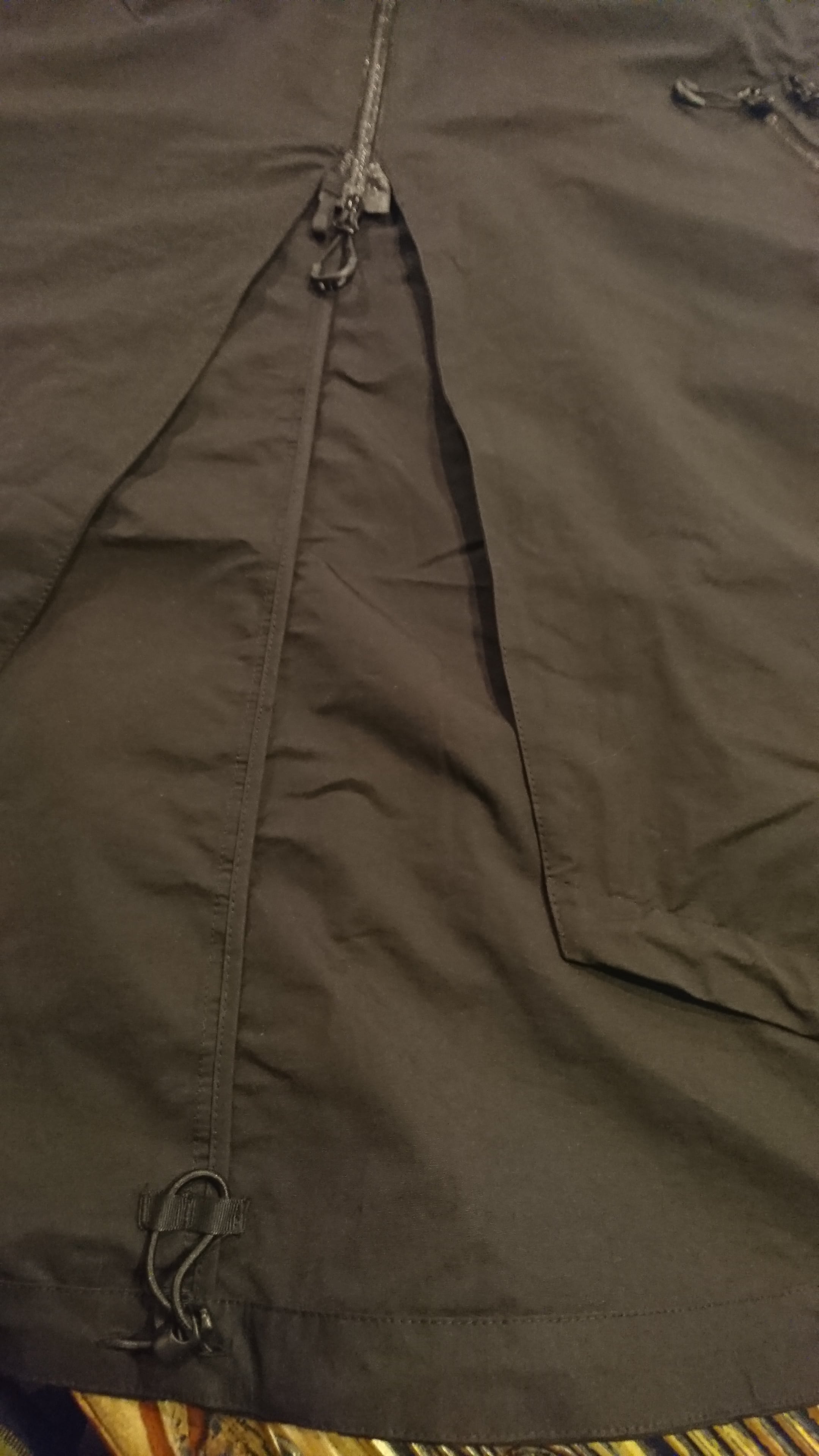 胸にあるサコッシュポケットが目を引くオーバーコートを製作。前立てのパターンとジップの垂らし方を工夫した。脇ポケットの上にオーバーコートによくある中に着ているジャケットのポケットに直接アクセスできるジップを装着。ライニングにダウンコートが装着しやすいようになっている。シワ感の強い撥水綿ナイロンを使用。