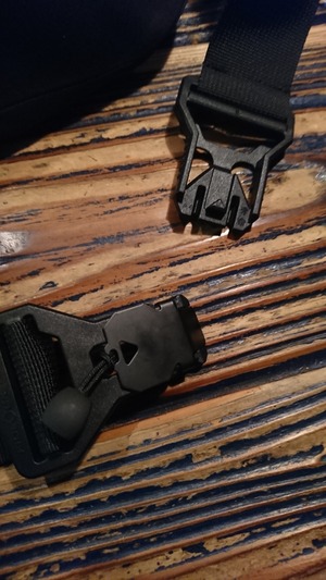 フルオリジナル生地3レイヤー耐水10000透湿10000。フルシーム。化繊にありがちのつやを消せた生地となる。前面をパターン三つで構成した変形ウエストバッグ。FIDLOCKバックルを装備。
