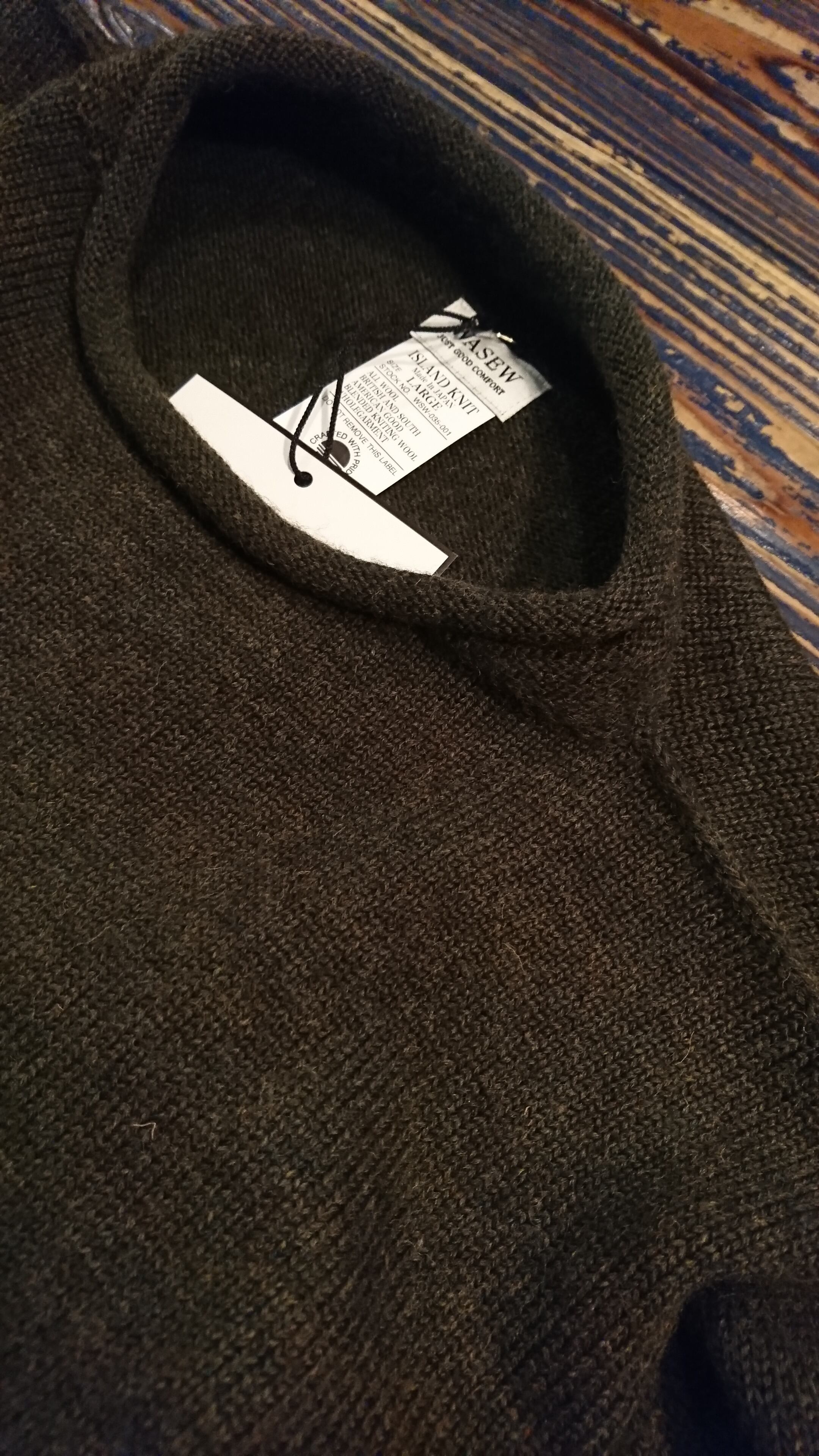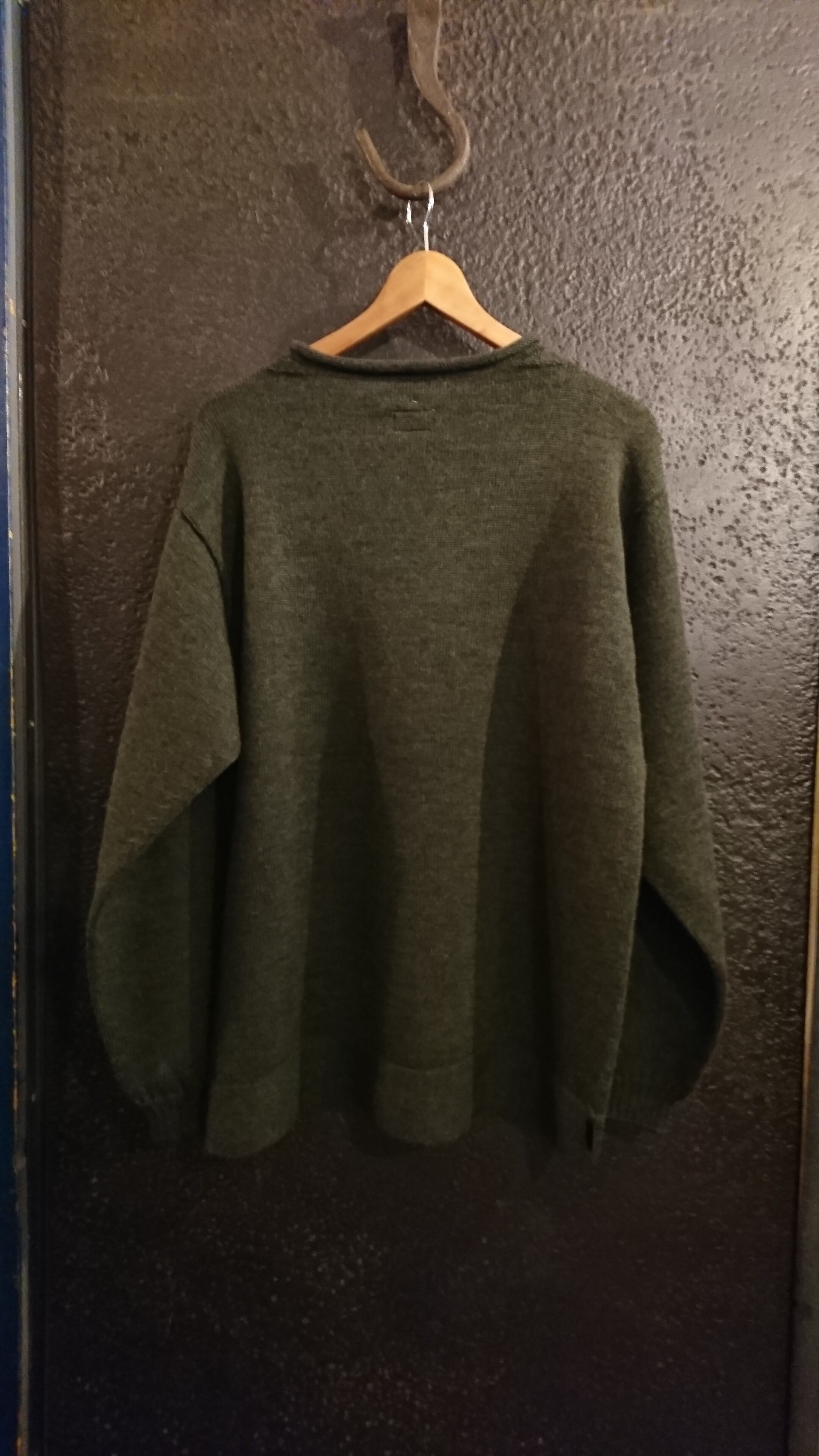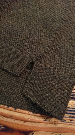 重量があり目が詰っていてプレーンな印象の編み目、糸にはブリティッシュウールのブラウン種という短毛のウールと南アメリカのウールをブレンドした糸をつかい度詰めで重量が出るように編み立てています。