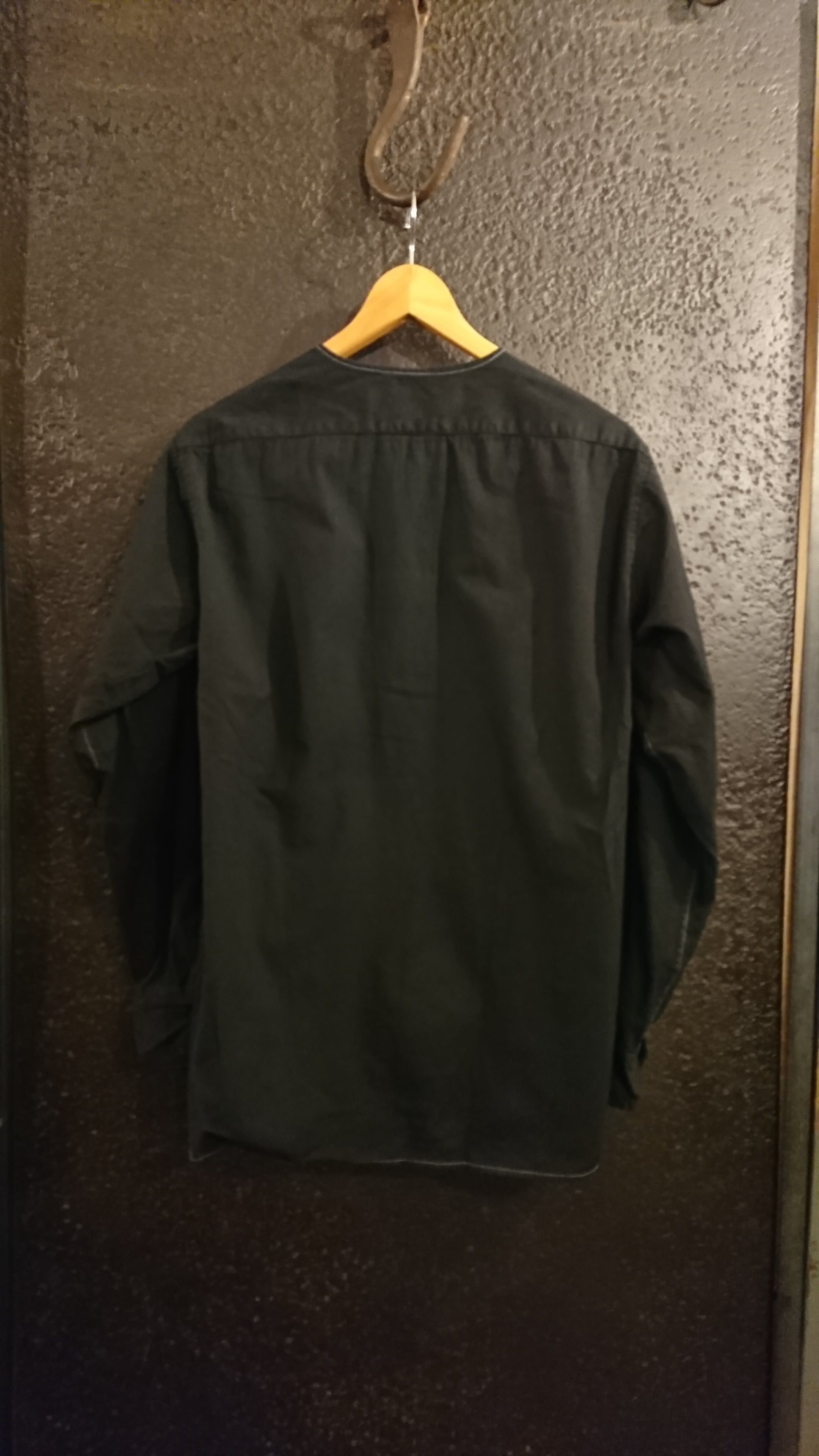クルーネックタイプで左肩部分にボタンがつきスリットが入ってるので脱ぎ着しやすくなってます。袖にはカフスが付きます。無駄を削ぎおとしたシンプルなデザイン。色々なスタイルに使っていただきたいシャツです。