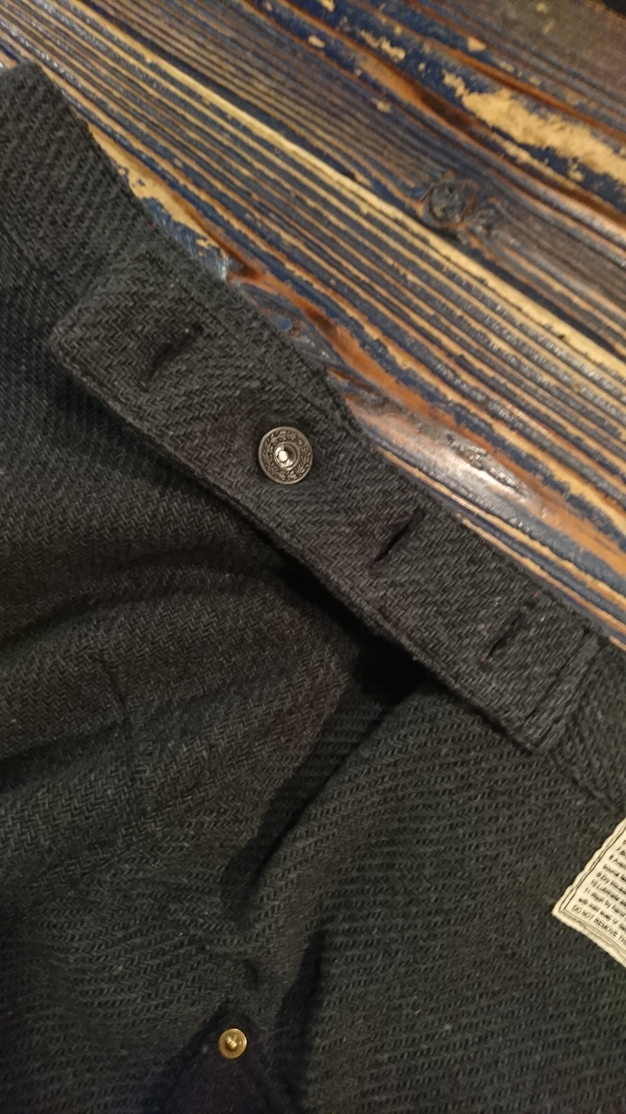 ベルトループはなくバックにつくボタン式のシンチでウエストサイズを調整。