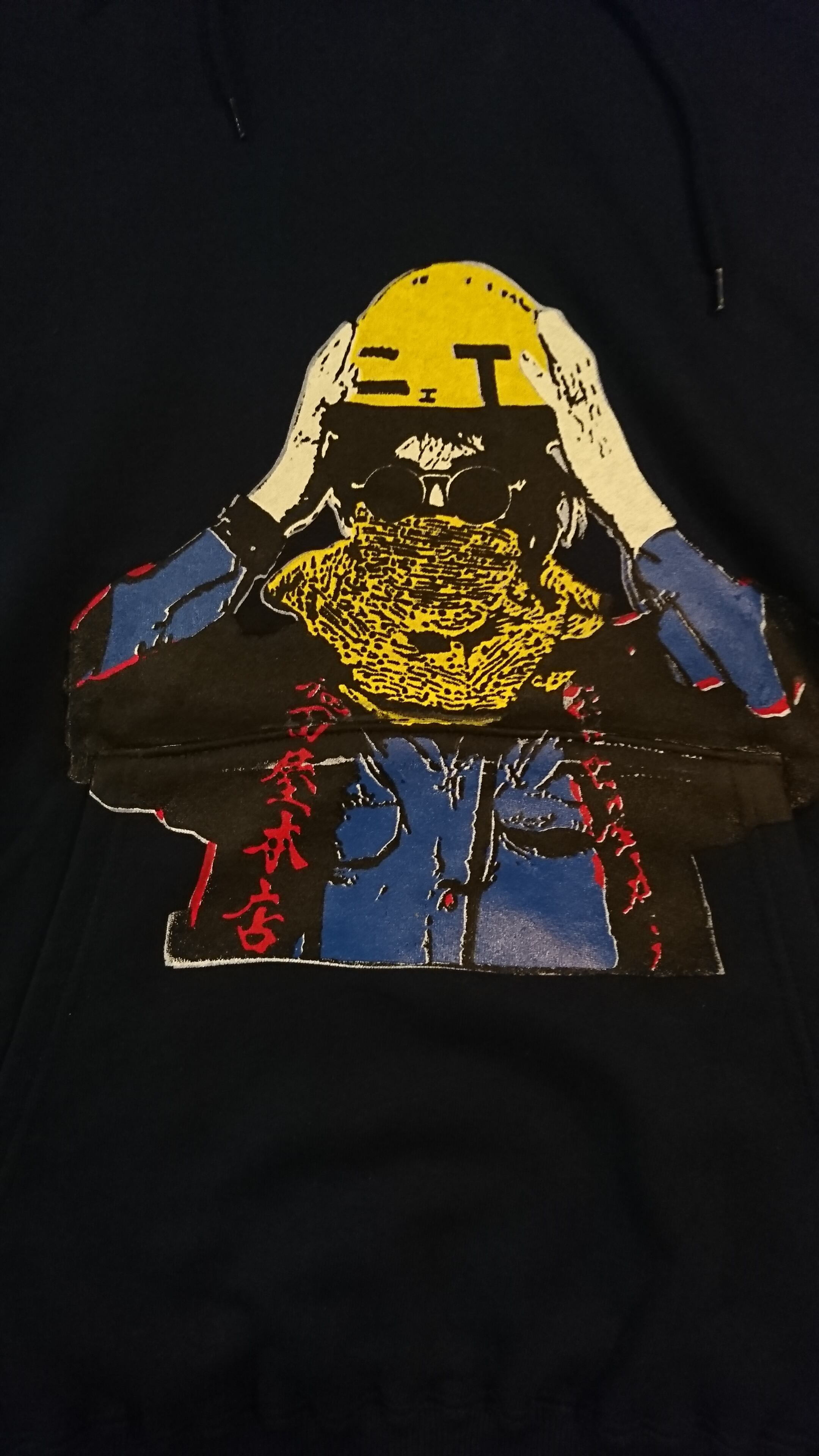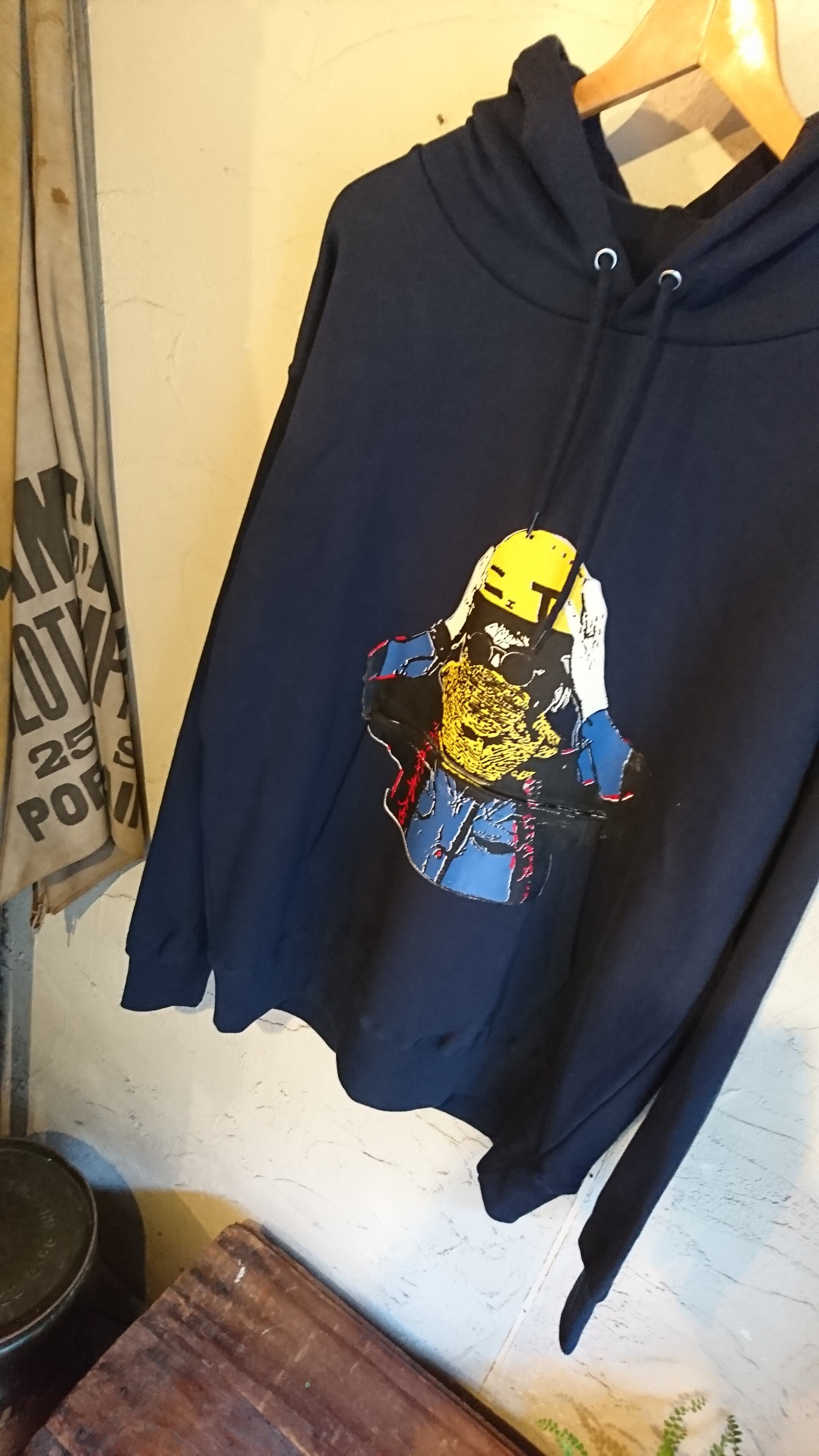 Tシャツと同じデザインをネイビーボディのフードスウェットに手刷りで表裏8版のプリント。