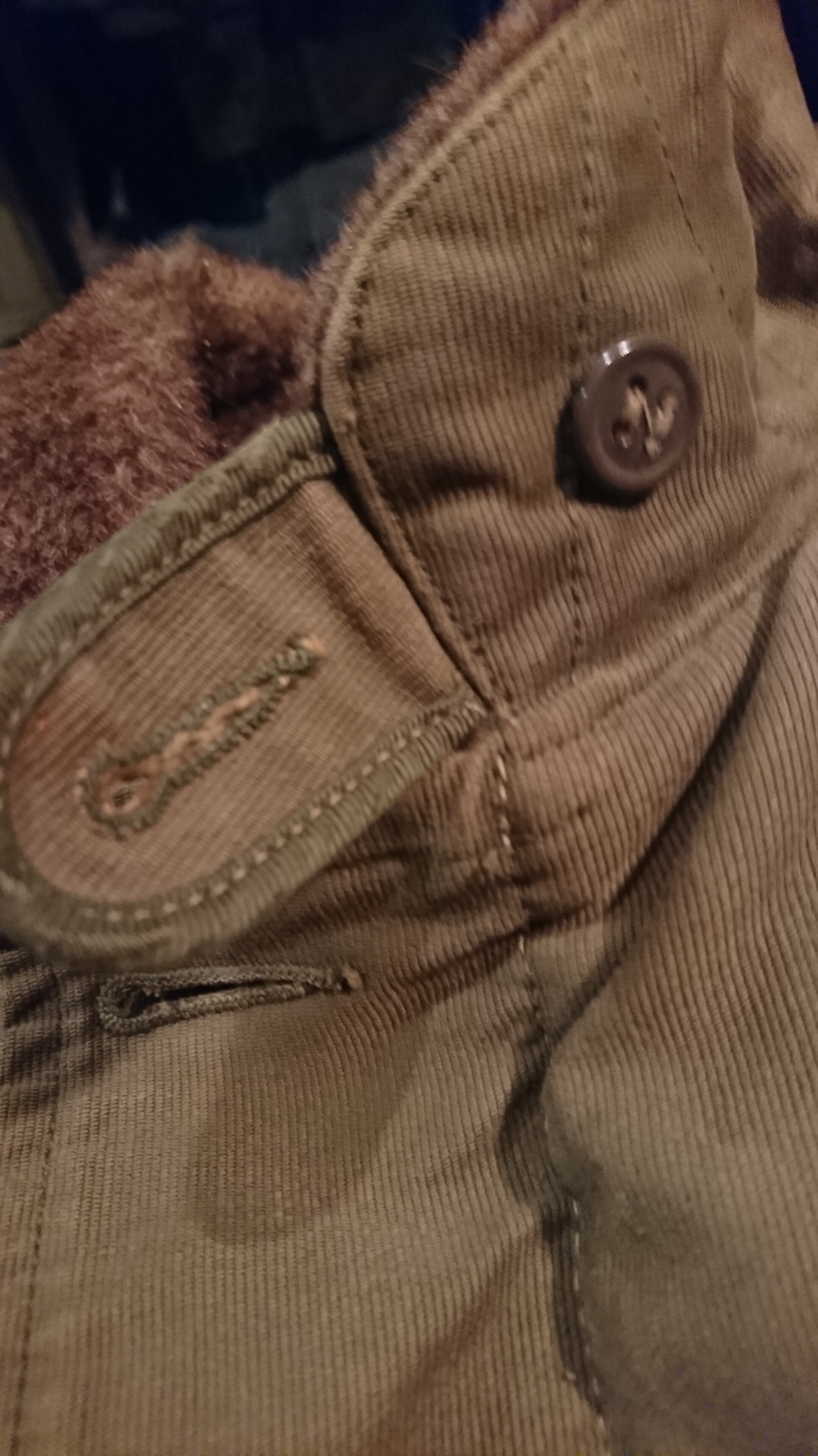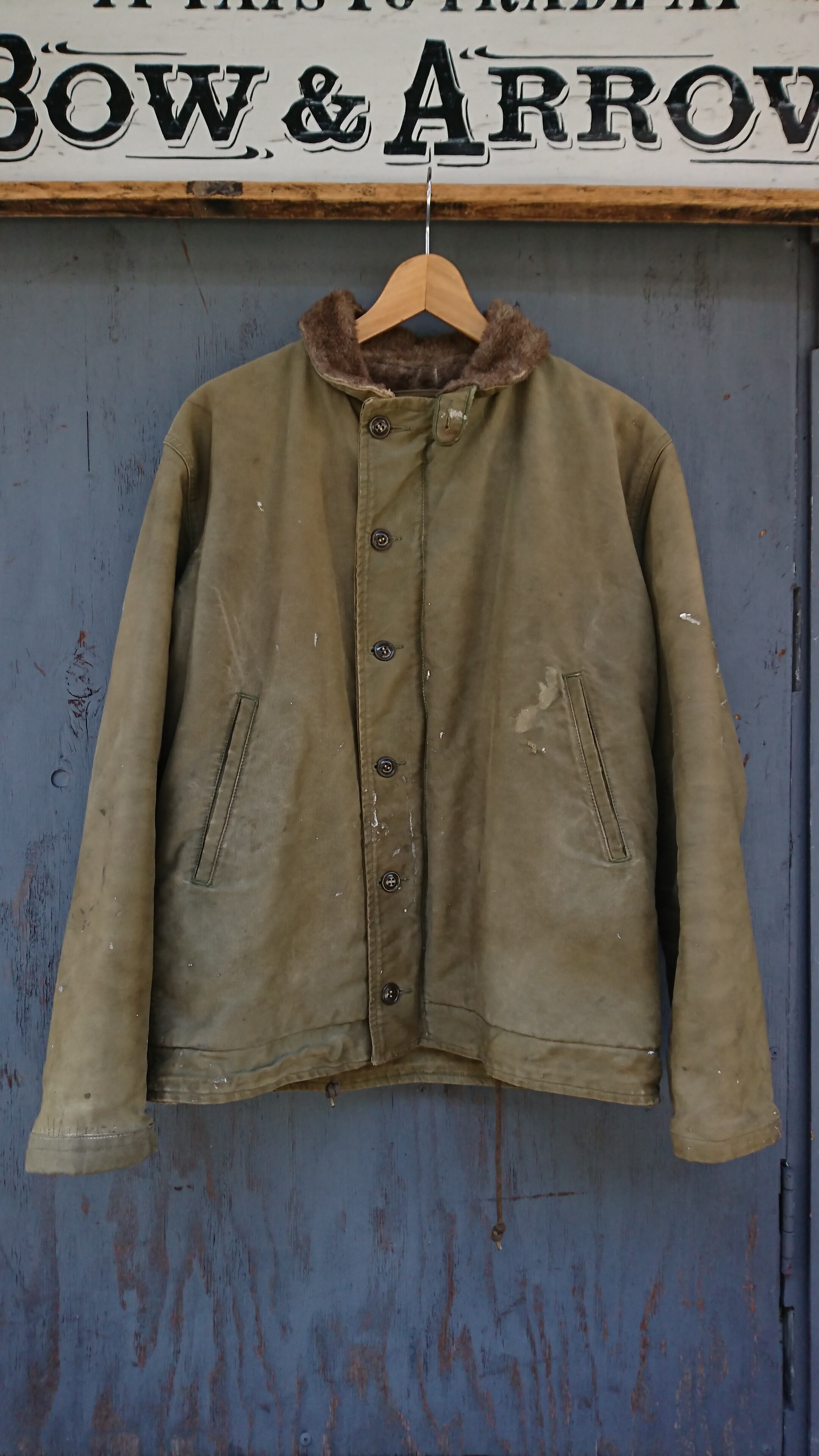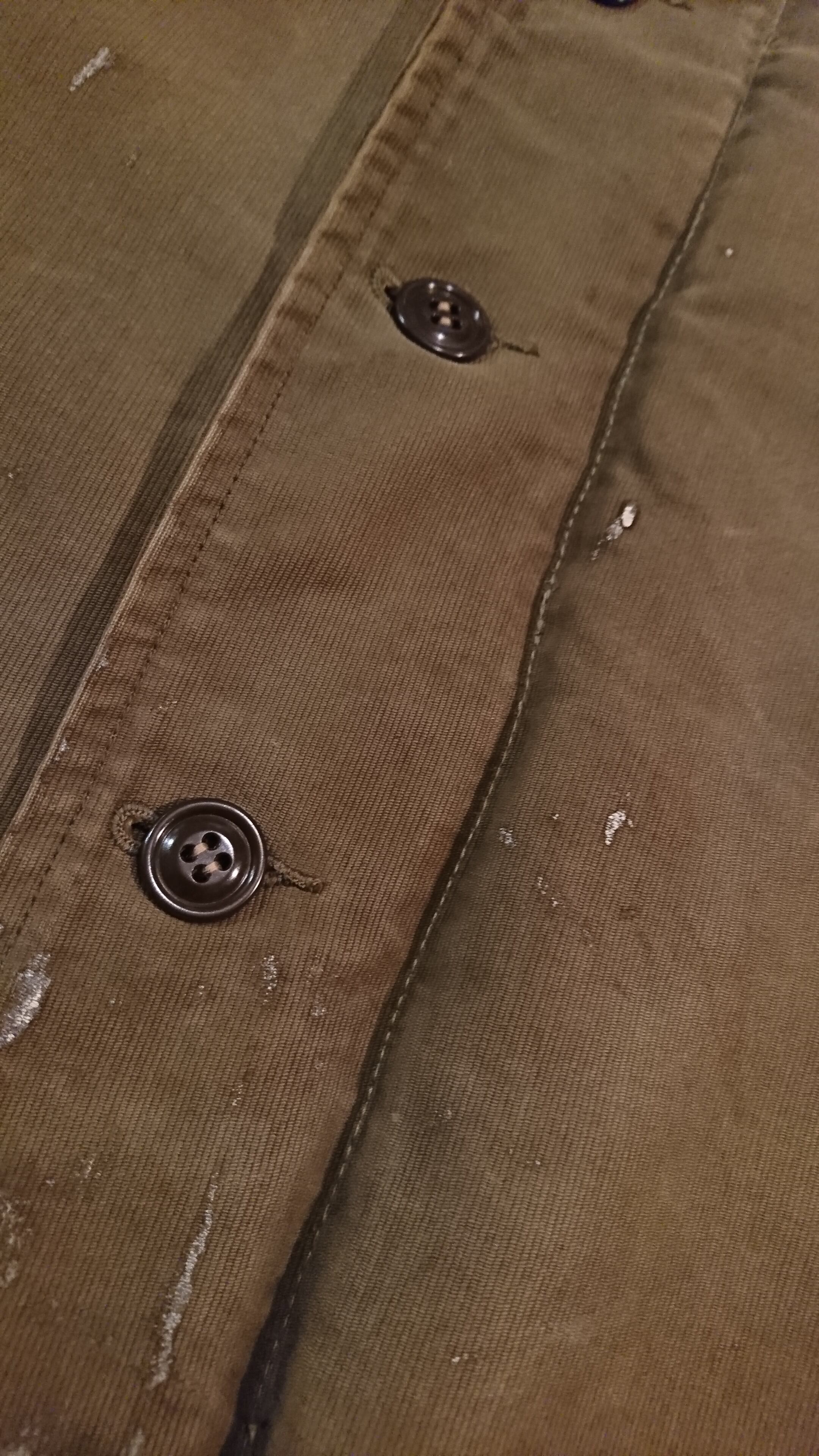 良いサイズ感。フロントのジッパーが交換されてるのと、右袖口にリペア、内側と袖、左ポケット横等に数ヶ所傷もありますが着用に問題はありません。全体的に汚れやペンキがとんだ見た目の雰囲気も抜群な1着。