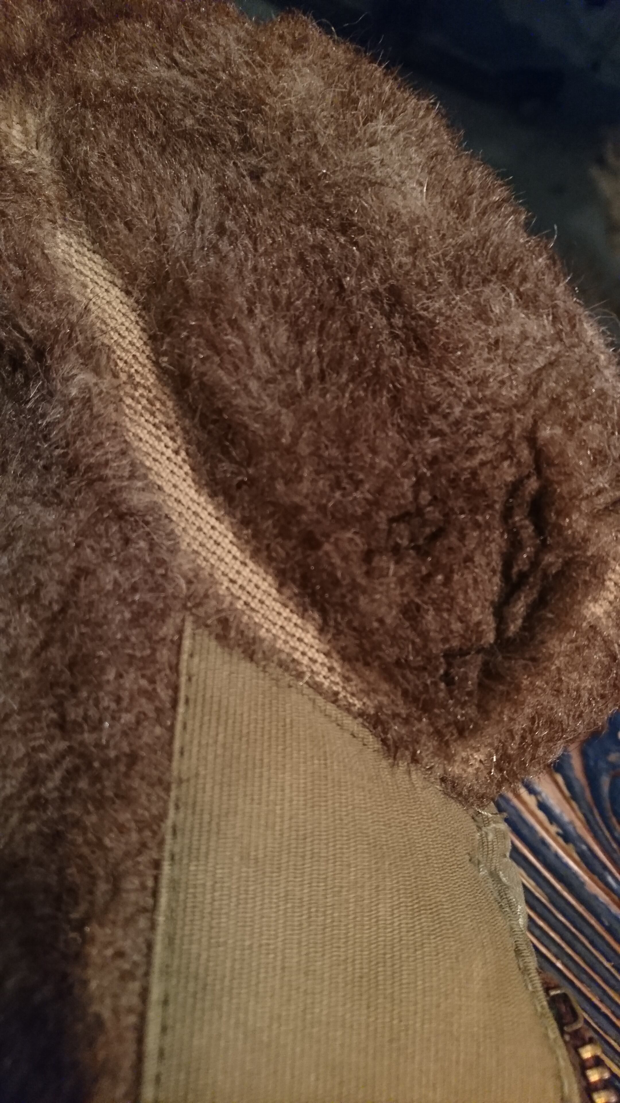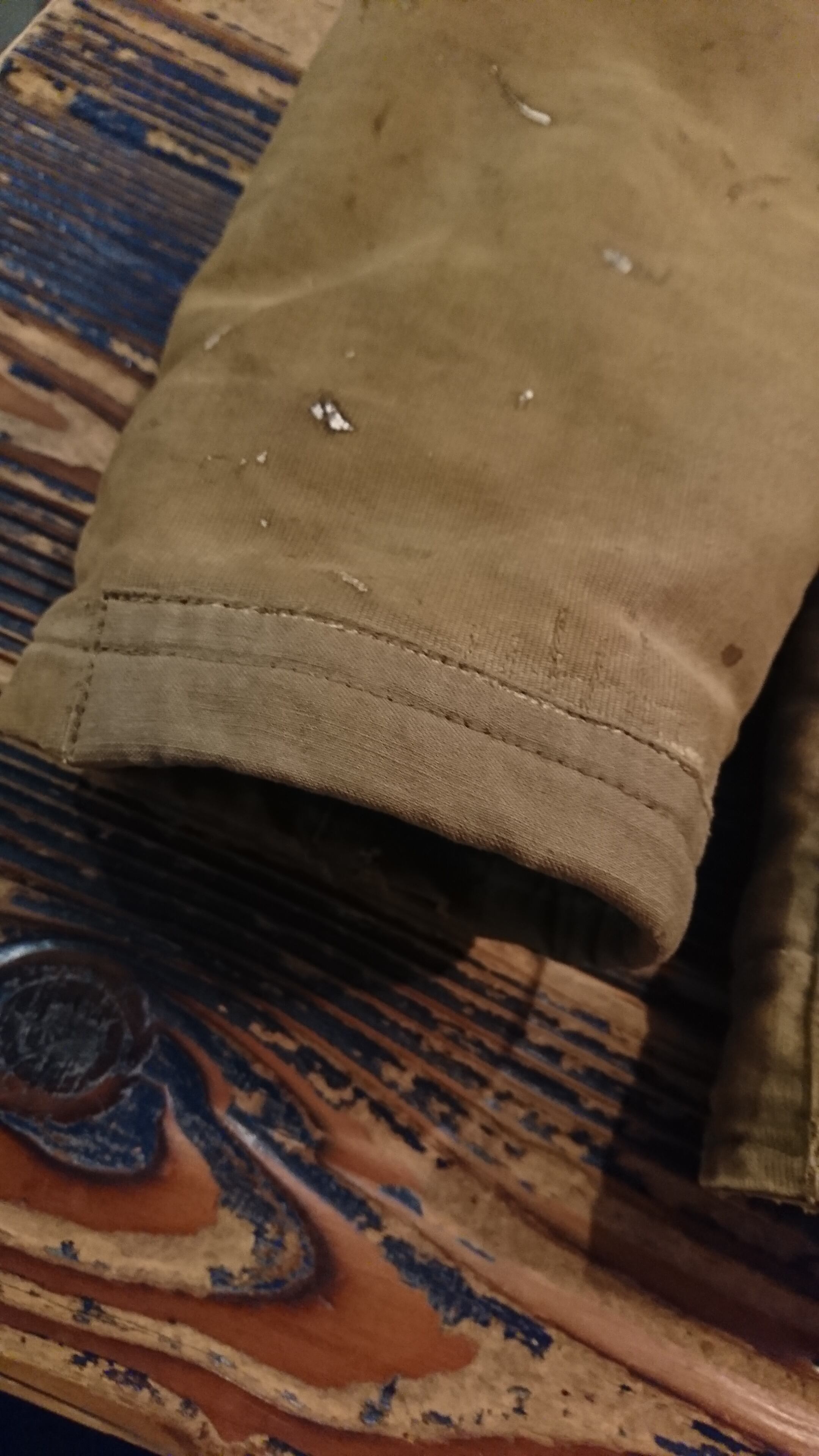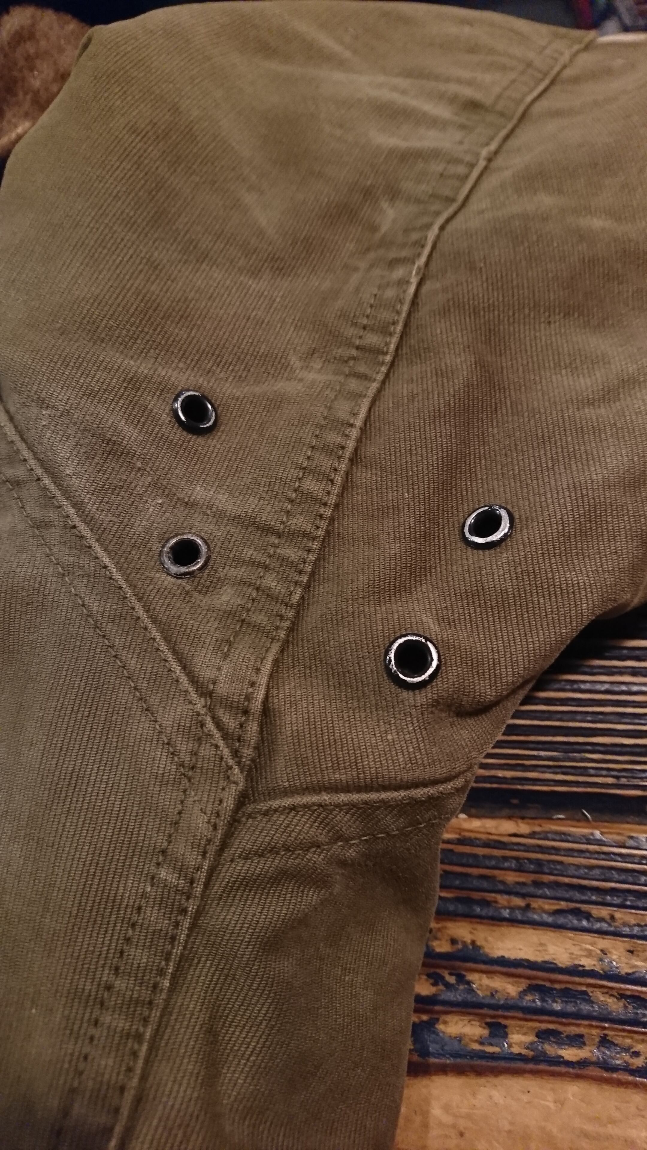 良いサイズ感。フロントのジッパーが交換されてるのと、右袖口にリペア、内側と袖、左ポケット横等に数ヶ所傷もありますが着用に問題はありません。全体的に汚れやペンキがとんだ見た目の雰囲気も抜群な1着。