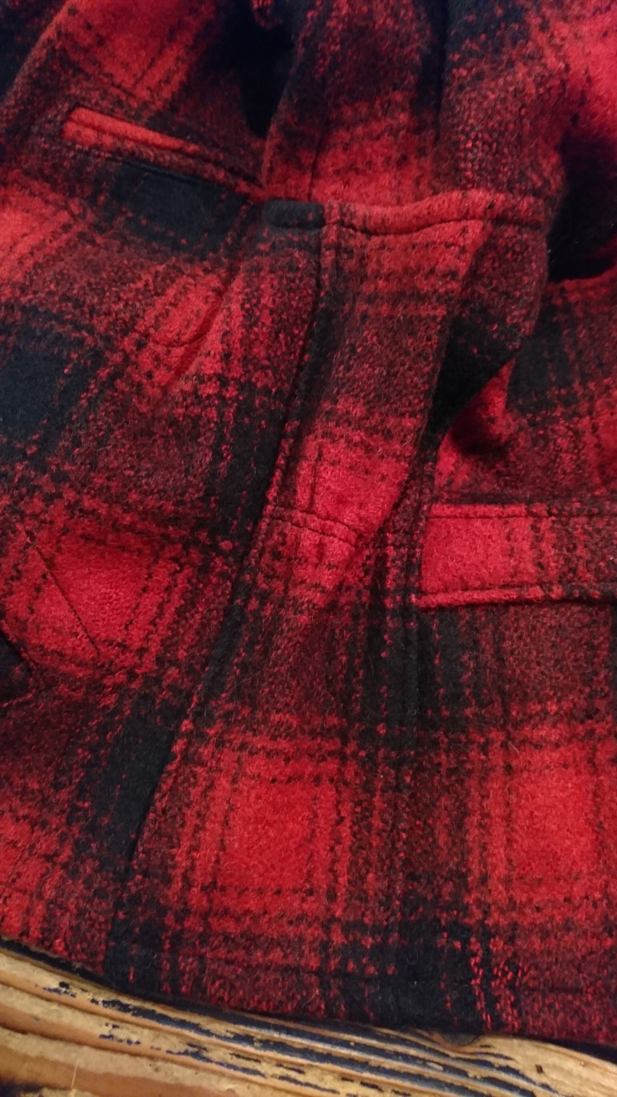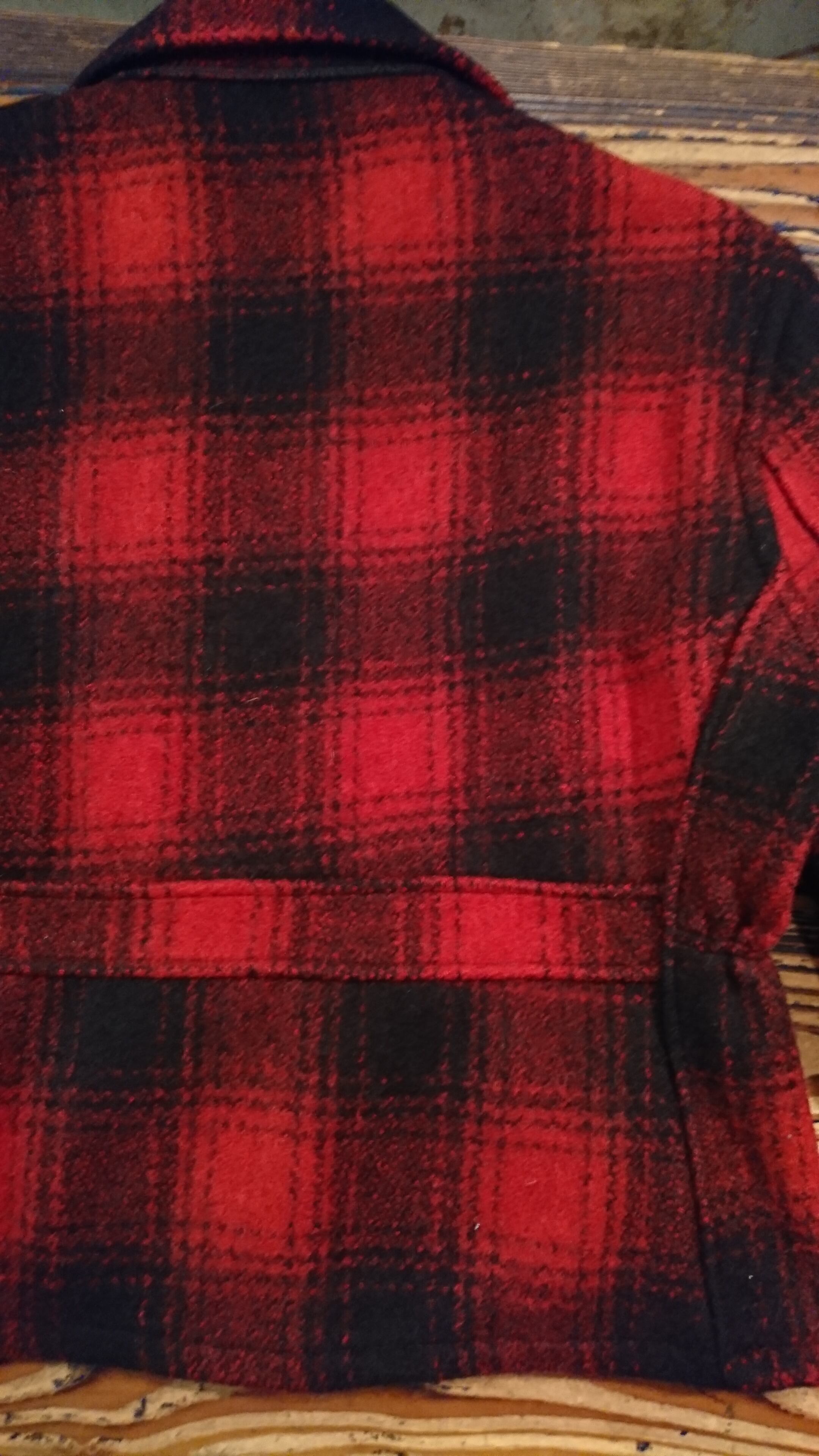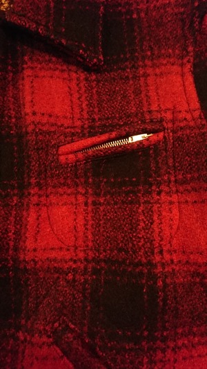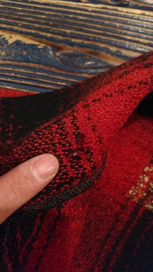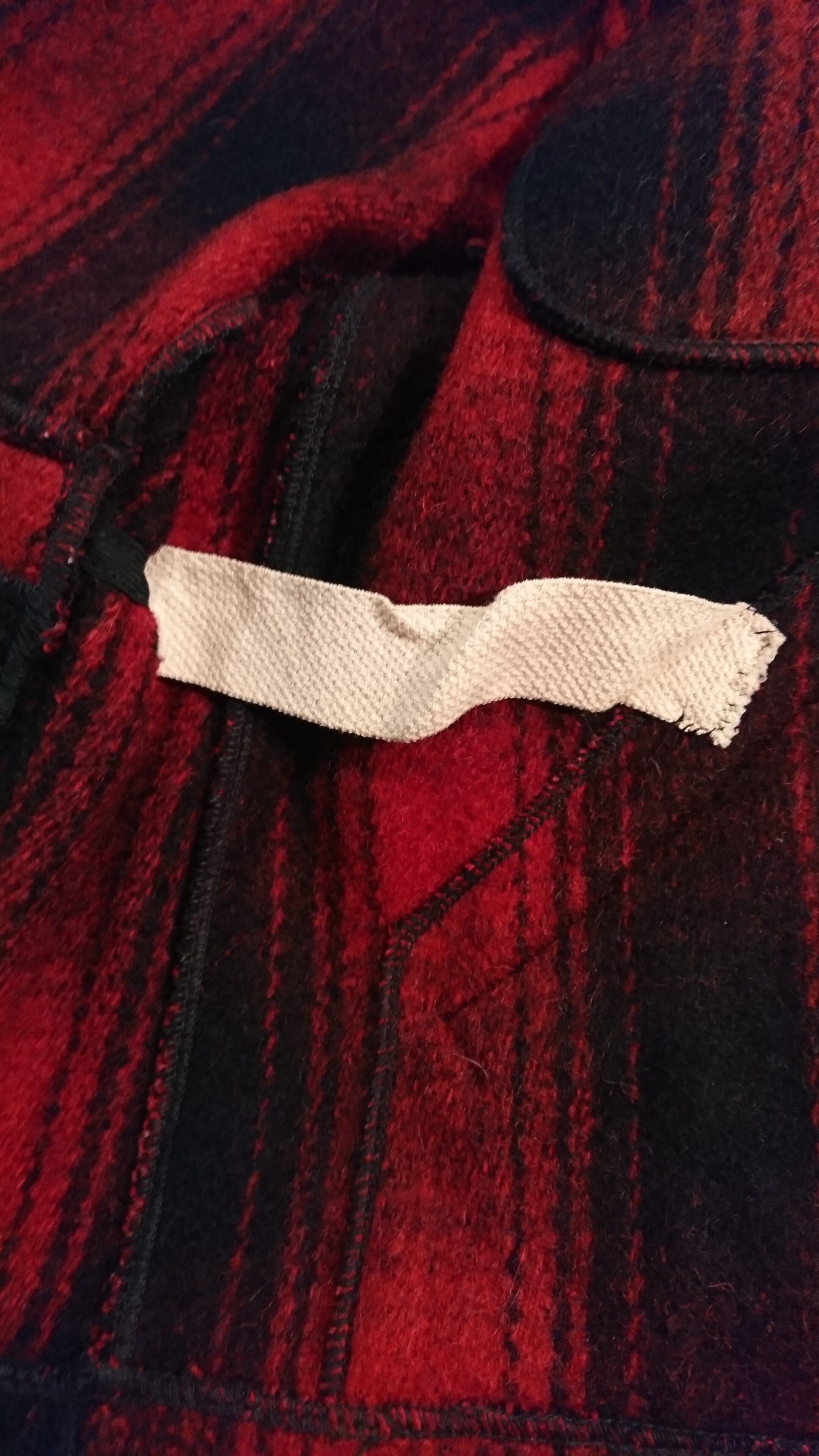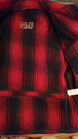 赤黒のチェックで裏地無し。腰部分にゴムが入っています。タグは欠損、襟部分に傷あり。