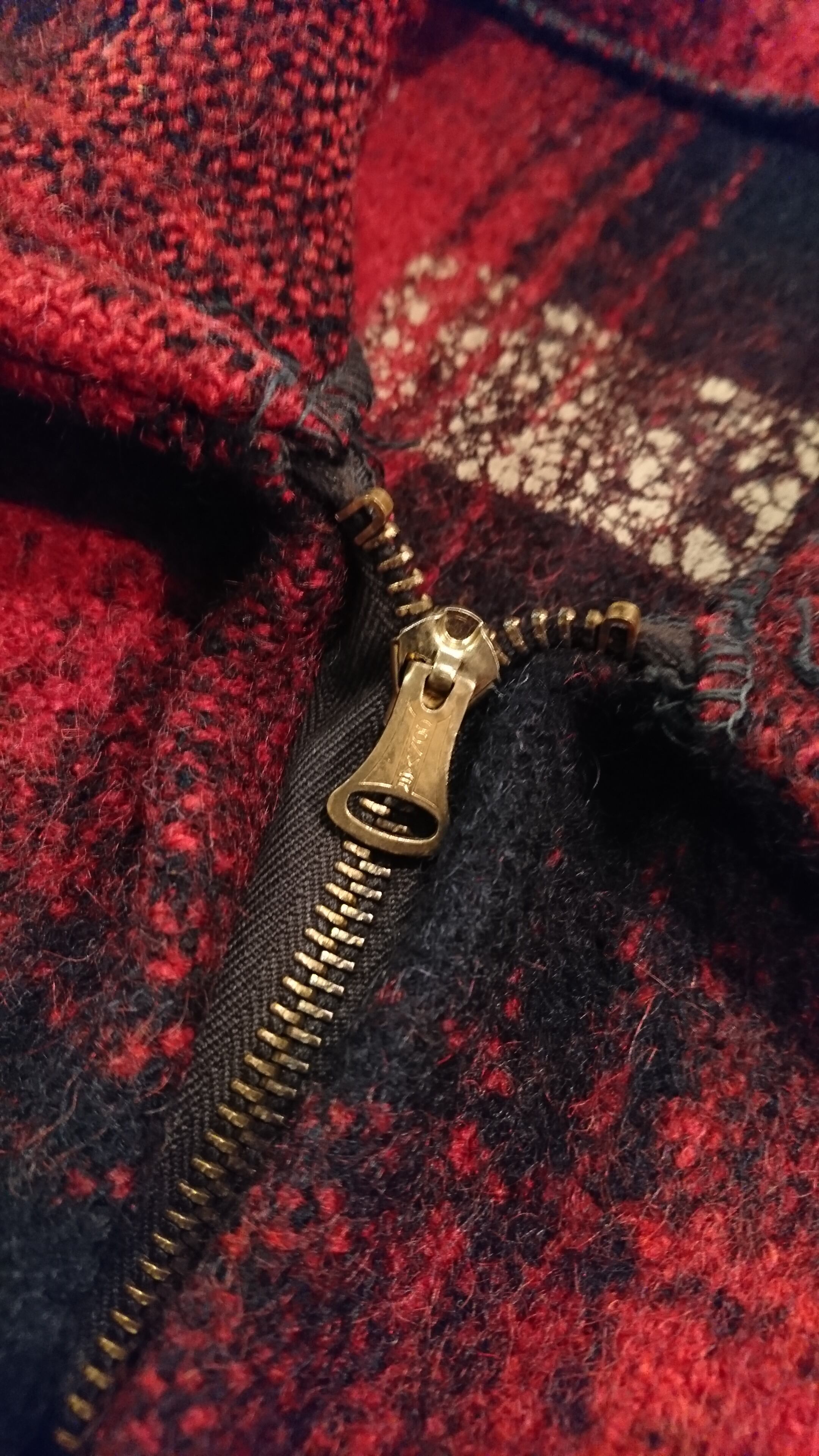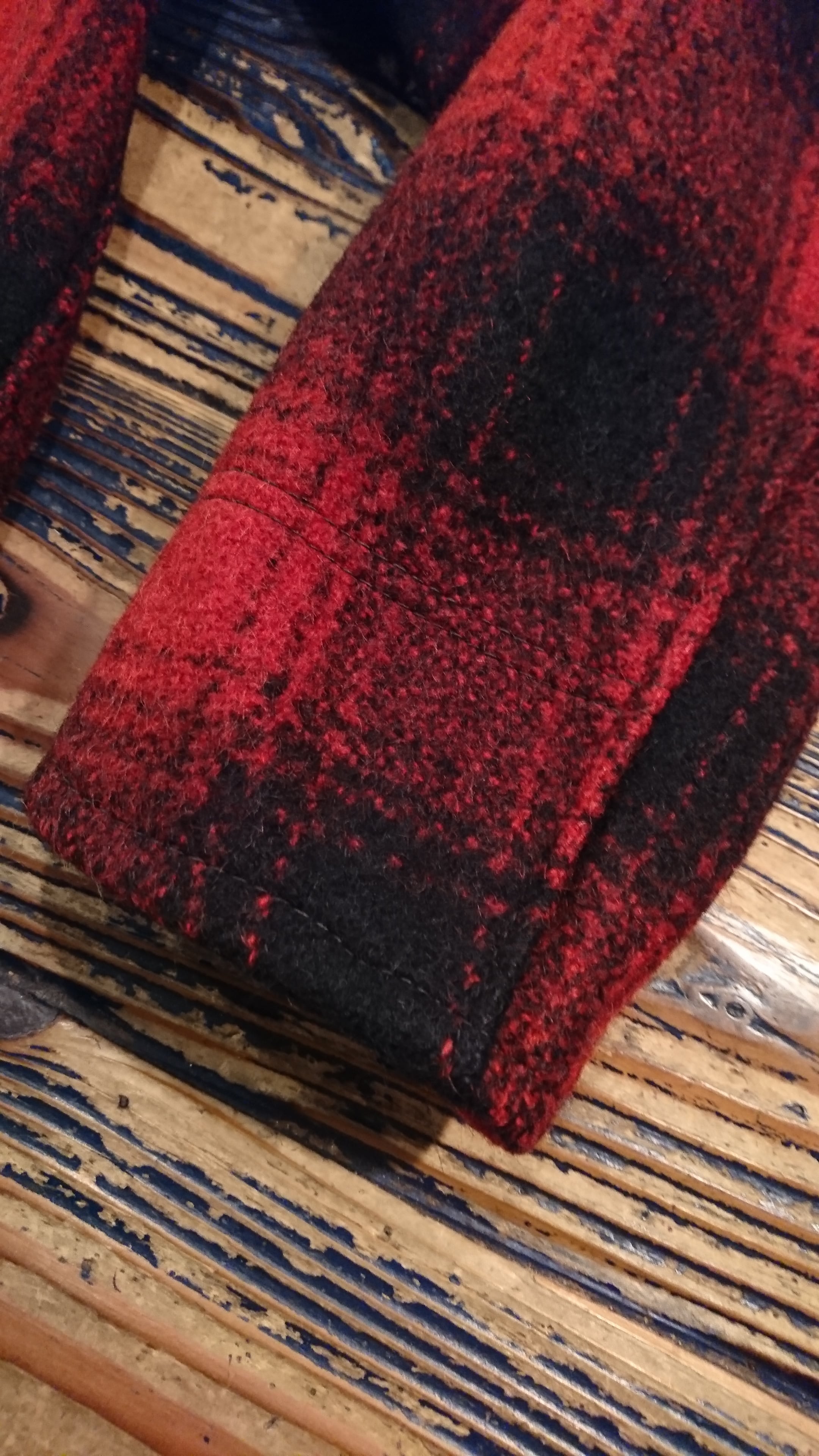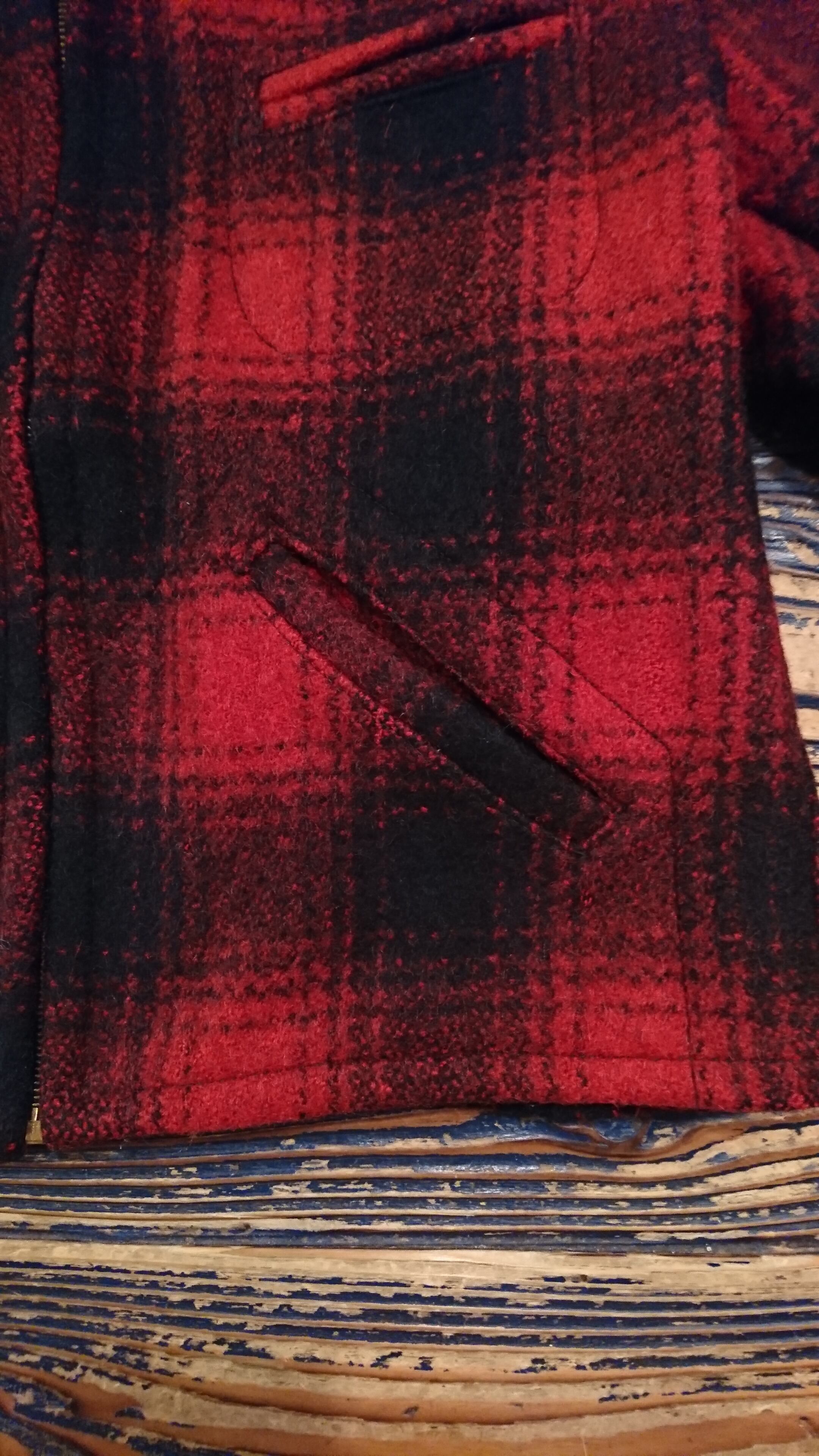 赤黒のチェックで裏地無し。腰部分にゴムが入っています。タグは欠損、襟部分に傷あり。