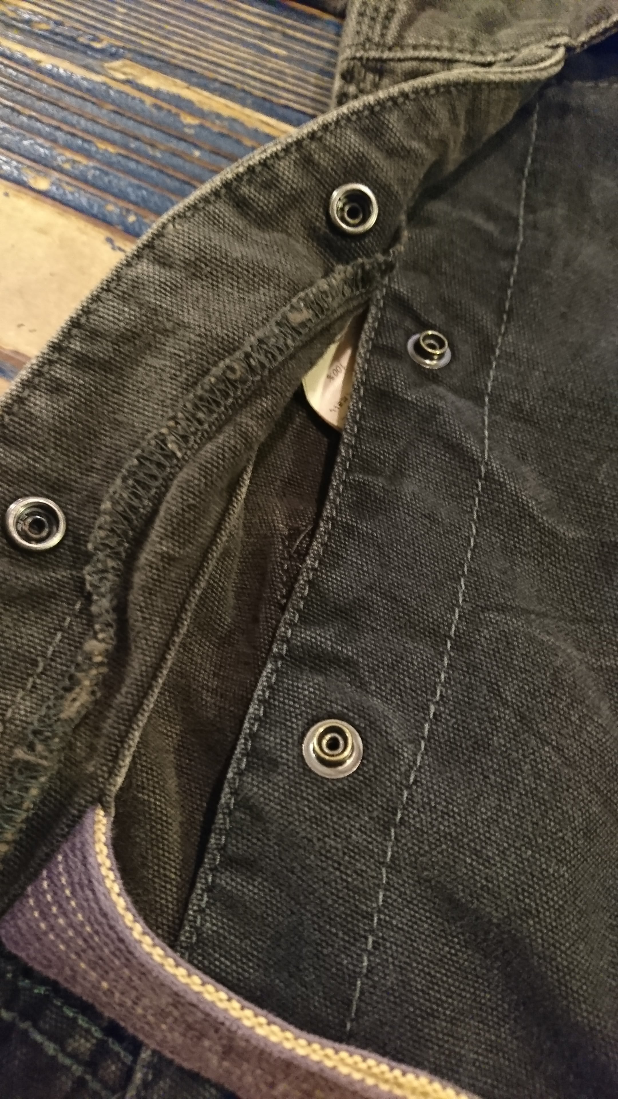 背中は色褪せたブラックと濃いブラックの2トーンで切り替えでスナップで取り外し可能なデザインになっています。外してインナーを見せて着るのも良いと思います。