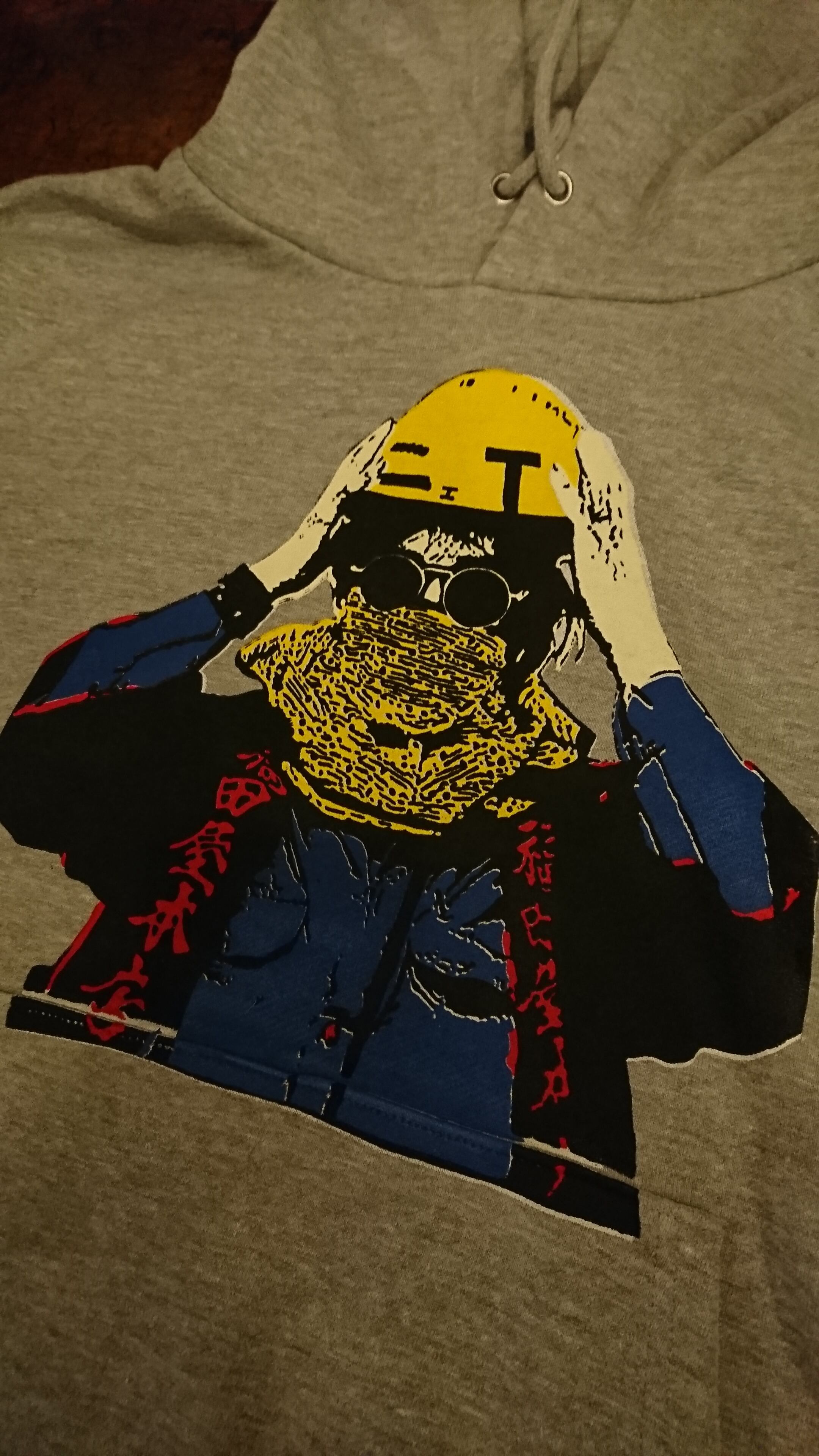 Tシャツと同じデザインをネイビーボディのフードスウェットに手刷りで表裏8版のプリント。