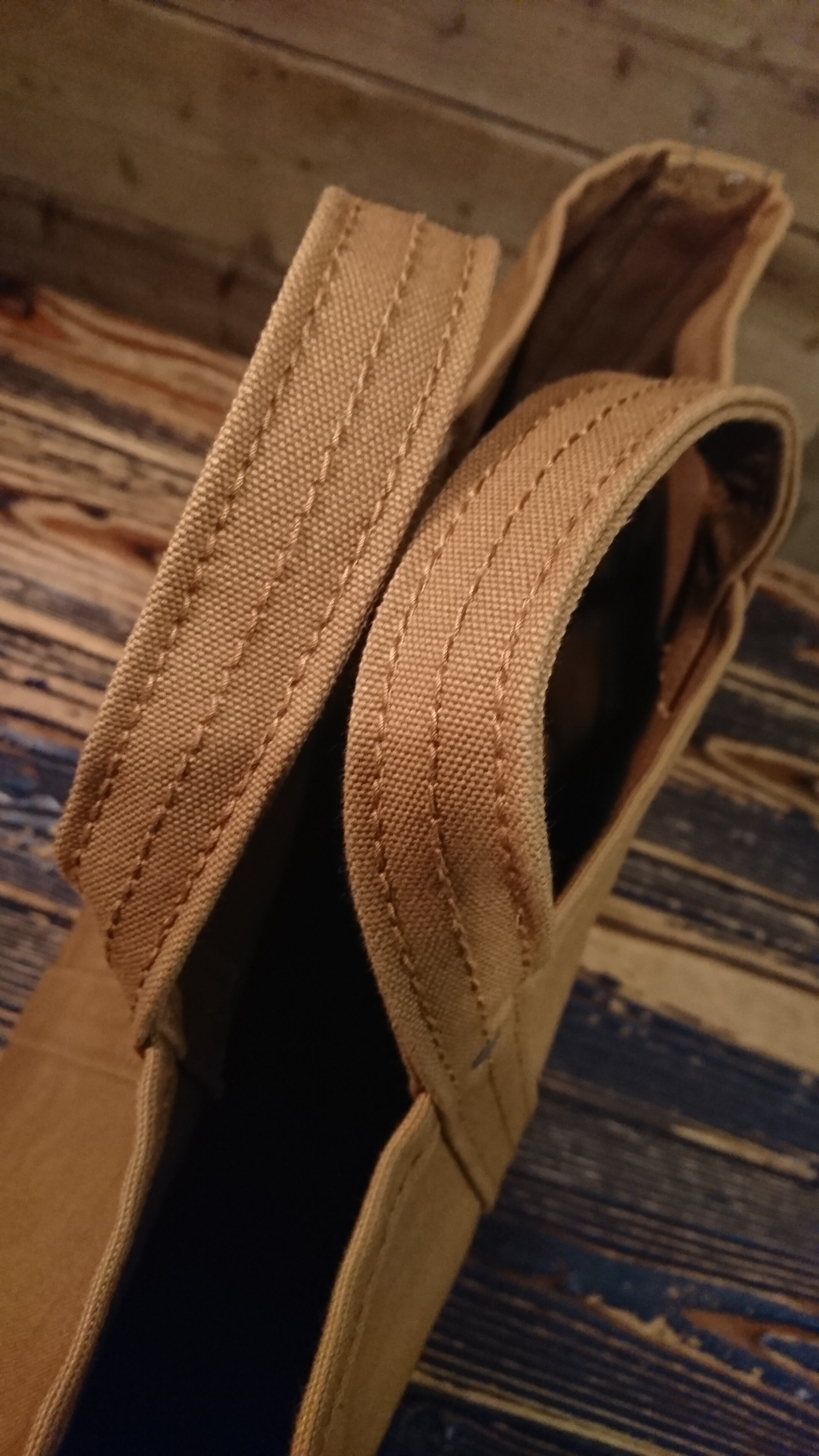 使われるオリジナルキャンバスは硬く、生地にしっかりとした張りを与え、そのまま自立できるほどのバッグになってます。
